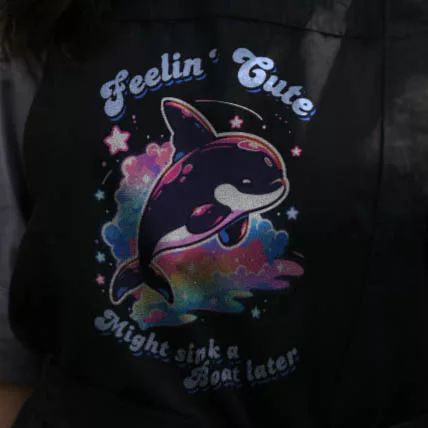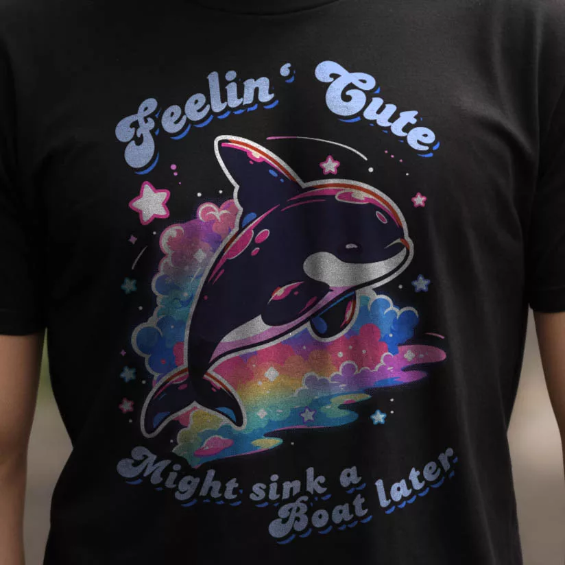 Der Spruch „Feelin‘ Cute – Might sink a Boat later“ fügt eine überraschende Wendung hinzu. Er spielt humorvoll darauf an, dass Orcas tatsächlich die Fähigkeit haben, Boote zum Kentern zu bringen, wenn sie es wollen. Dieser Witz verleiht dem Design eine einzigartige Note und macht es zu einem Gesprächsthema.