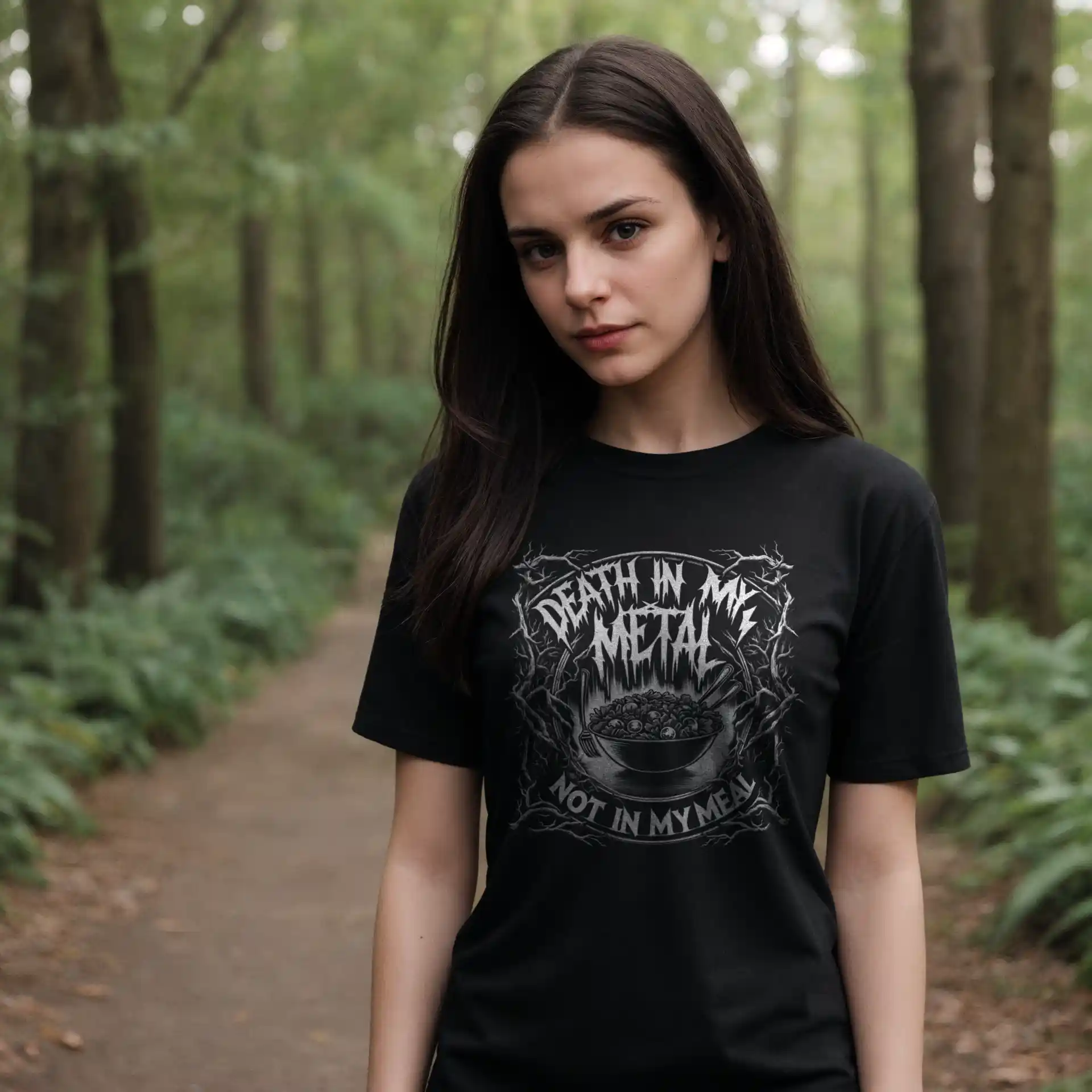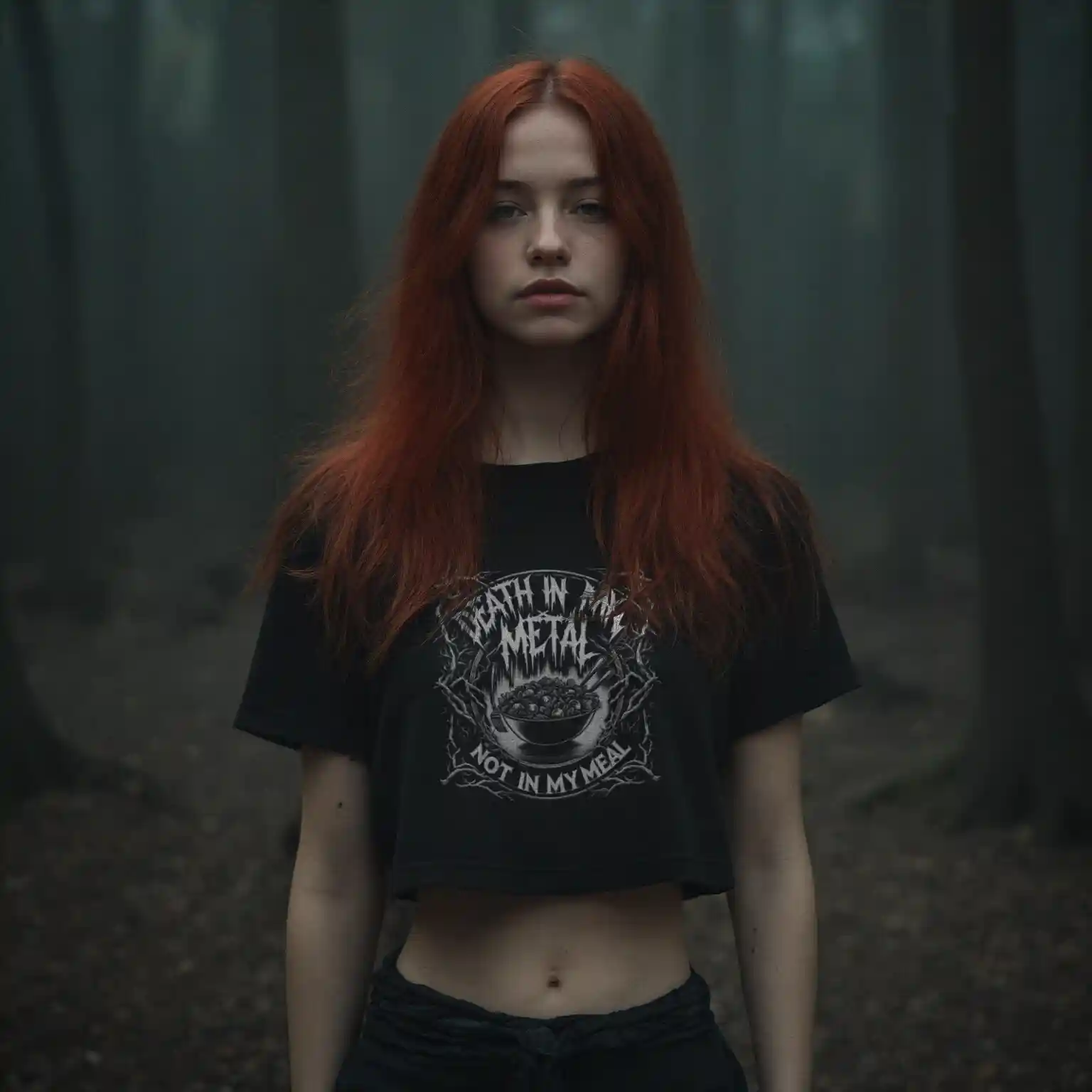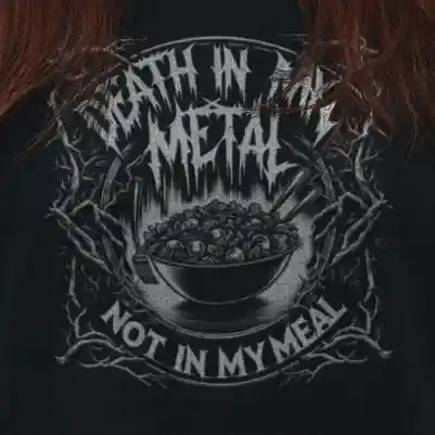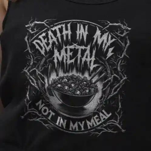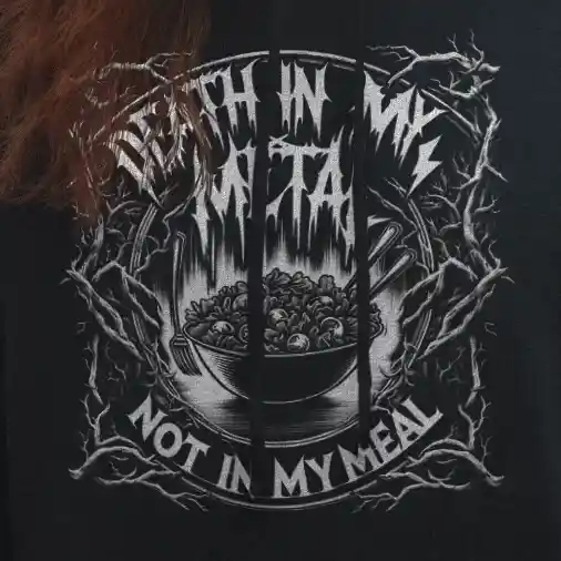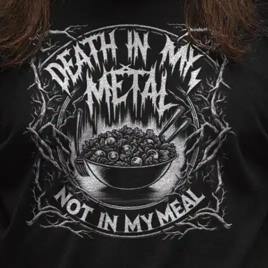 Die düstere Ästhetik, angelehnt an klassische Death Metal-Designs, macht dieses Crop-Top zu einem Must-Have für Fans von Bands wie Mayhem, Behemoth und Cannibal Corpse. Es ist nicht nur ein Kleidungsstück, sondern ein Manifest, das sagt: „In meiner Musik mag es Death geben, aber in meinem Essen nicht.“ Ideal für diejenigen, die den Blast Beat lieben, aber beim Essen keine Kompromisse eingehen.