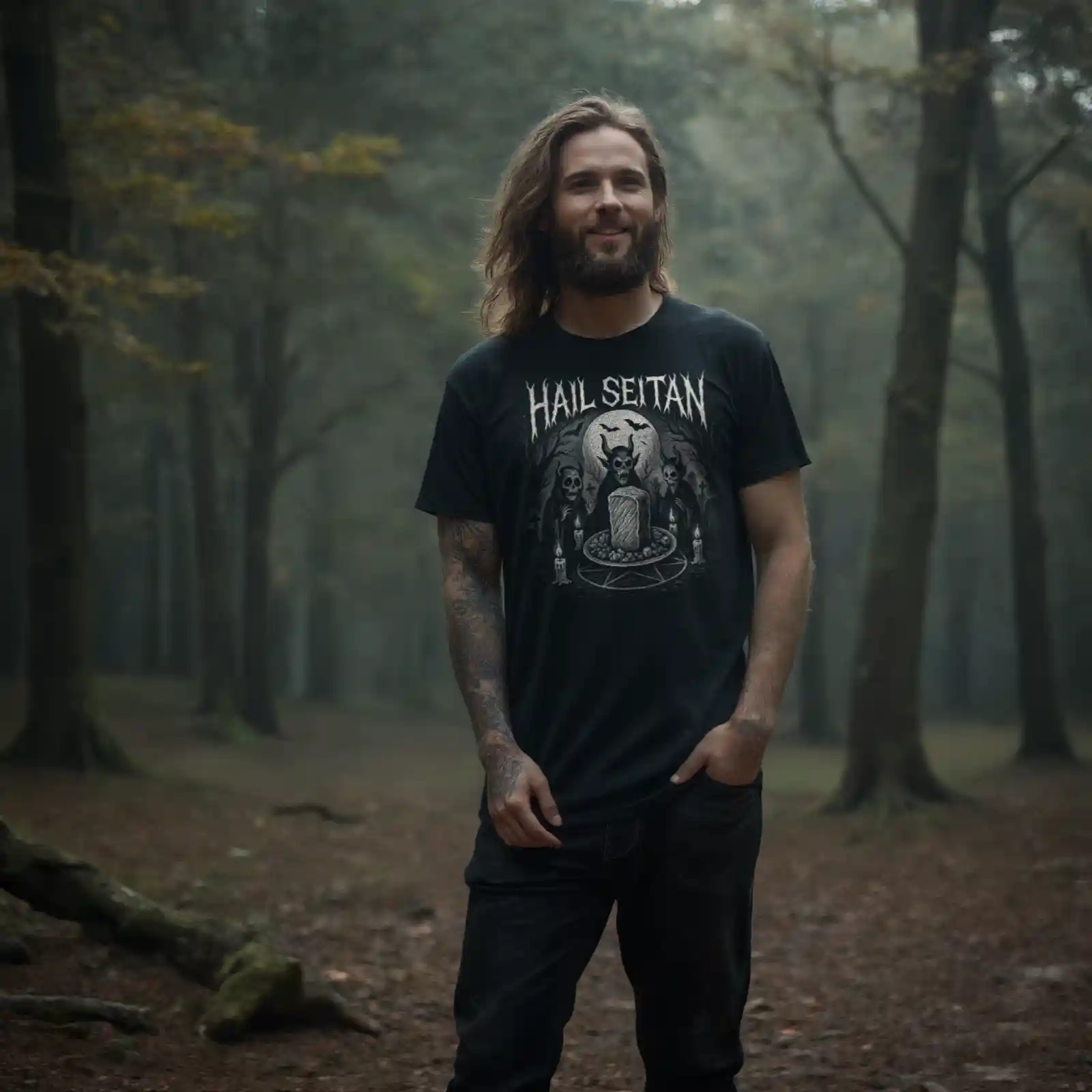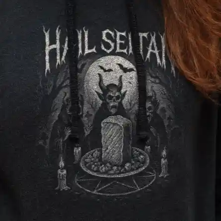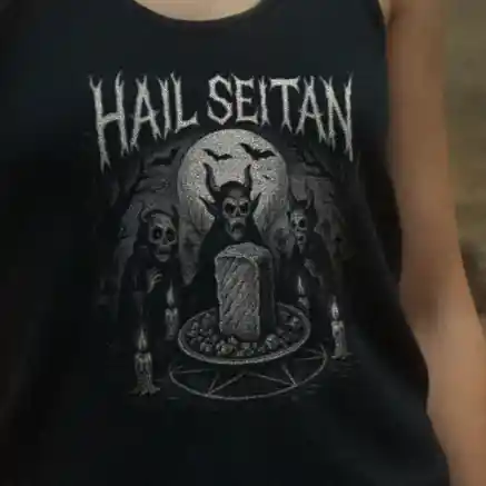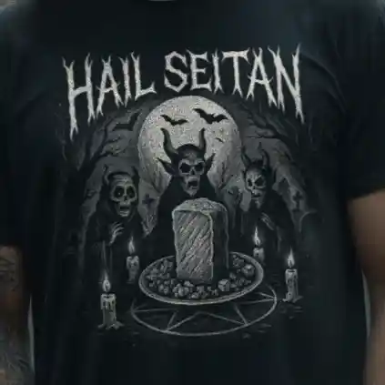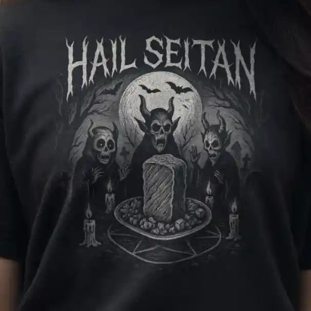 Das Hail Seitan (Halloween) Crop-Top ist die böse Antwort auf sommerliche Mode. Mit bauchfreiem Schnitt und düsterem Black-Metal-Design zeigt es Dämonen, ein Pentagramm und einen Seitanblock, der wie ein Grabstein wirkt. Darüber thront der Schriftzug Hail Seitan – eine klare Kampfansage an die Dunkelheit und gleichzeitig ein humorvolles Statement für veganen Lifestyle.