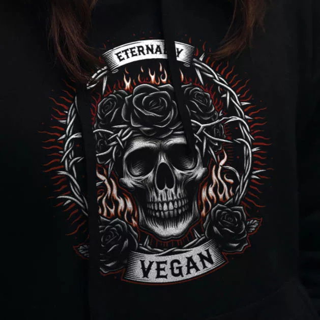 Das „Eternally Vegan“ Tank-Top für Damen ist ein echtes Fashion-Statement für alle, die ihren veganen Lebensstil mit Stolz zeigen möchten. Inspiriert von den kühnen Designs Ed Hardys, kombiniert dieses Tank-Top die Ästhetik des rebellischen Kunststils mit einer tiefgründigen Botschaft. Der im Zentrum stehende Schädel, umgeben von lebhaften Rosen und Flammen, symbolisiert die Leidenschaft und Beständigkeit hinter der Entscheidung, vegan zu leben.
