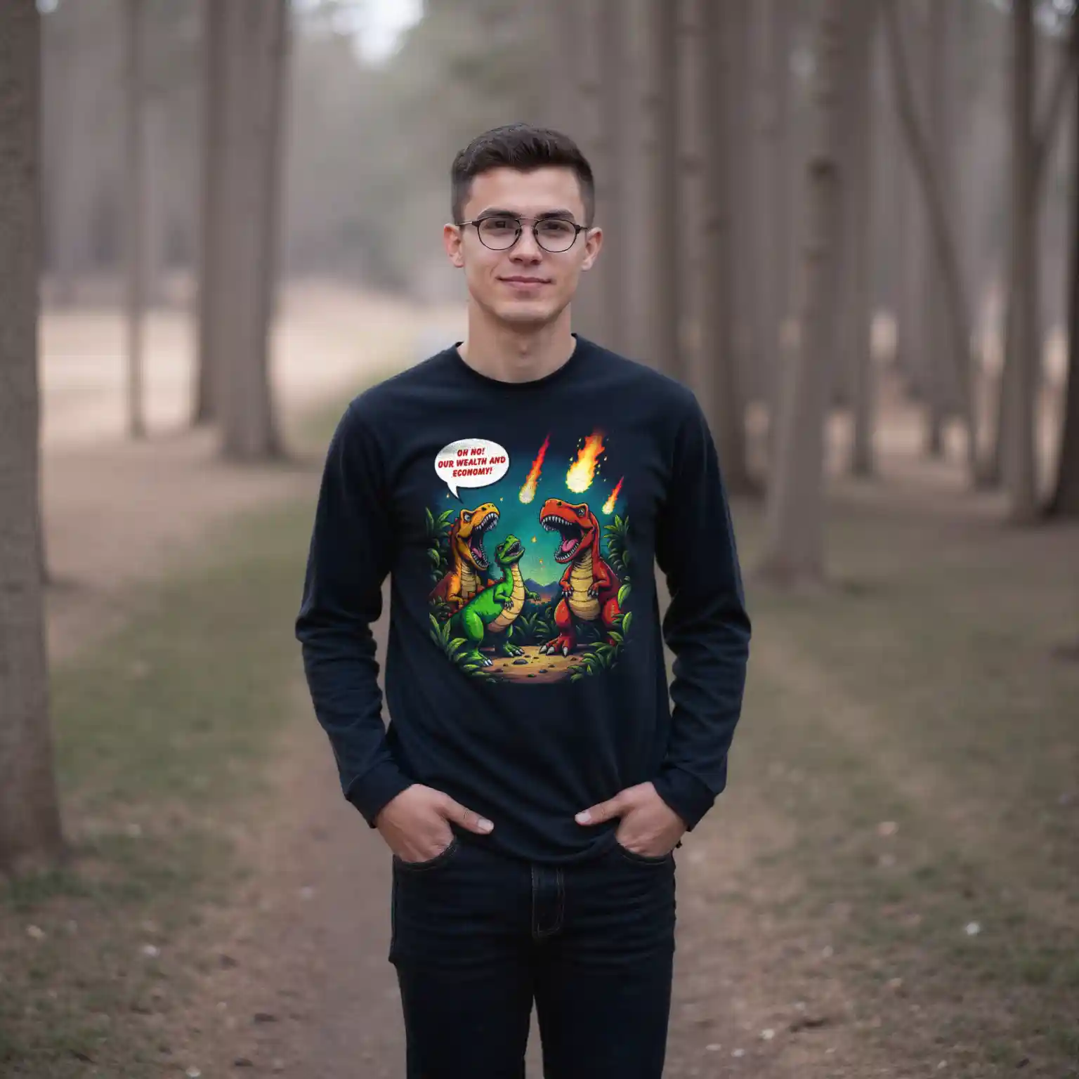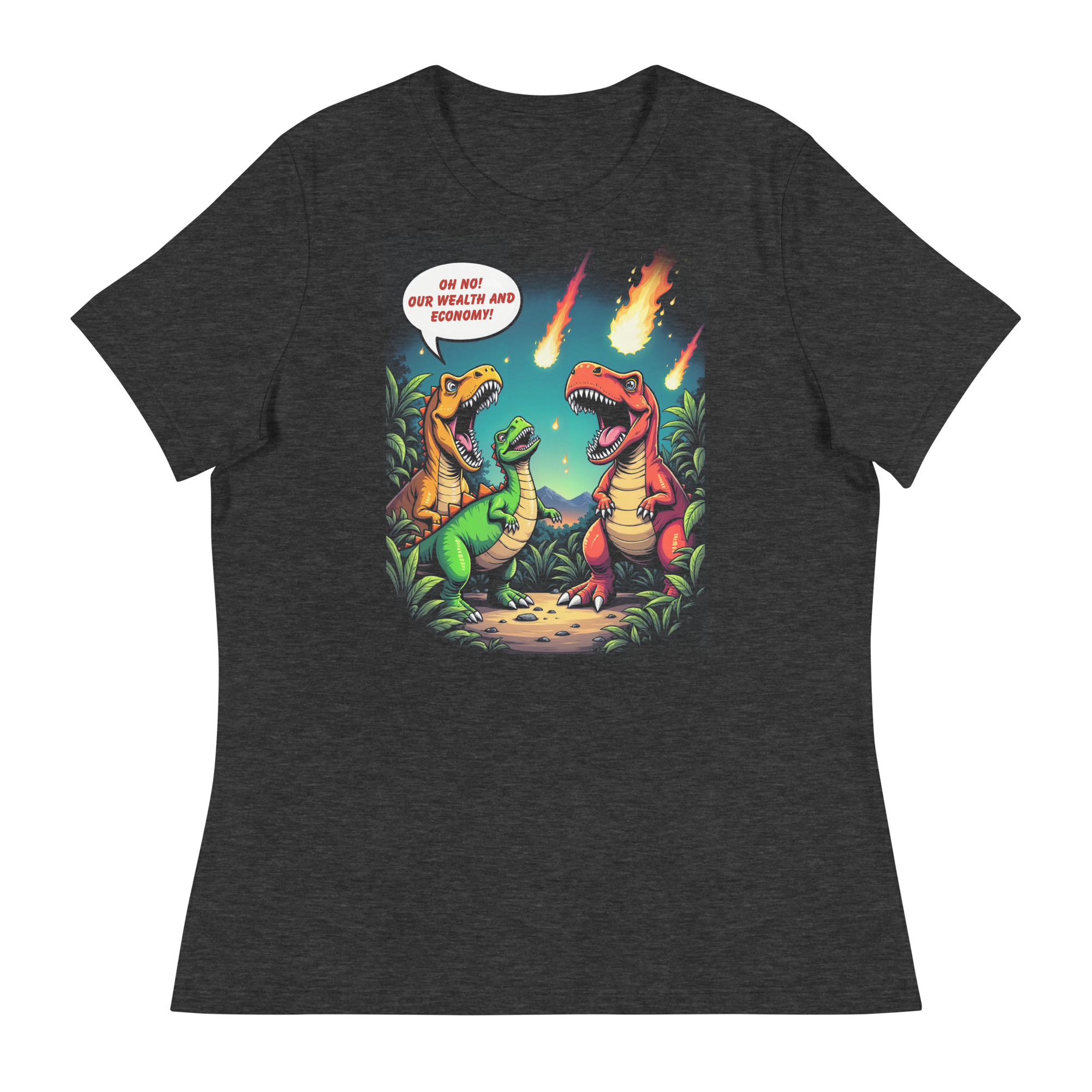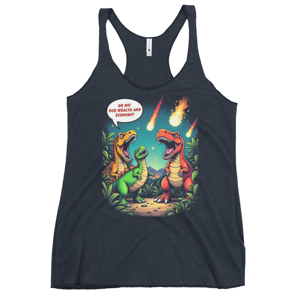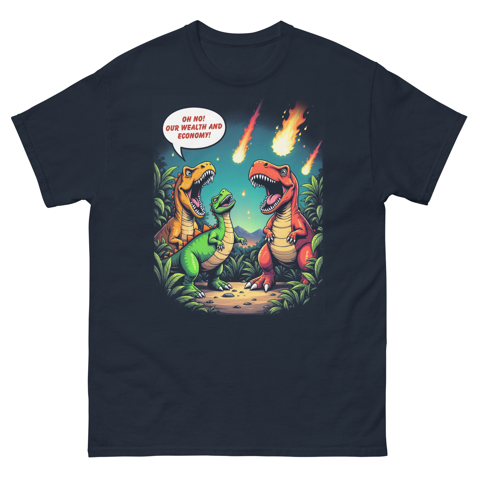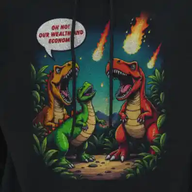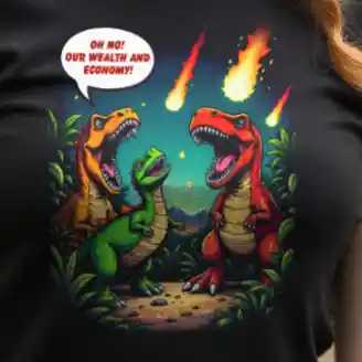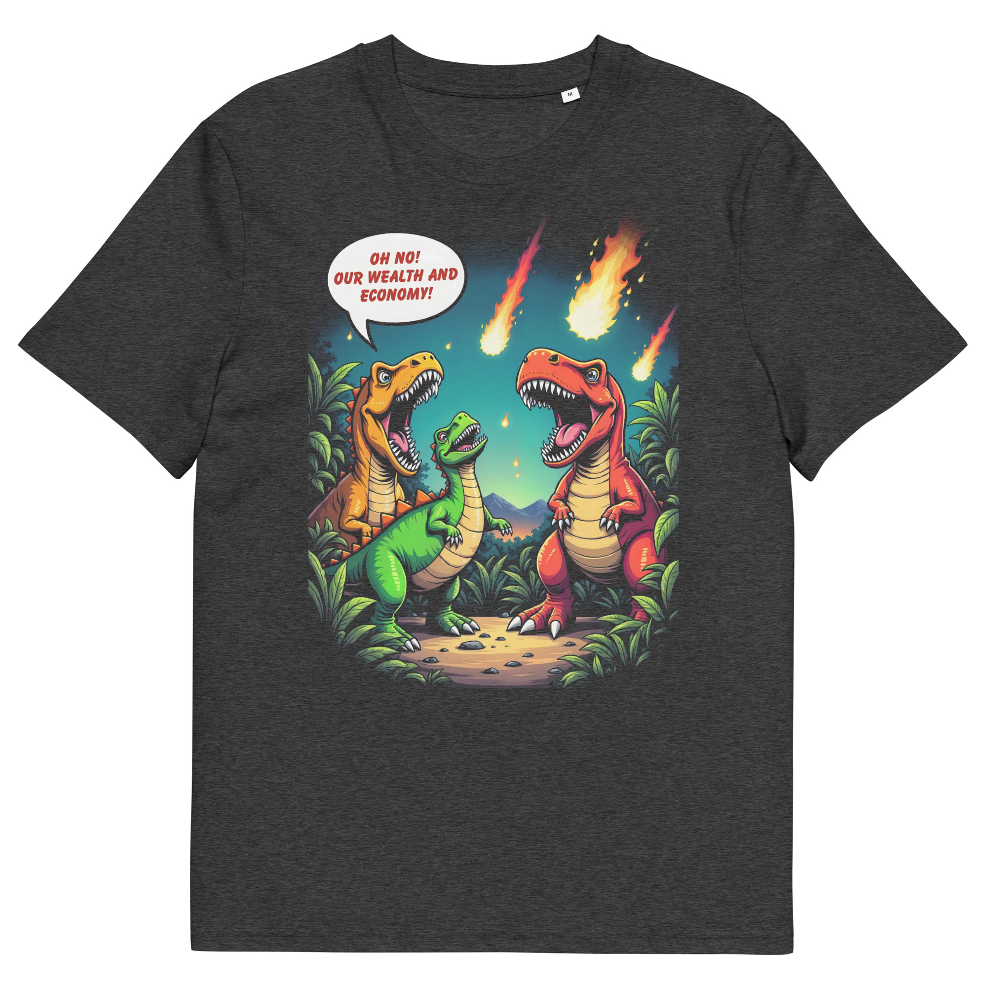 Das Unisex Bio T-Shirt „Economic Dinosaurs“ kombiniert humorvolles Design mit einer kraftvollen gesellschaftskritischen Botschaft. Das Motiv zeigt Dinosaurier, die angesichts heranrasender Kometen weniger um ihr Überleben als vielmehr um „Wohlstand und Wirtschaft“ besorgt sind. Diese ironische Darstellung regt dazu an, über politische Prioritäten und die Verantwortung gegenüber unserem Planeten nachzudenken.