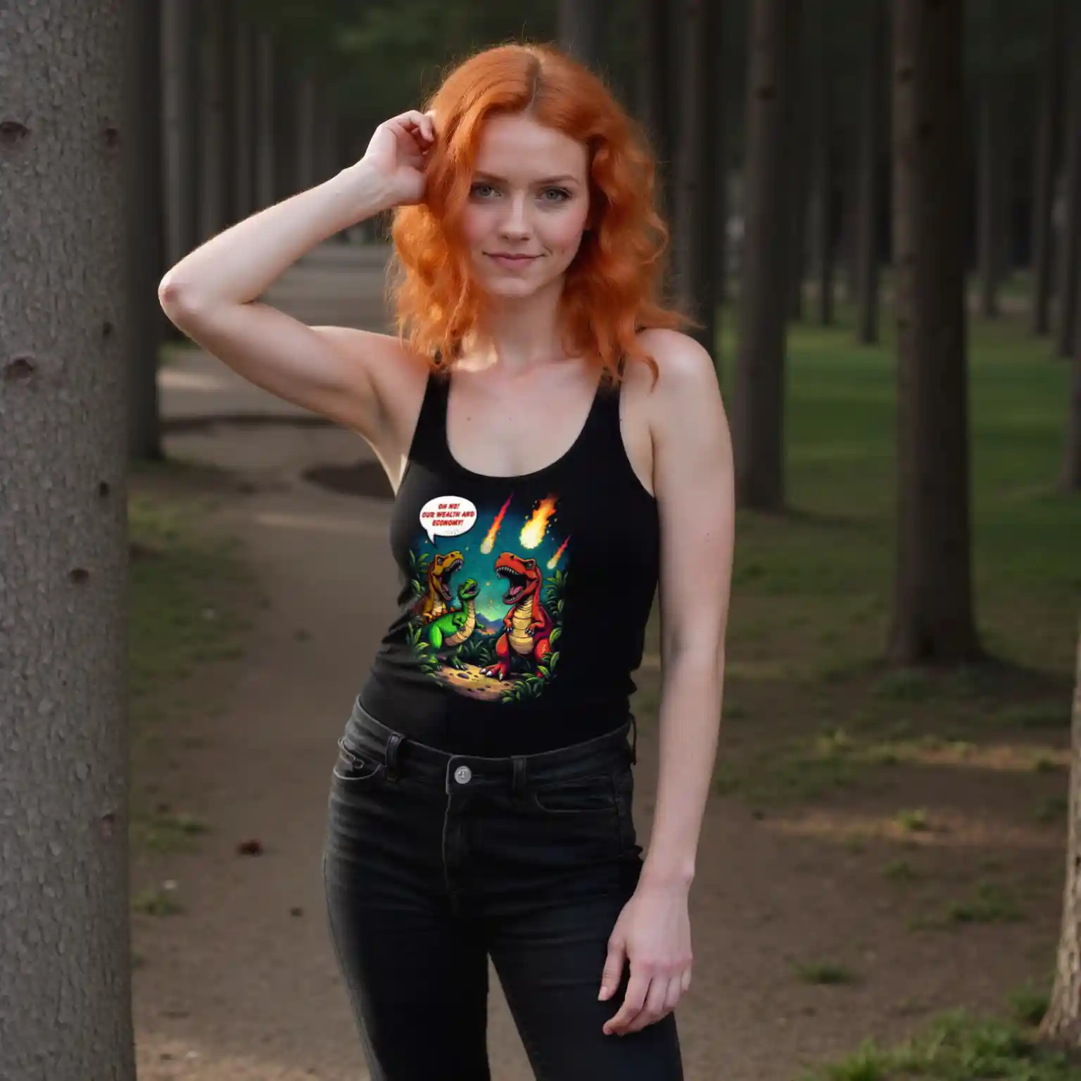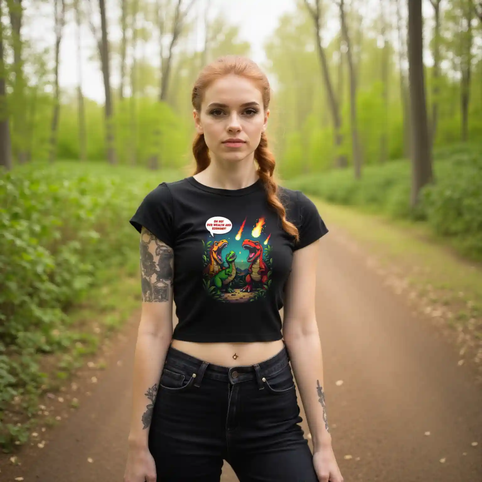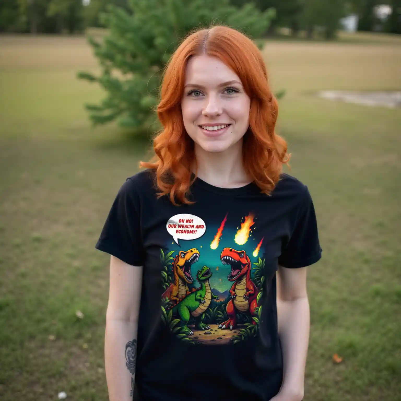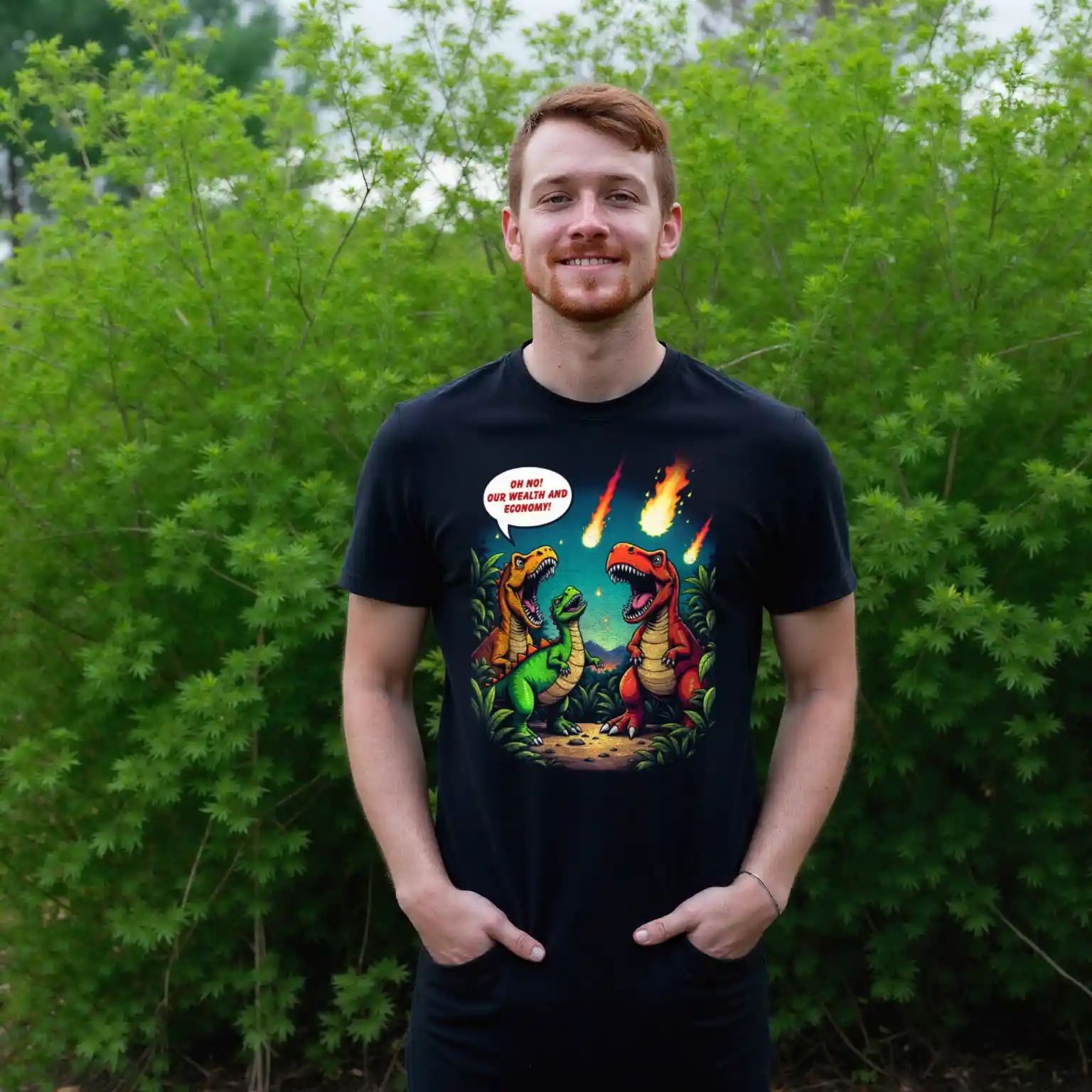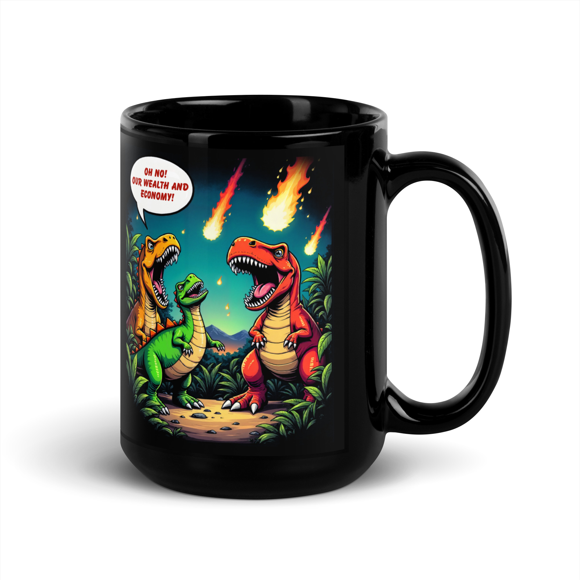Das Unisex Bio T-Shirt „Economic Dinosaurs“ kombiniert humorvolles Design mit einer kraftvollen gesellschaftskritischen Botschaft. Das Motiv zeigt Dinosaurier, die angesichts heranrasender Kometen weniger um ihr Überleben als vielmehr um „Wohlstand und Wirtschaft“ besorgt sind. Diese ironische Darstellung regt dazu an, über politische Prioritäten und die Verantwortung gegenüber unserem Planeten nachzudenken.