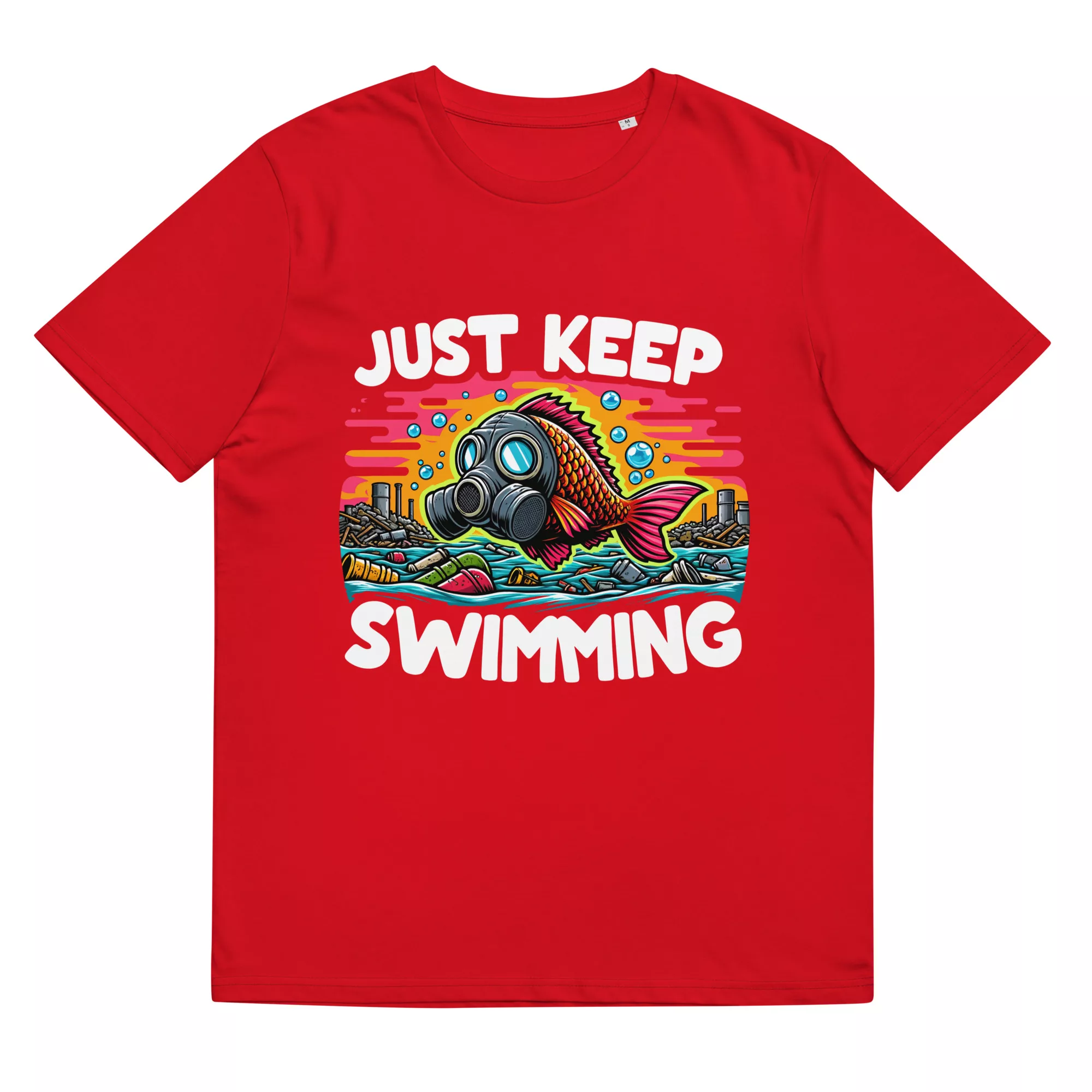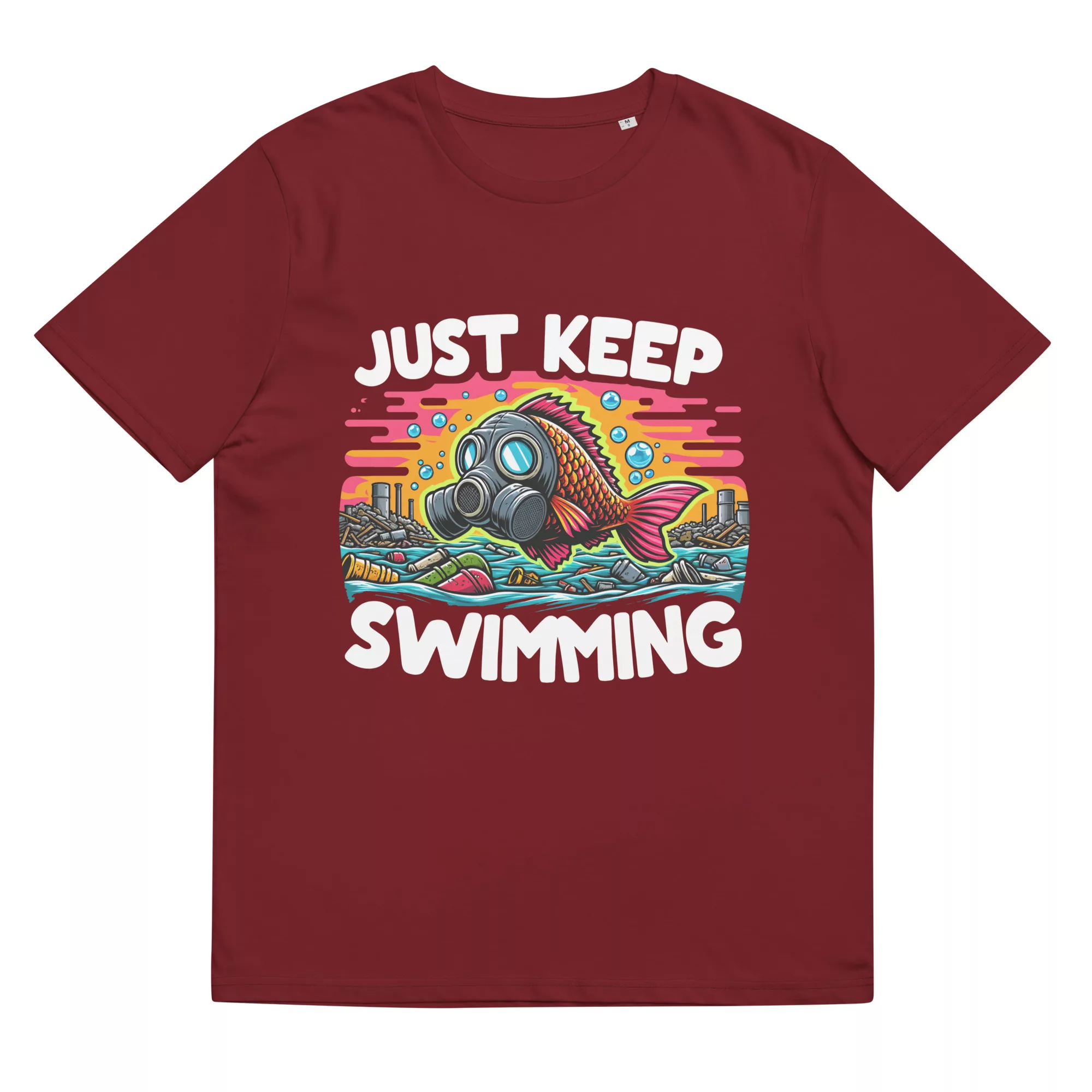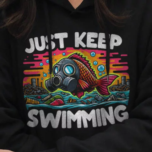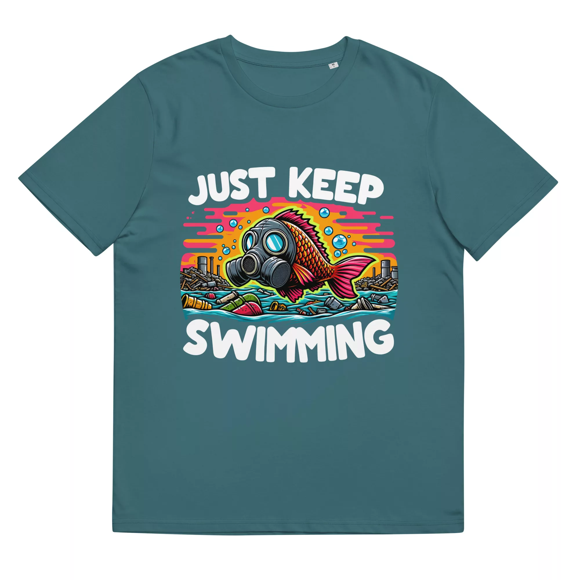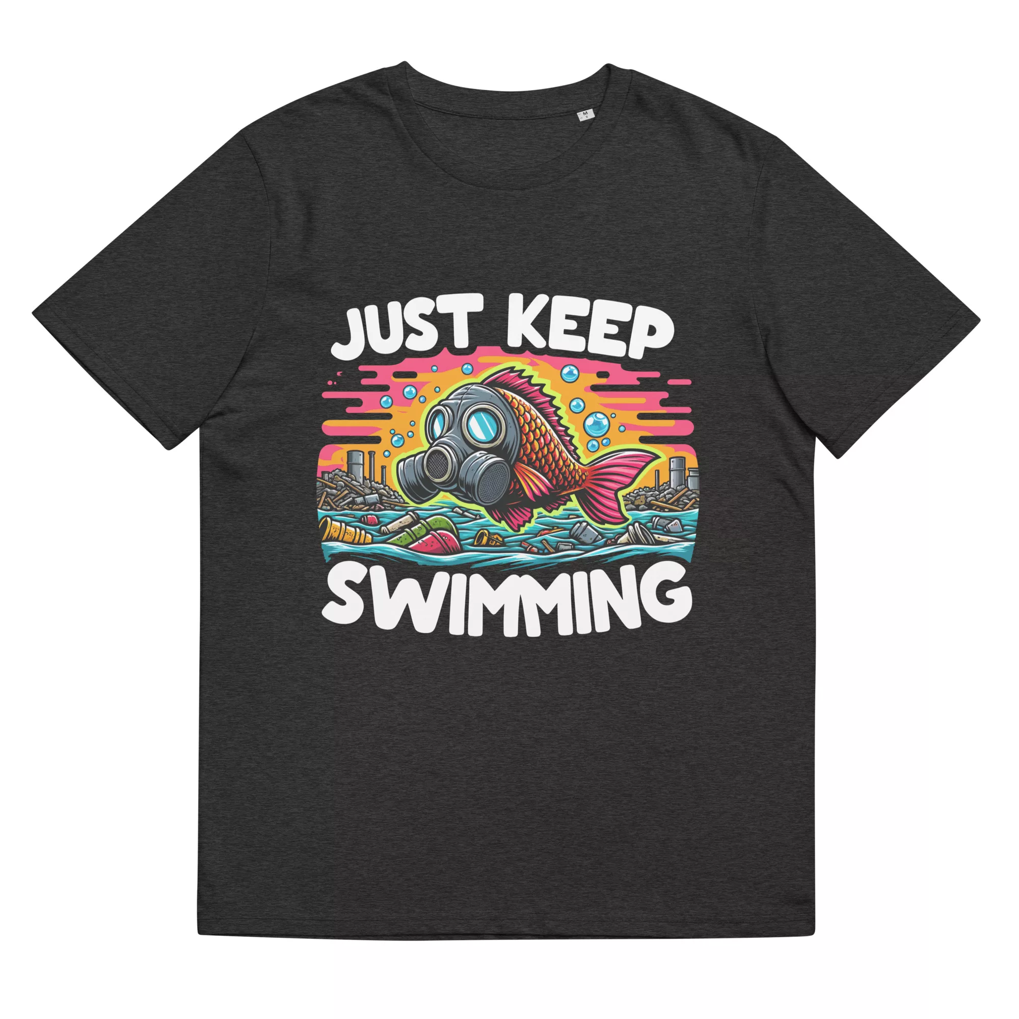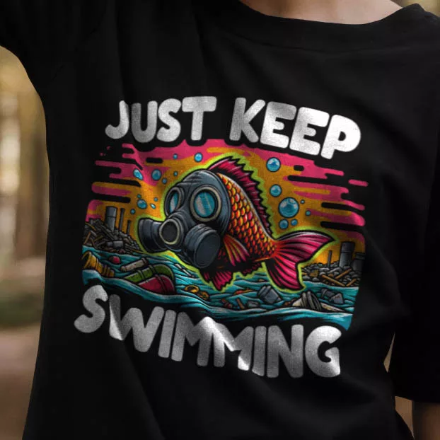 Das Unisex Bio T-Shirt „Just Keep Swimming“ ist nicht nur ein modisches Statement, sondern auch ein Aufruf zum Handeln gegen die Umweltverschmutzung. Auf diesem Shirt prangt das Bild eines Fisches mit einer Gasmaske, der sich durch stark verschmutztes Wasser bewegt, umgeben von Abfall und Industrierückständen. Dieses Design soll nicht nur provozieren, sondern auch zum Nachdenken anregen über die Auswirkungen unserer Handlungen auf die Meeresumwelt und deren Bewohner.