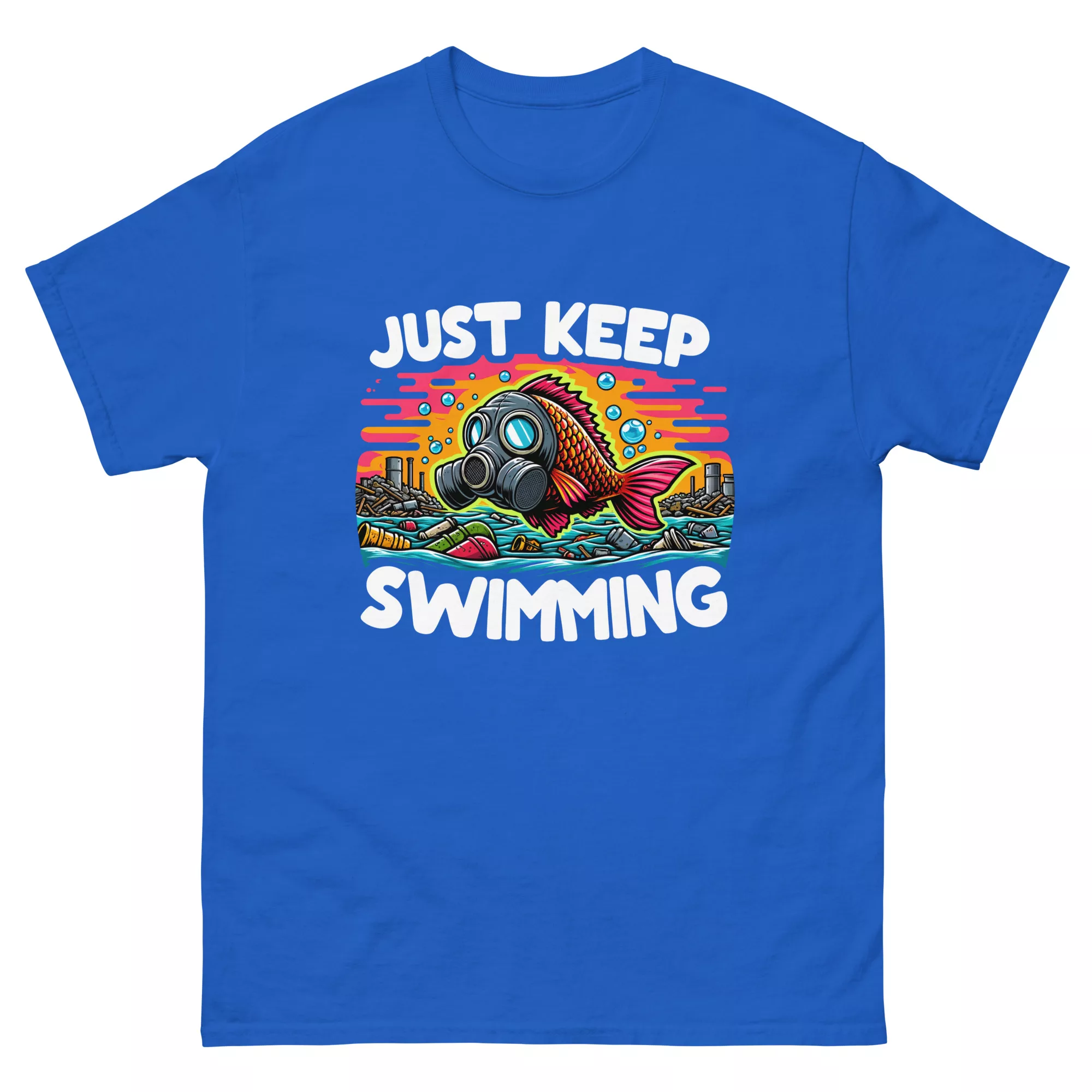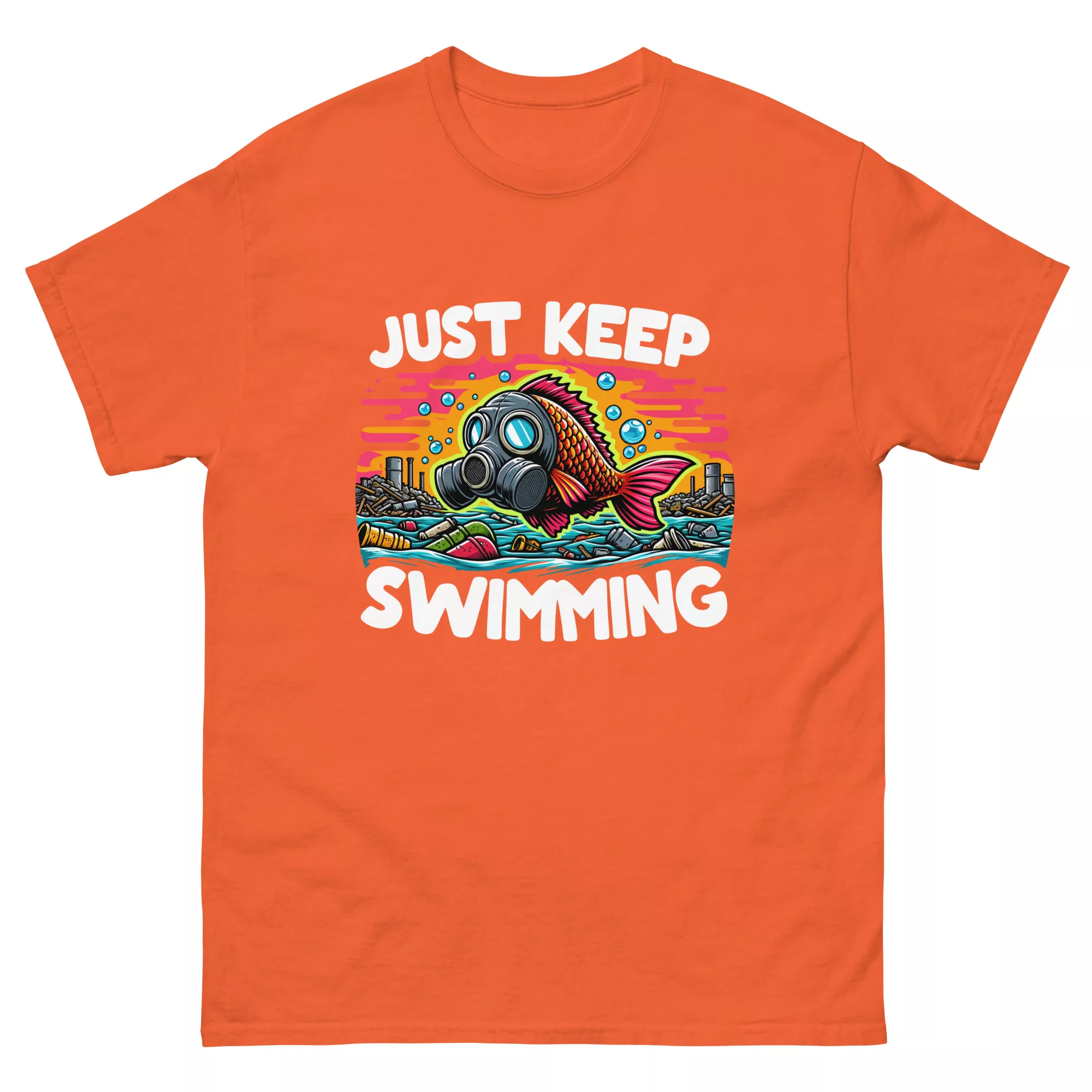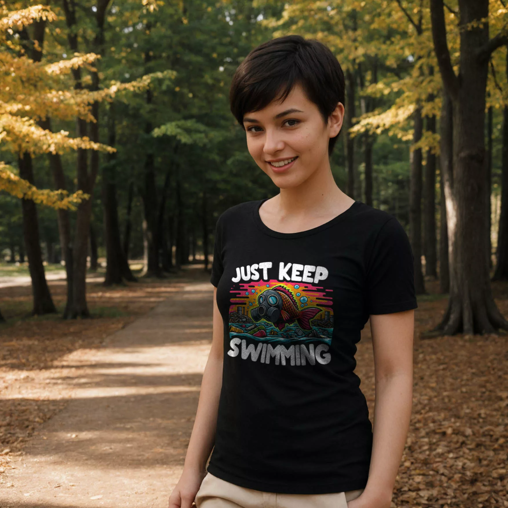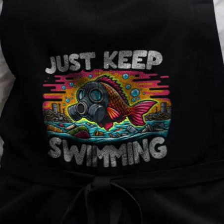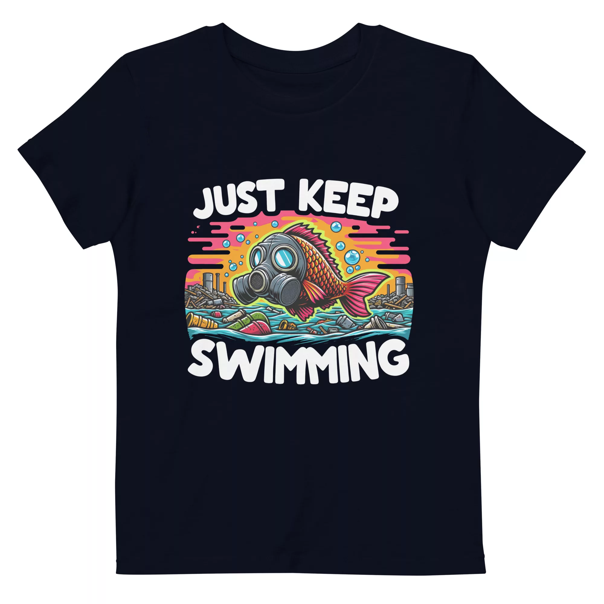 Das Unisex Bio T-Shirt „Just Keep Swimming“ ist nicht nur ein modisches Statement, sondern auch ein Aufruf zum Handeln gegen die Umweltverschmutzung. Auf diesem Shirt prangt das Bild eines Fisches mit einer Gasmaske, der sich durch stark verschmutztes Wasser bewegt, umgeben von Abfall und Industrierückständen. Dieses Design soll nicht nur provozieren, sondern auch zum Nachdenken anregen über die Auswirkungen unserer Handlungen auf die Meeresumwelt und deren Bewohner.