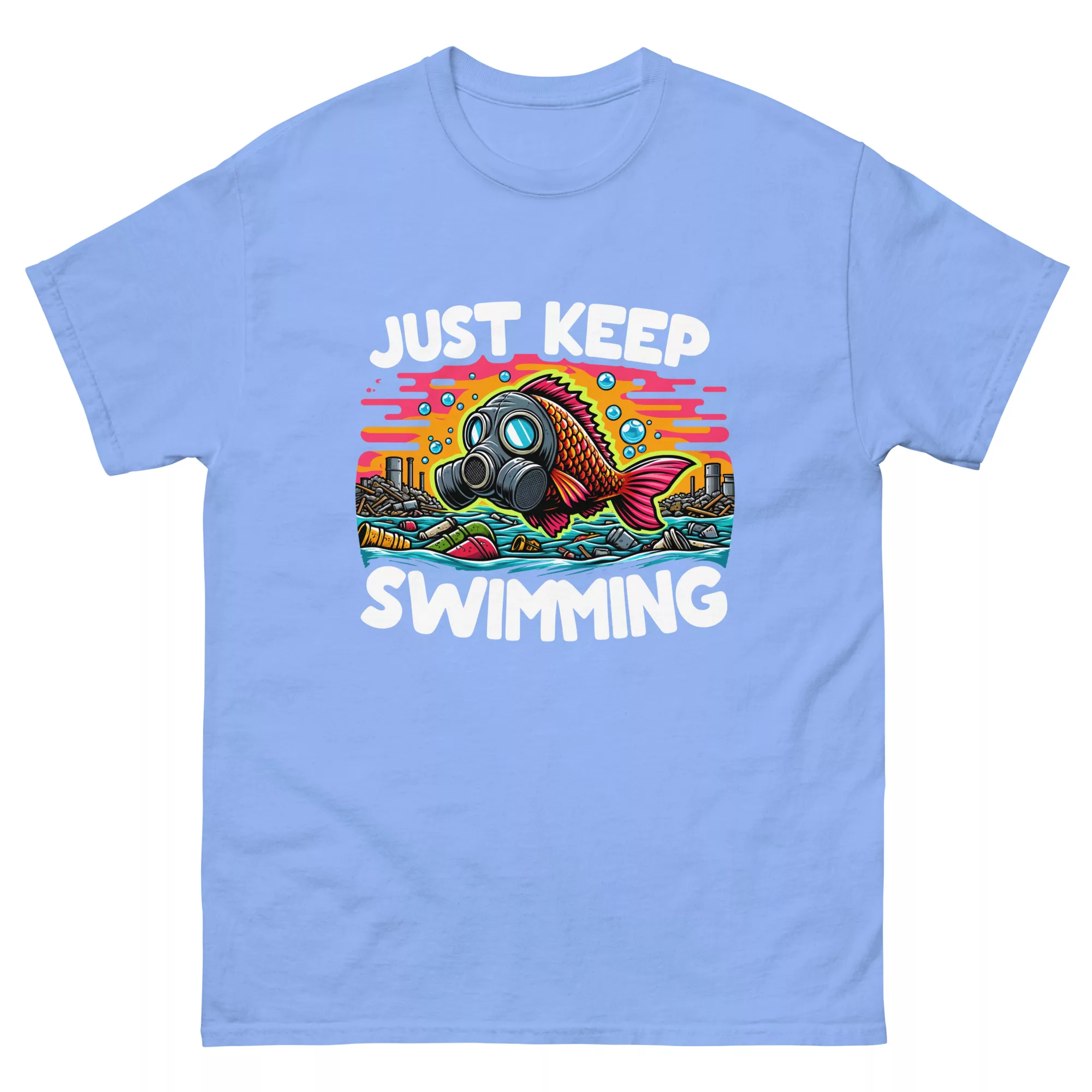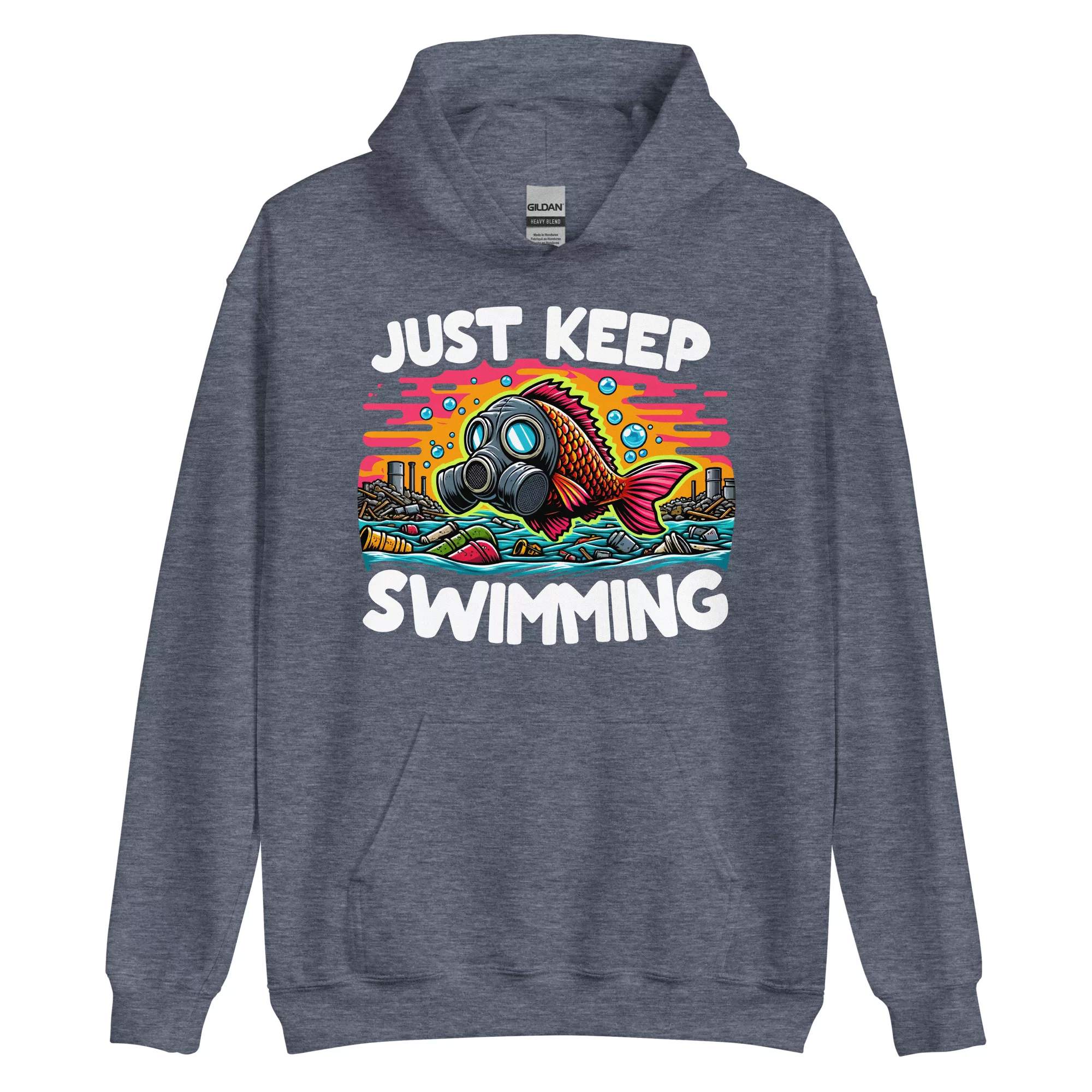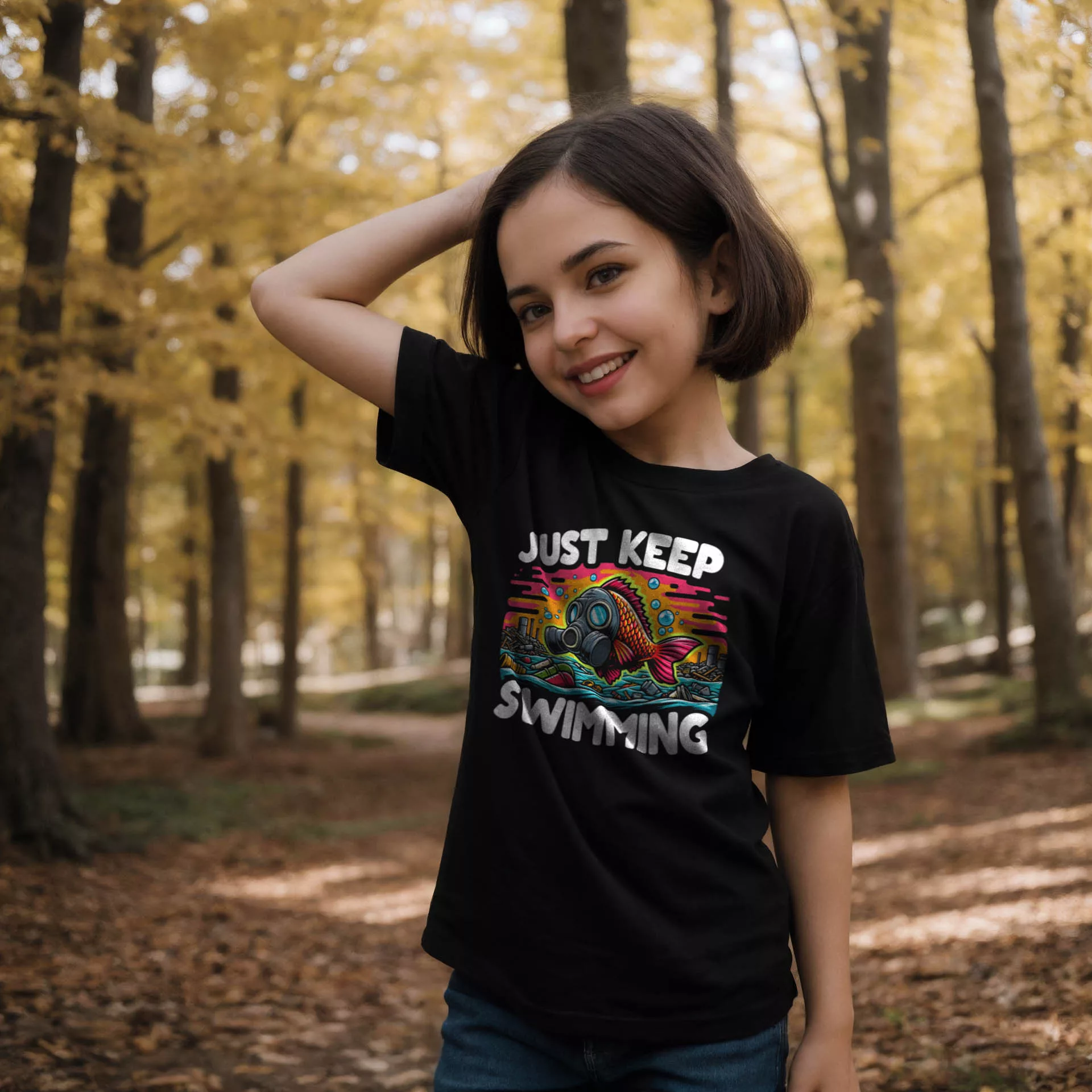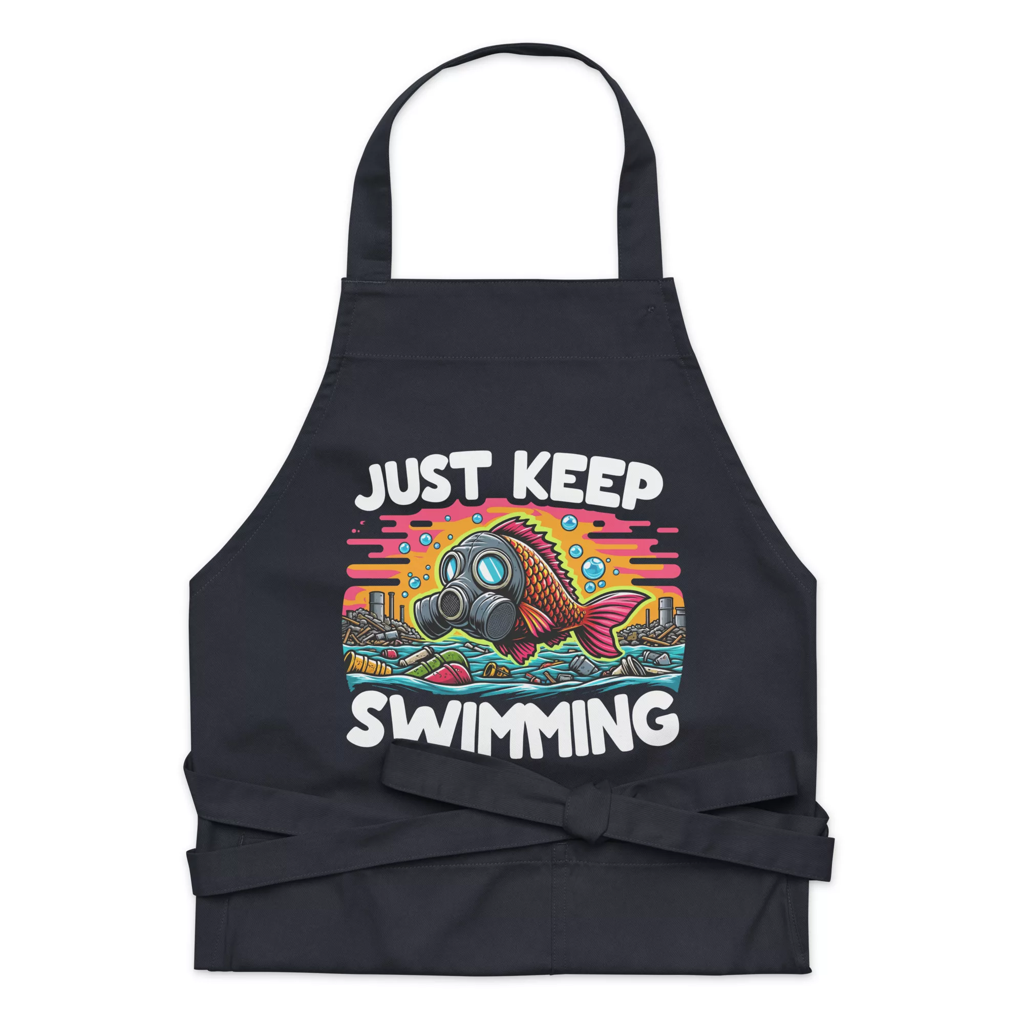 Das Unisex Bio T-Shirt „Just Keep Swimming“ ist nicht nur ein modisches Statement, sondern auch ein Aufruf zum Handeln gegen die Umweltverschmutzung. Auf diesem Shirt prangt das Bild eines Fisches mit einer Gasmaske, der sich durch stark verschmutztes Wasser bewegt, umgeben von Abfall und Industrierückständen. Dieses Design soll nicht nur provozieren, sondern auch zum Nachdenken anregen über die Auswirkungen unserer Handlungen auf die Meeresumwelt und deren Bewohner.
