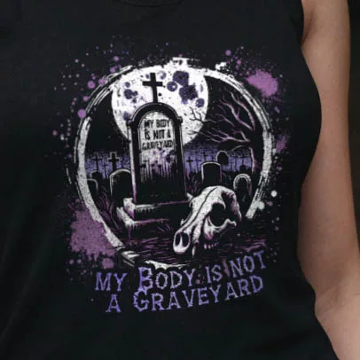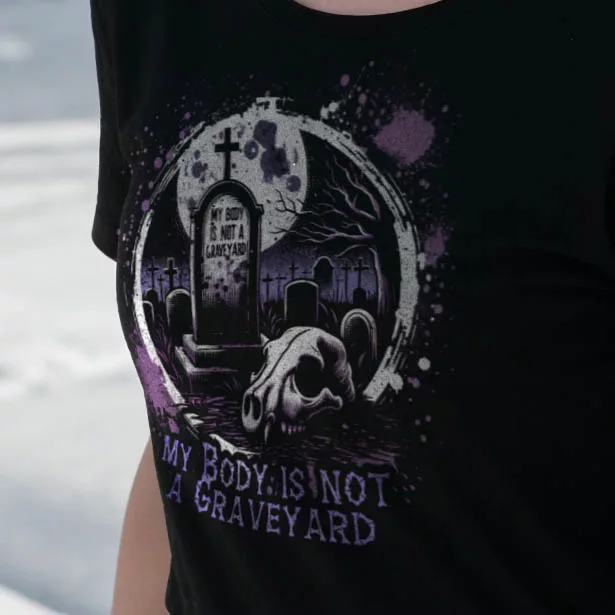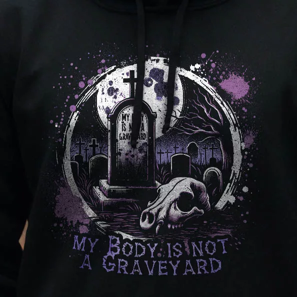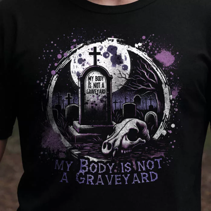 Das „My Body is not a Graveyard Bio T-Shirt“ ist ein eindrucksvolles und umweltbewusstes Kleidungsstück, das eine starke Botschaft gegen den Fleischkonsum und für den Respekt vor Tieren vermittelt. Das Design zeigt einen düsteren und gruseligen Friedhof bei Vollmond mit vielen Gräbern und den Schädel eines toten Tieres im Vordergrund. Der Schriftzug „My body is not a graveyard“ in Lettern aus Knochen prangt unter dem Motiv und betont, dass der Körper der Trägerin keine toten Tiere beinhaltet und somit kein Friedhof für Tote ist.