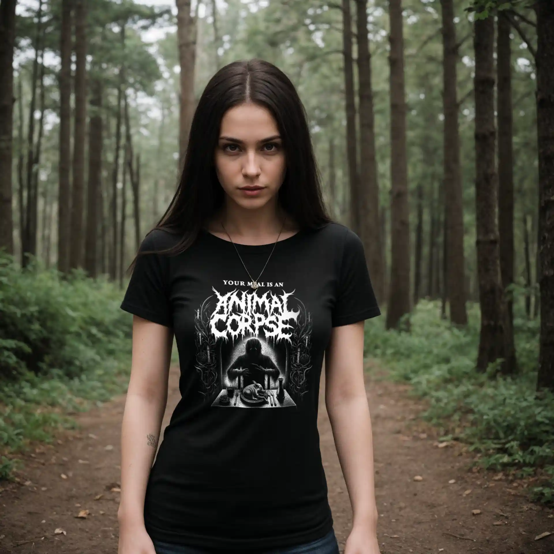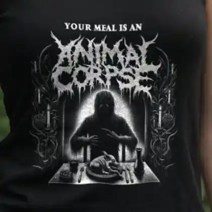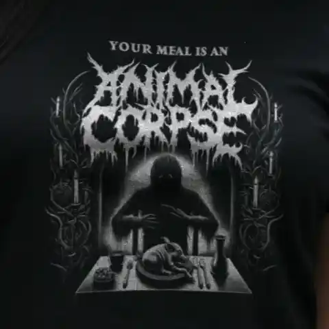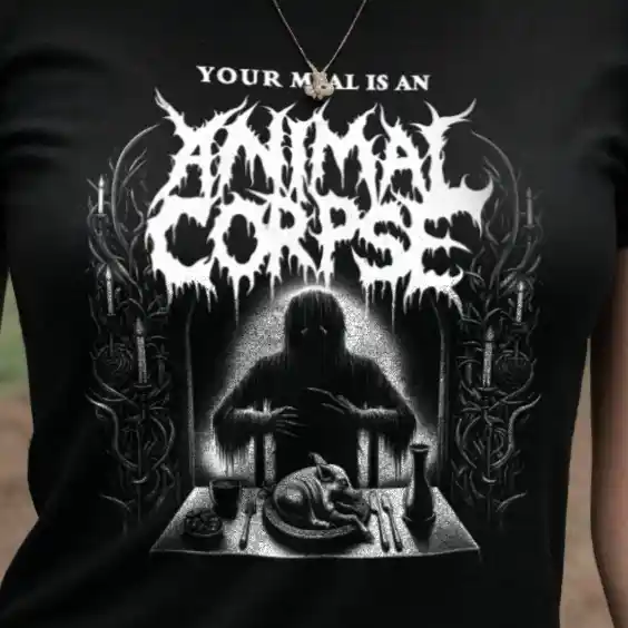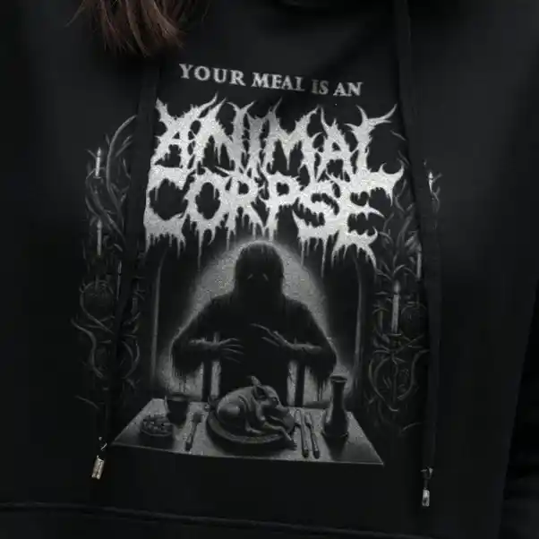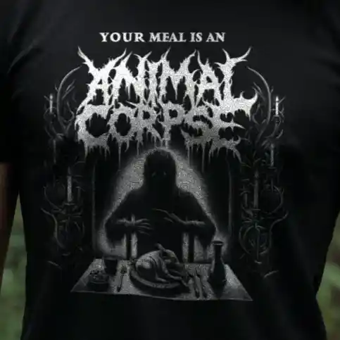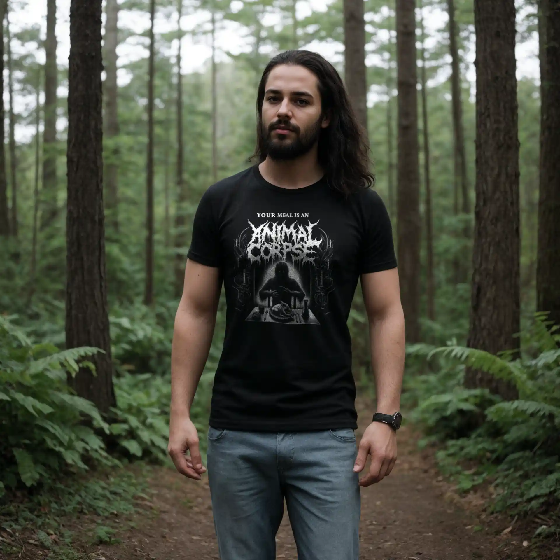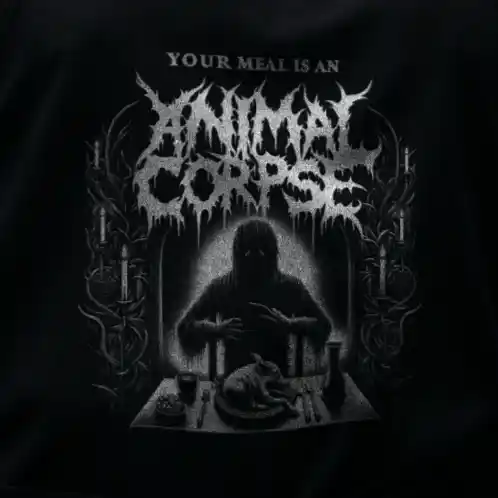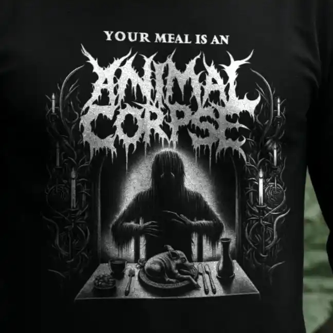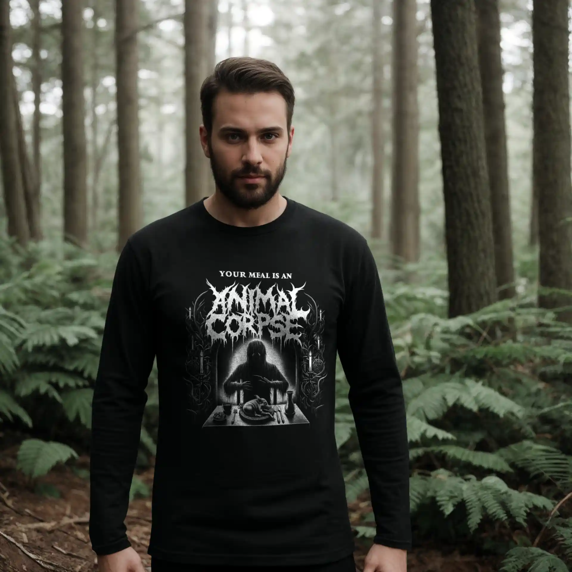 Entdecke unser „Animal Corpse“ Longsleeve T-Shirt, das die düstere Welt des Death Metal mit einem starken Statement gegen Tierkonsum verbindet. Dieses Shirt ist nicht nur ein Kleidungsstück, sondern eine Botschaft, die tief in der Metal- und Vegan-Szene verwurzelt ist. Das provokante Design zeigt eine menschliche Gestalt, die vor einem Teller mit einem Tierkadaver sitzt, umgeben von einem finsteren Ambiente, das zum Nachdenken anregt und gleichzeitig deine Zugehörigkeit zur Metal-Community stolz präsentiert.