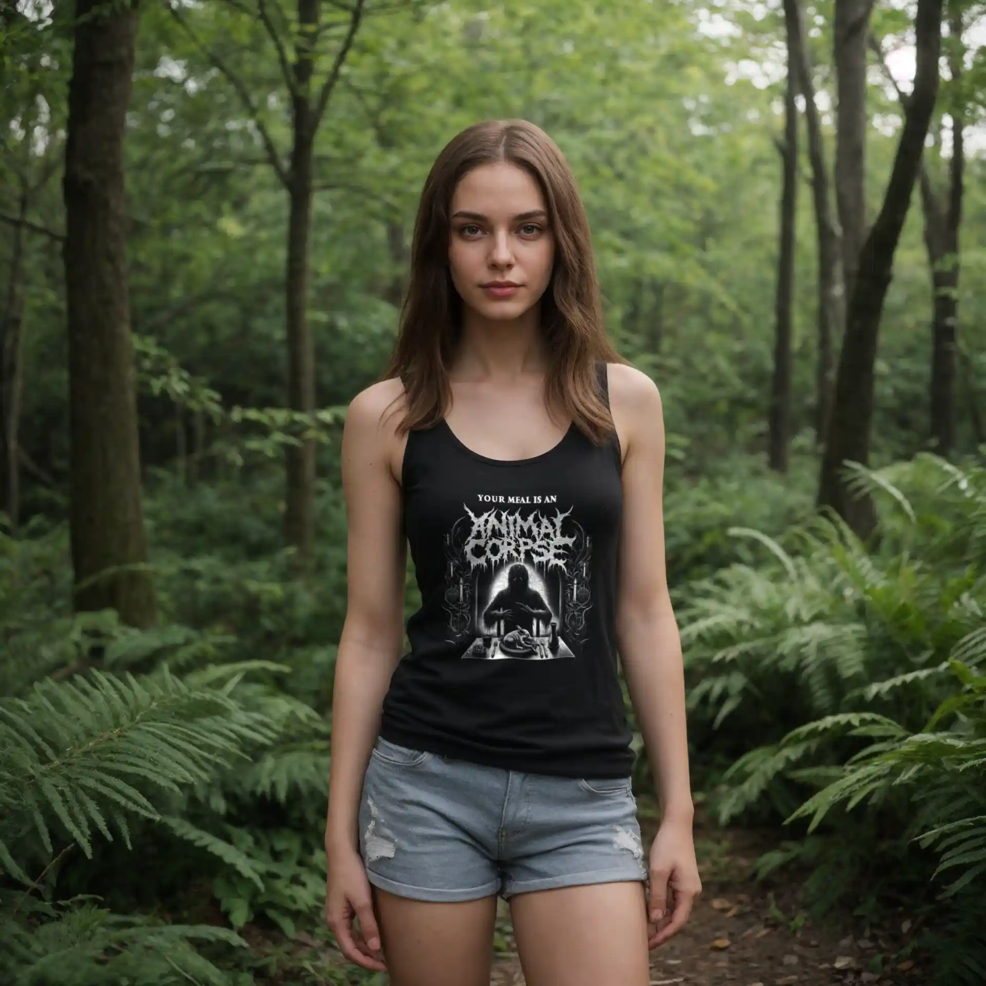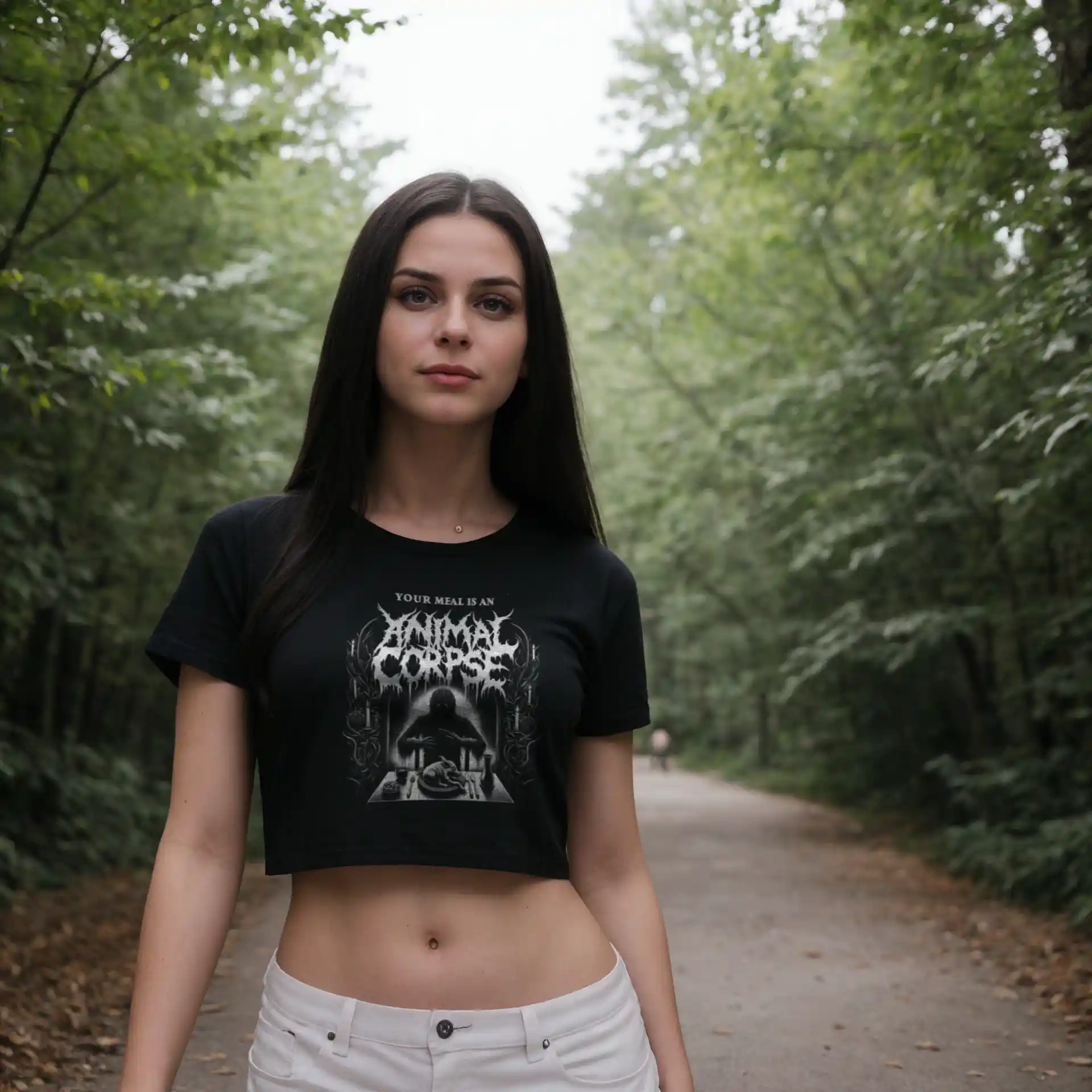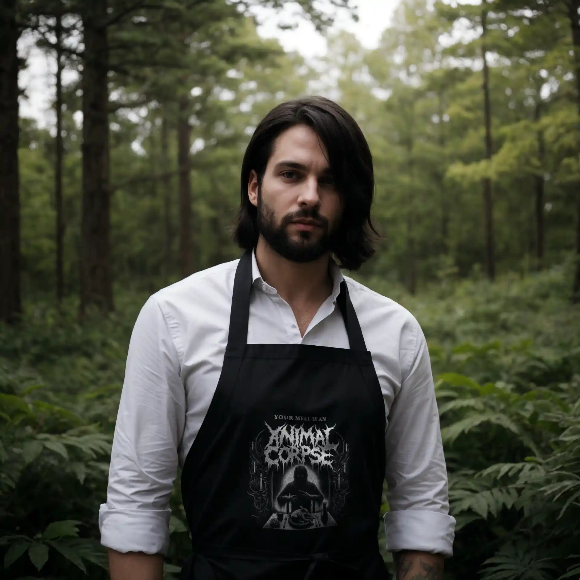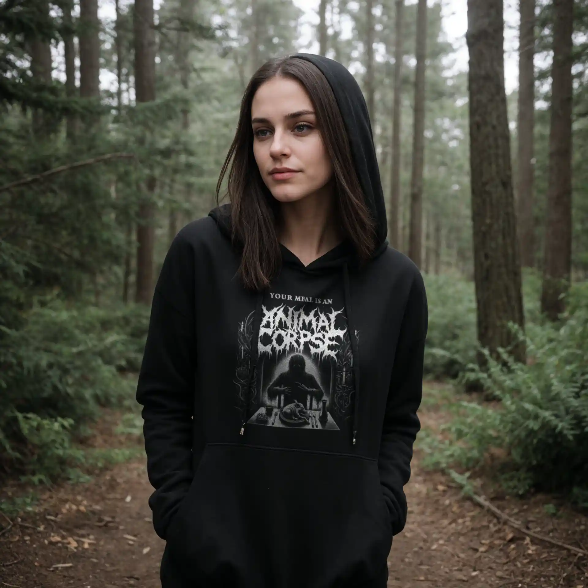 Entdecke unser „Animal Corpse“ Longsleeve T-Shirt, das die düstere Welt des Death Metal mit einem starken Statement gegen Tierkonsum verbindet. Dieses Shirt ist nicht nur ein Kleidungsstück, sondern eine Botschaft, die tief in der Metal- und Vegan-Szene verwurzelt ist. Das provokante Design zeigt eine menschliche Gestalt, die vor einem Teller mit einem Tierkadaver sitzt, umgeben von einem finsteren Ambiente, das zum Nachdenken anregt und gleichzeitig deine Zugehörigkeit zur Metal-Community stolz präsentiert.