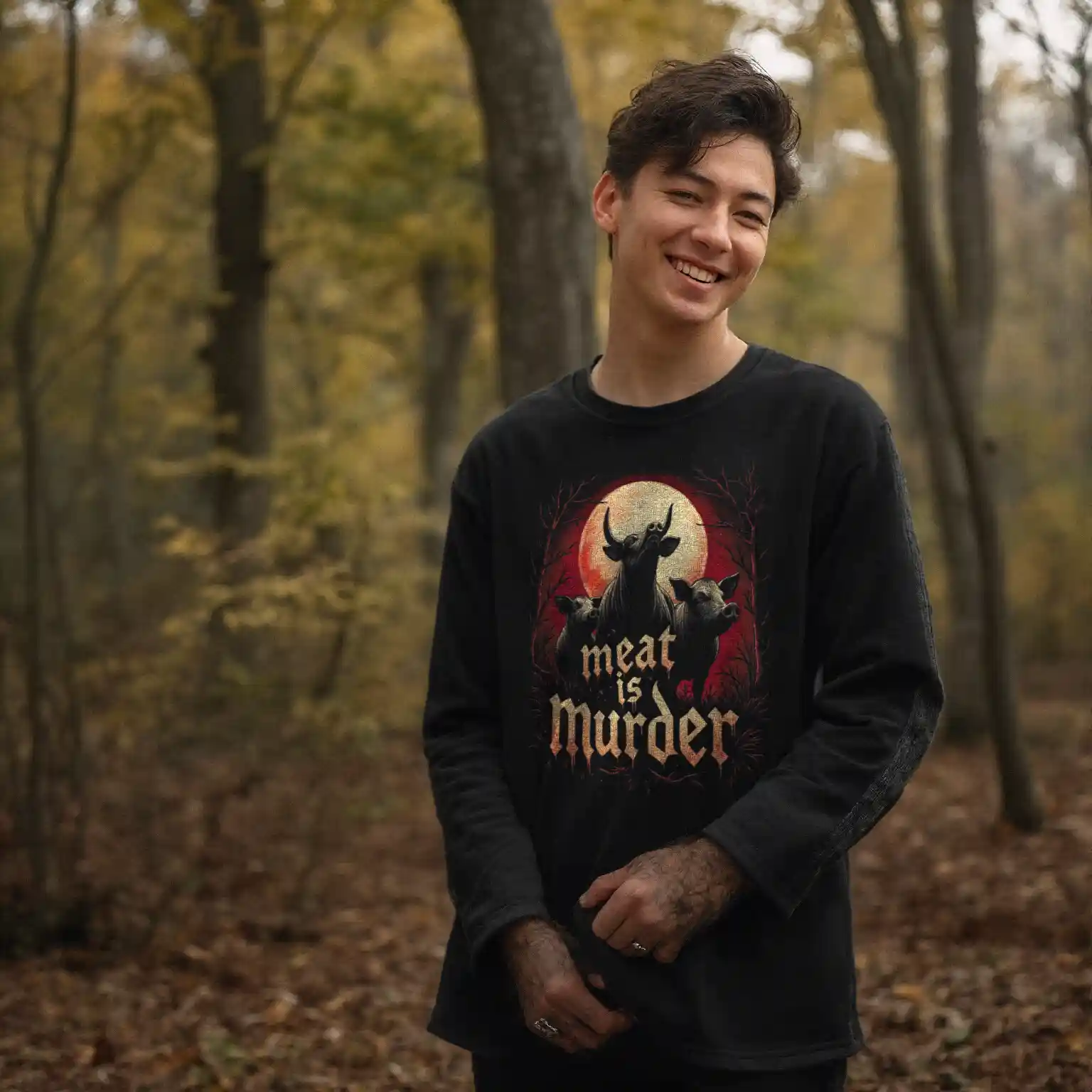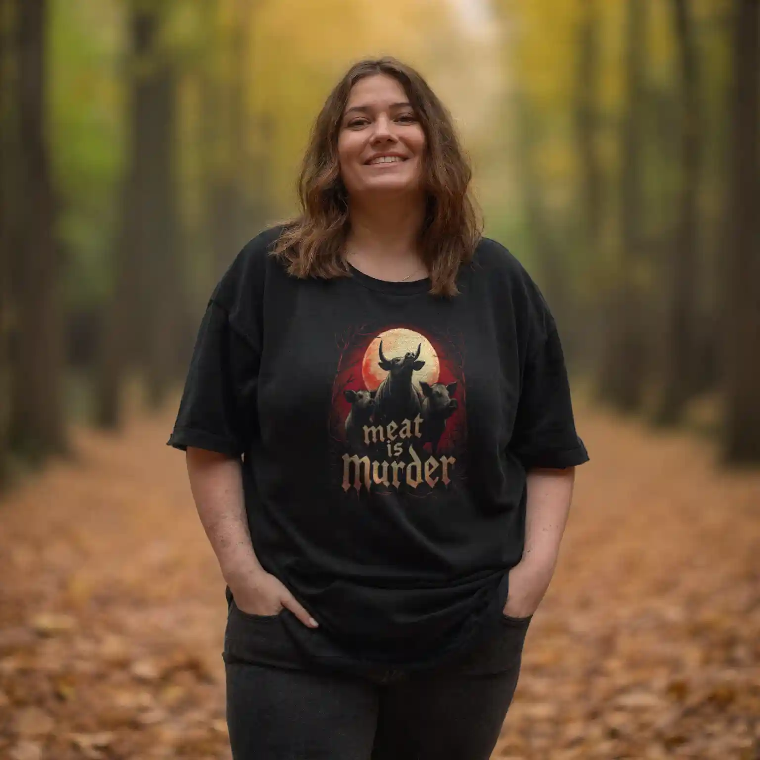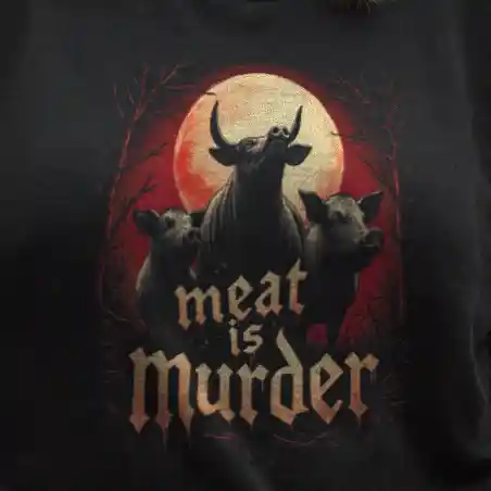 Unter einem blutroten Mond, umgeben von einer finsteren, kahlen Waldlandschaft, stehen eine Kuh und zwei Schweine. Ihre Blicke sind ernst, eindringlich, fast anklagend – als wüssten sie genau, welches Schicksal ihnen bevorsteht. Der blutige Himmel reflektiert die Wahrheit, die unter ihnen in gotischer, tropfender Schrift geschrieben steht: MEAT IS MURDER!
