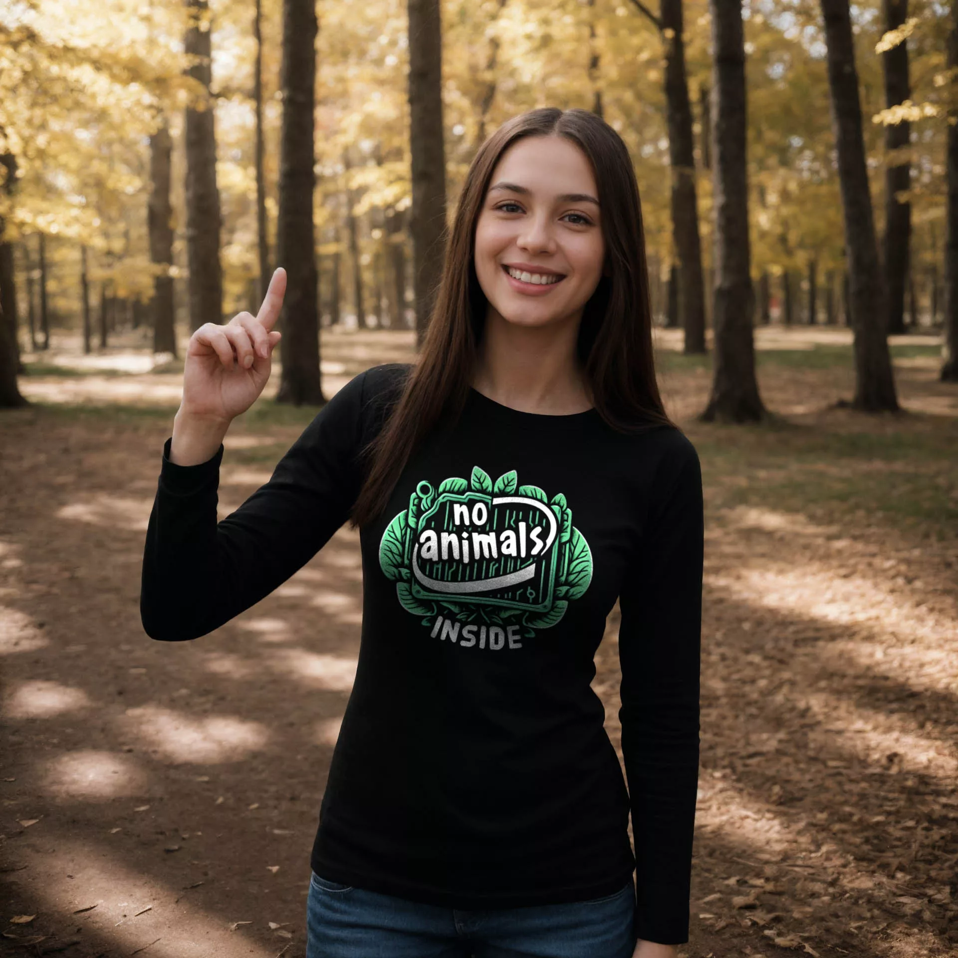 Das Longsleeve T-Shirt mit dem Design „No Animals Inside“ ist eine stilvolle und zugleich bedeutungsvolle Ergänzung zu deiner Garderobe. Dieses Shirt ist nicht nur ein modisches Kleidungsstück, sondern auch ein Statement für Tierwohl und Umweltschutz. Stell dir vor, wie du dieses Shirt trägst und damit ein klares Zeichen für deine Überzeugungen setzt.