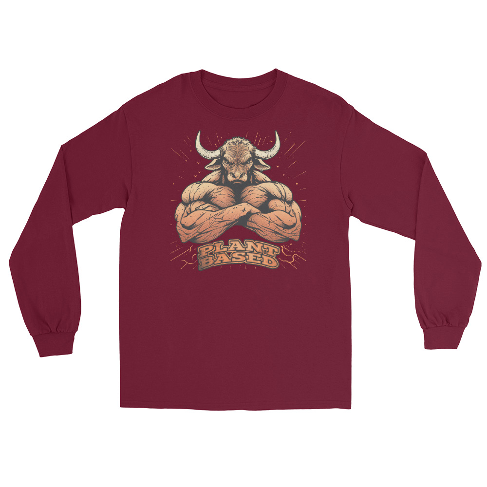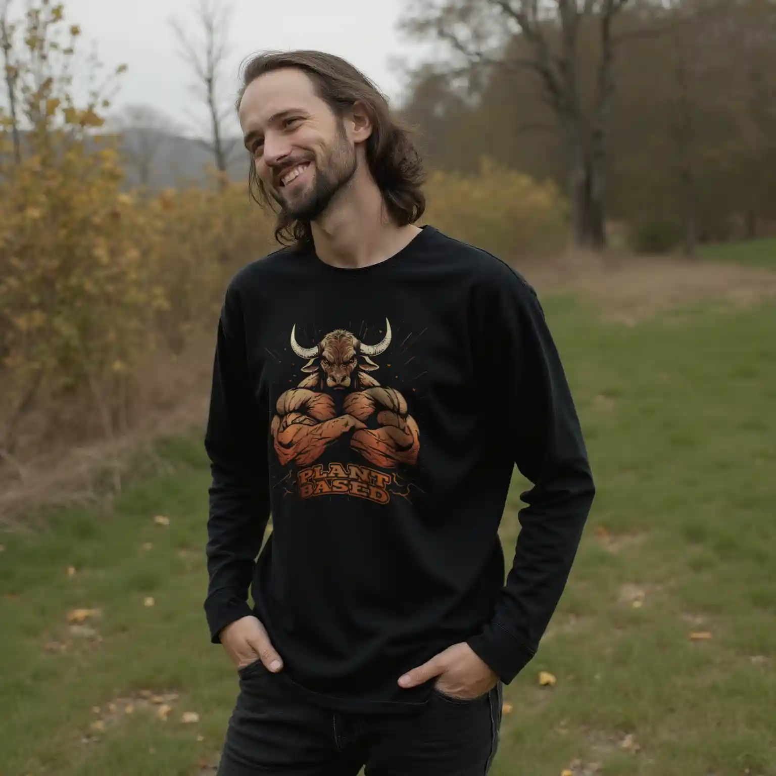 Das „Plant Based“ Longsleeve T-Shirt ist die perfekte Wahl für alle, die stolz zeigen möchten, dass pflanzenbasierte Ernährung und Krafttraining hervorragend zusammenpassen. Auf diesem Design ist ein muskulöser, selbstbewusster Stier mit verschränkten Armen abgebildet, der verkörpert, dass Stärke auch ohne tierische Produkte aufgebaut werden kann. Die Botschaft ist klar: Stiere, die sich ausschließlich pflanzenbasiert ernähren, sind der lebende Beweis dafür, dass vegane Ernährung keineswegs schwach macht, sondern echte Power bringt.