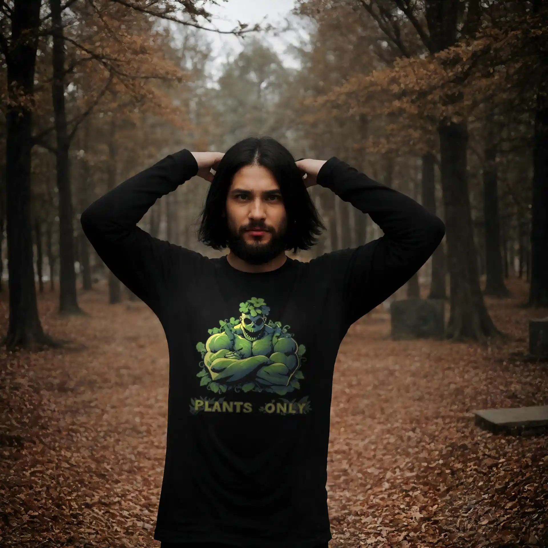 Begrüße die kühlere Jahreszeit mit Stil und einem Hauch von Halloween-Grusel in unserem „Plants Only (Limited Halloween Edition)“ Longsleeve T-Shirt. Dieses einzigartige Langarm-Shirt trägt das Bild eines grimmigen Pflanzen-Zombies als Türsteher, der symbolisch dafür steht, dass nur pflanzenbasierte Zutaten willkommen sind. Ideal für die kühleren Tage im Herbst und Winter, bietet dieses Shirt eine perfekte Kombination aus Komfort, Wärme und Stil.