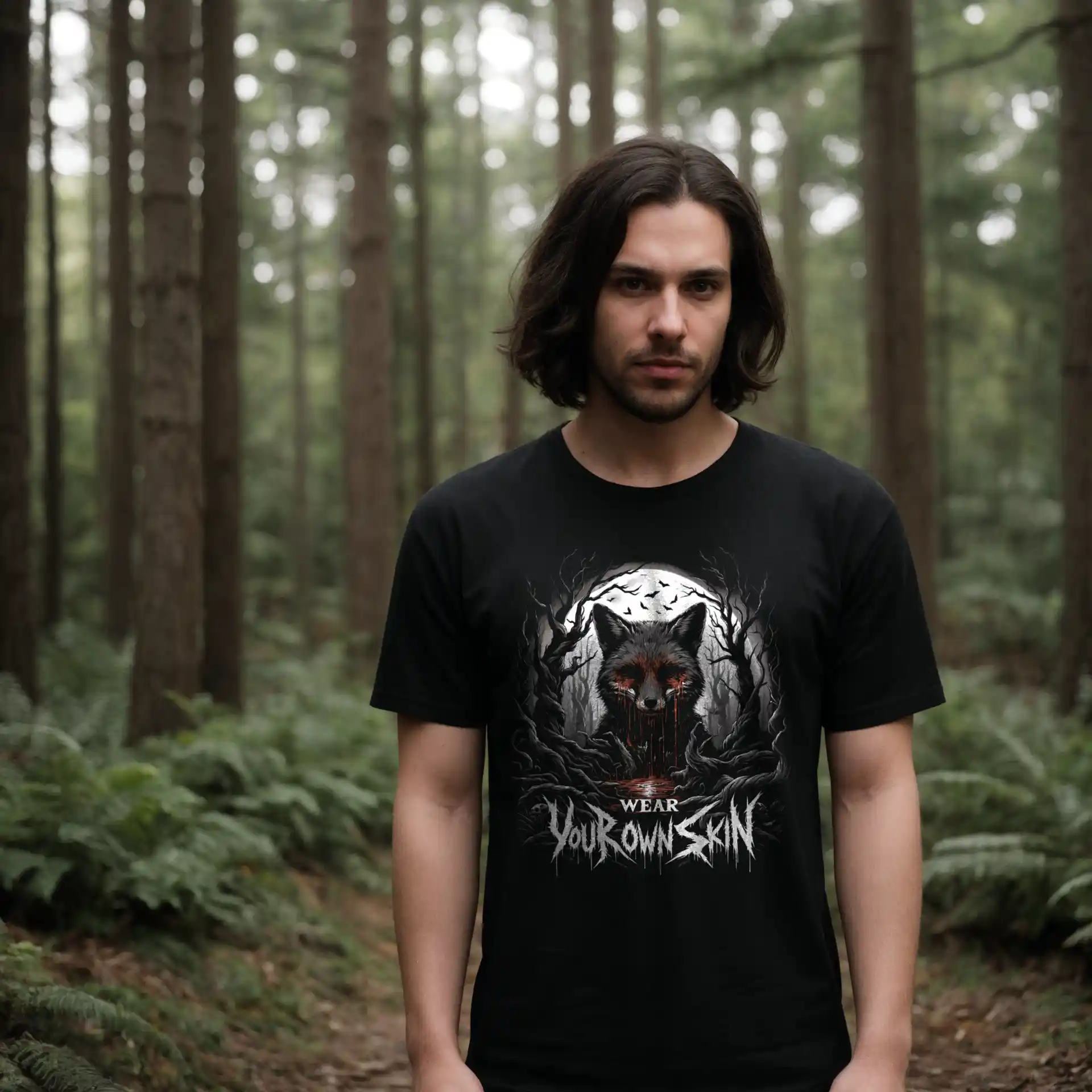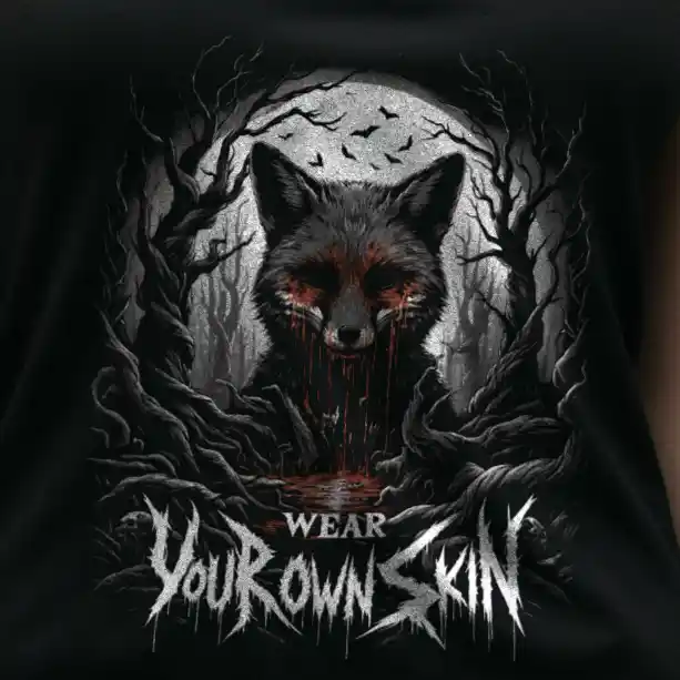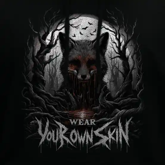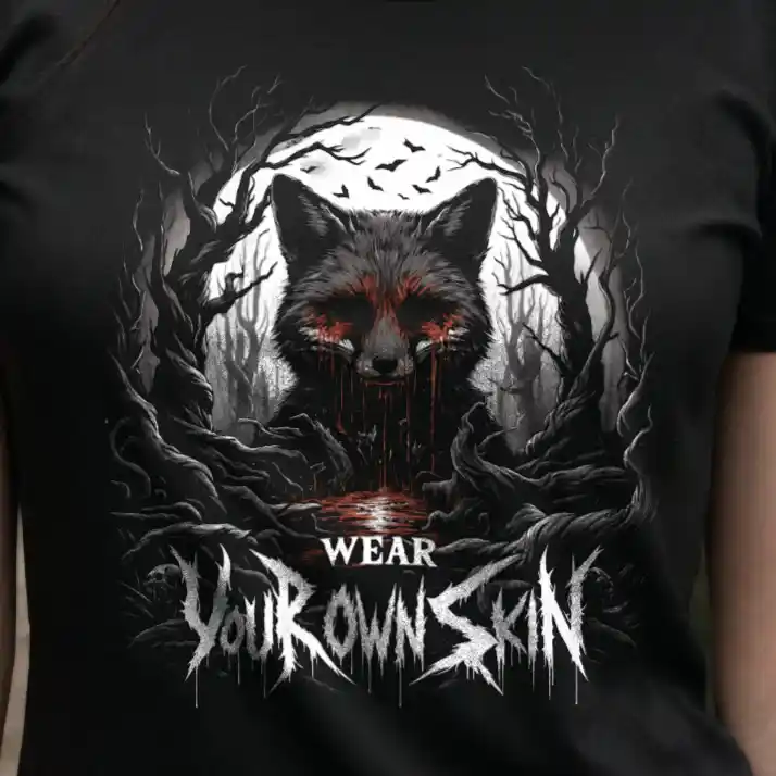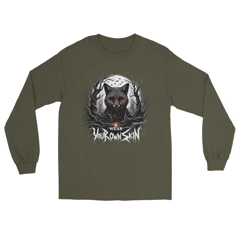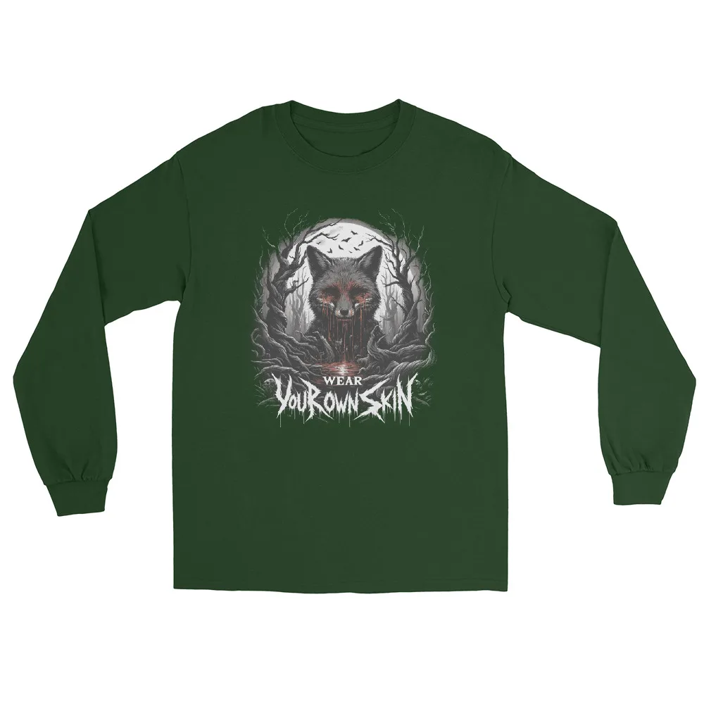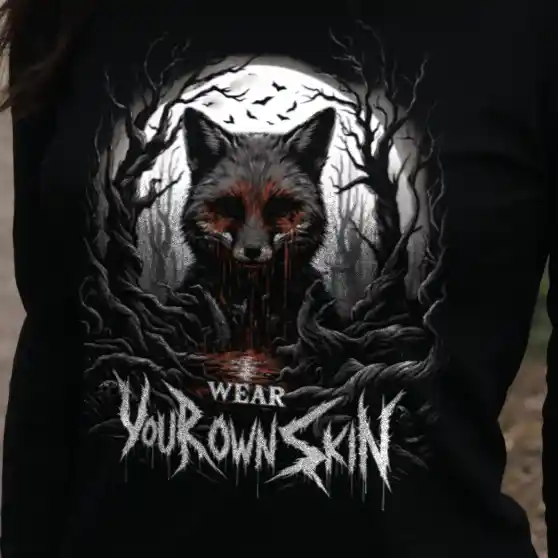 Das „Wear Your Own Skin“ Longsleeve T-Shirt ist mehr als nur ein Kleidungsstück; es ist eine Botschaft, die tief in den Wurzeln des Gothic und Horror Stils verankert ist. Mit einem einzigartigen Design, das einen blutigen Fuchs in einem düsteren Wald zeigt, lädt dieses Longsleeve jeden dazu ein, über die Bedeutung hinter der Wahl unserer Kleidung nachzudenken. Es ist eine stilvolle Erinnerung daran, die Haut, die wir tragen, bewusst zu wählen.