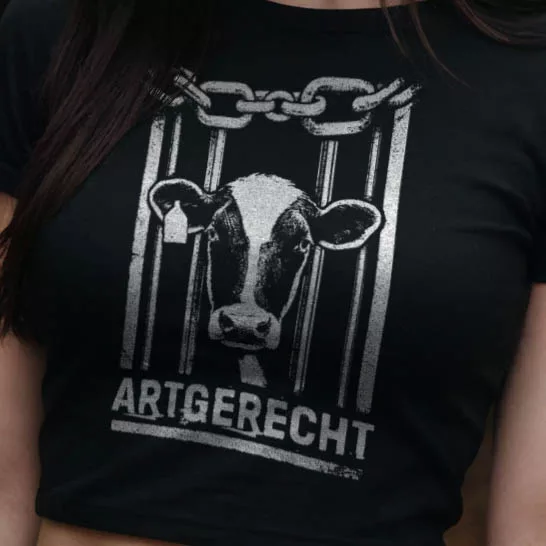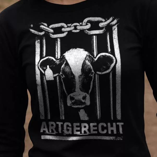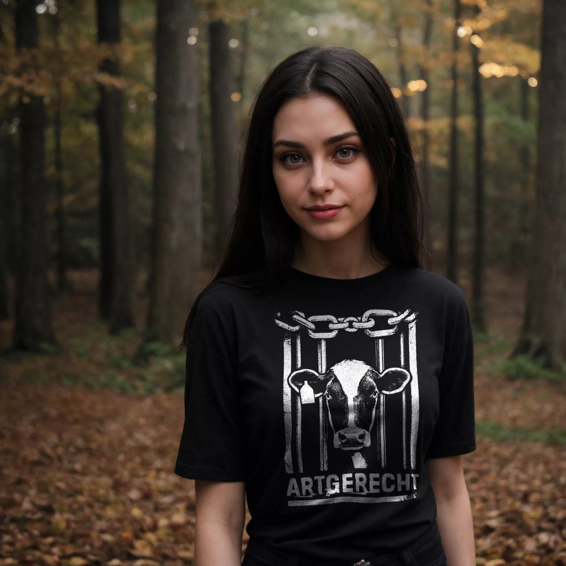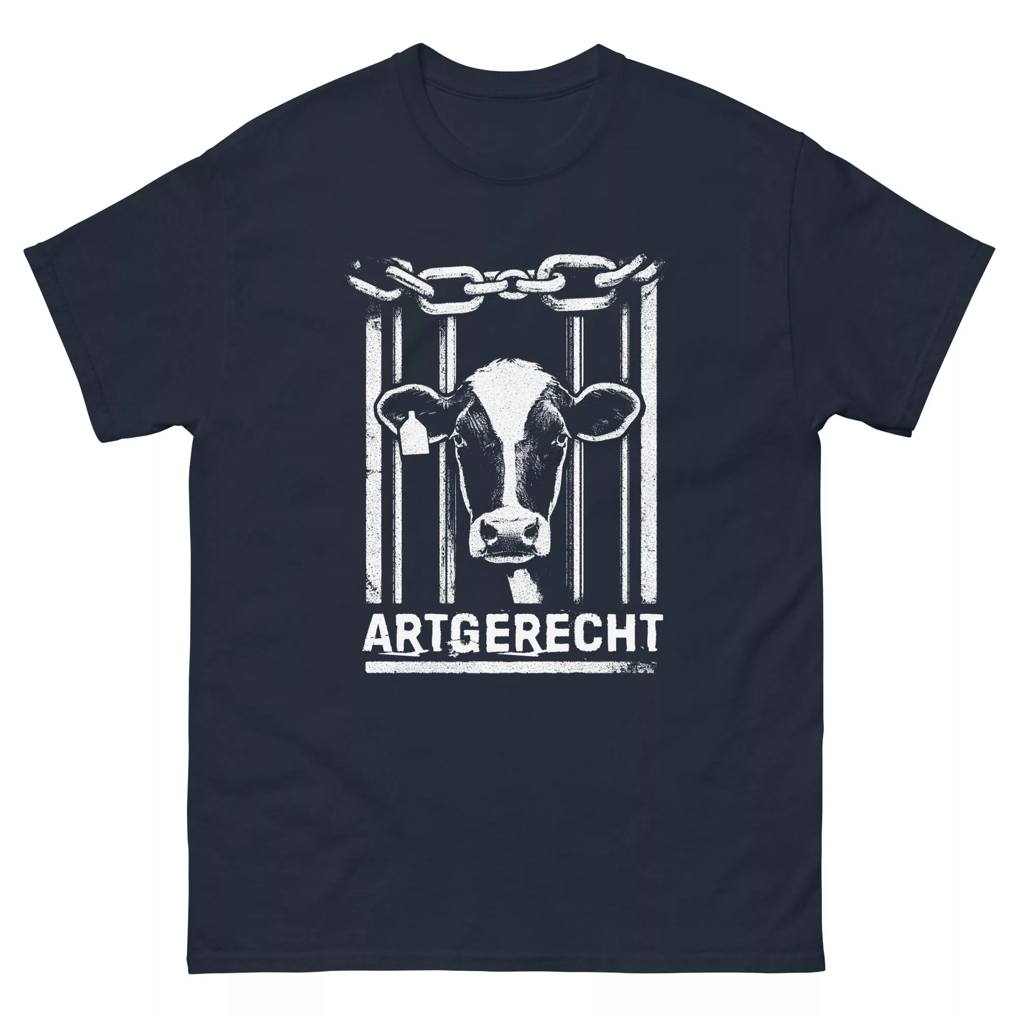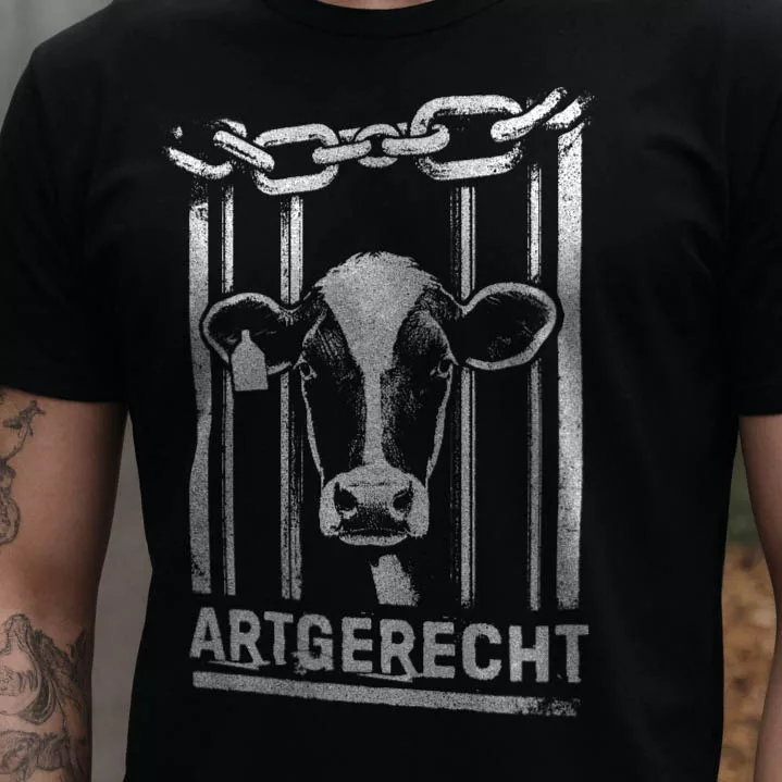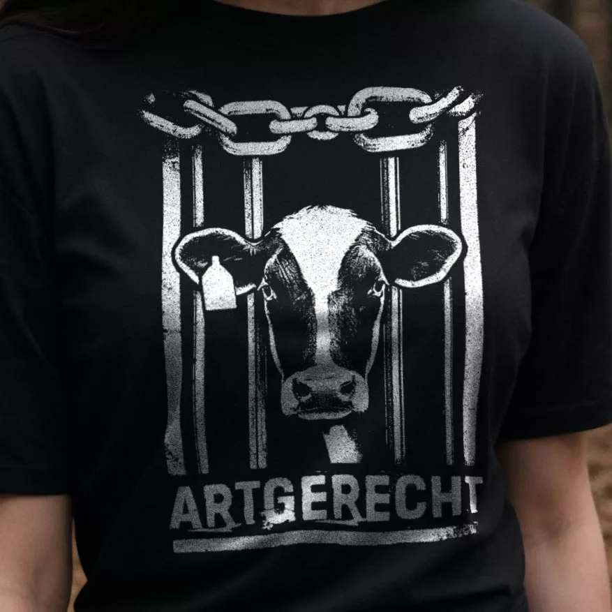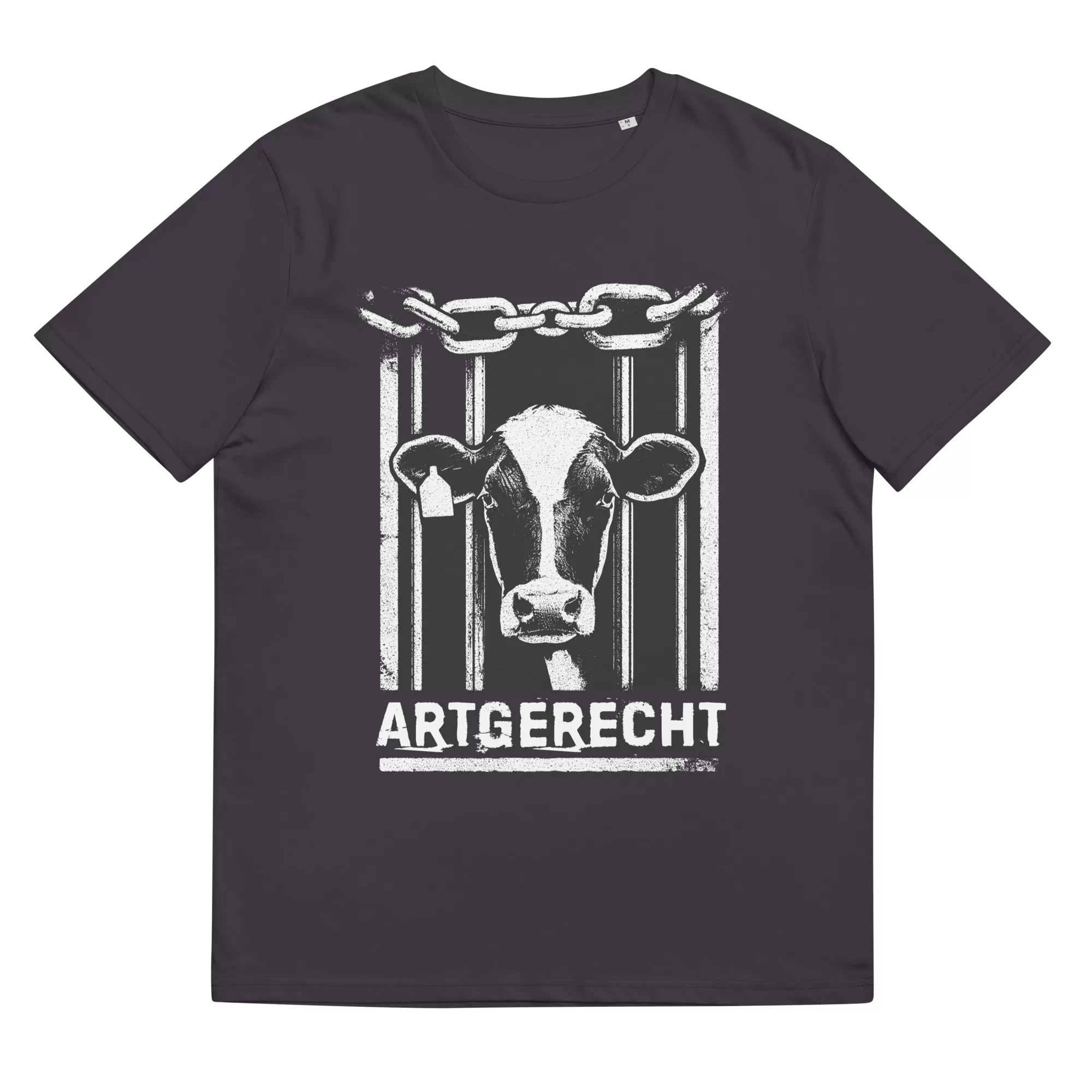 Das „Artgerecht“ Unisex T-Shirt ist ein aussagekräftiges Kleidungsstück, das ein starkes Statement gegen Massentierhaltung und für Tierrechte setzt. Das Shirt zeigt das eindrucksvolle Bild einer gefangenen Kuh hinter Gittern, was die traurige Realität der als „artgerecht“ klassifizierten Tierhaltung hervorhebt.