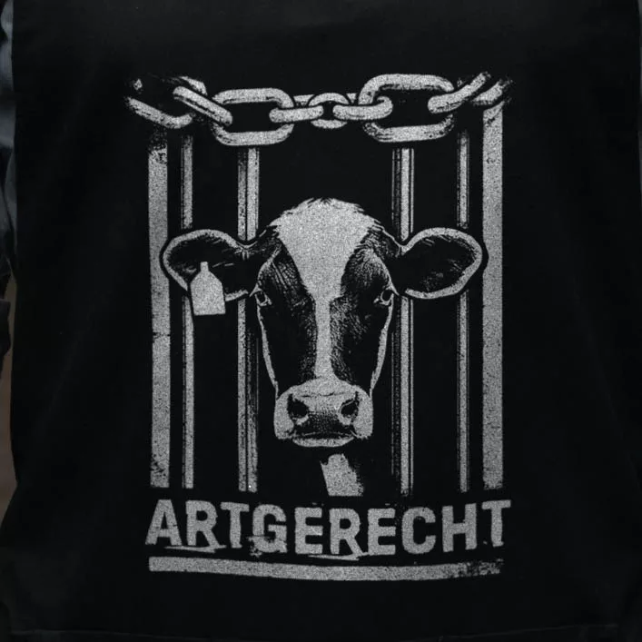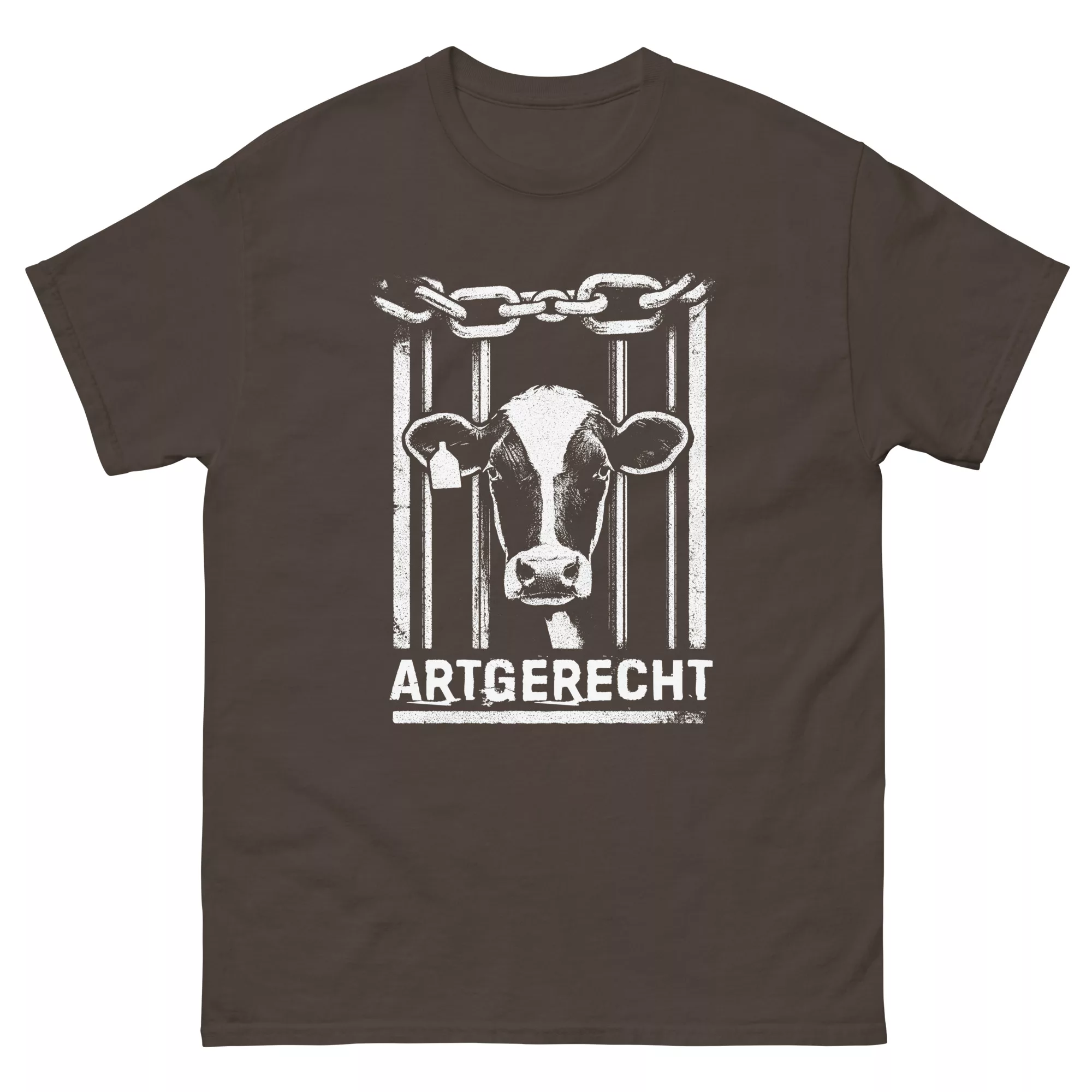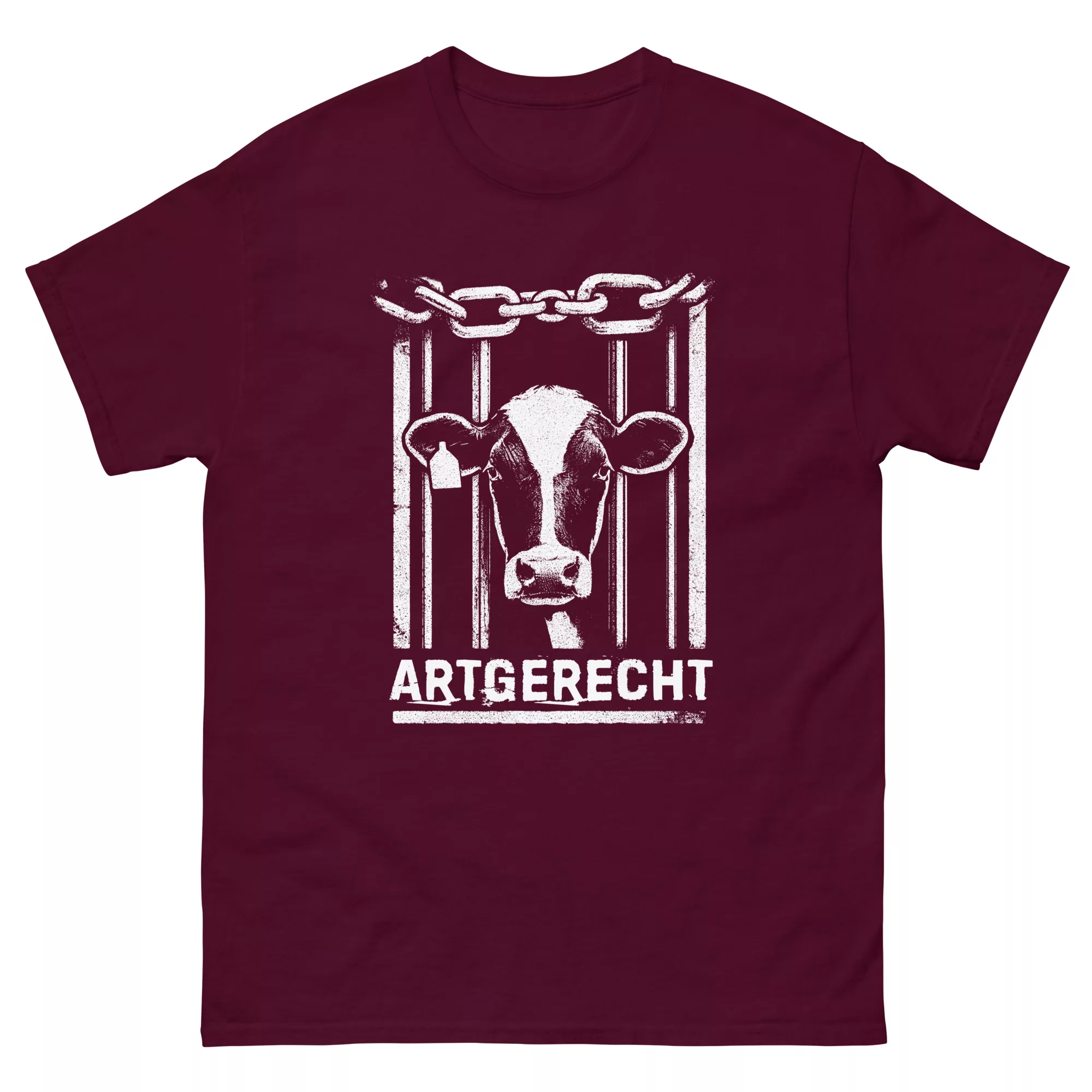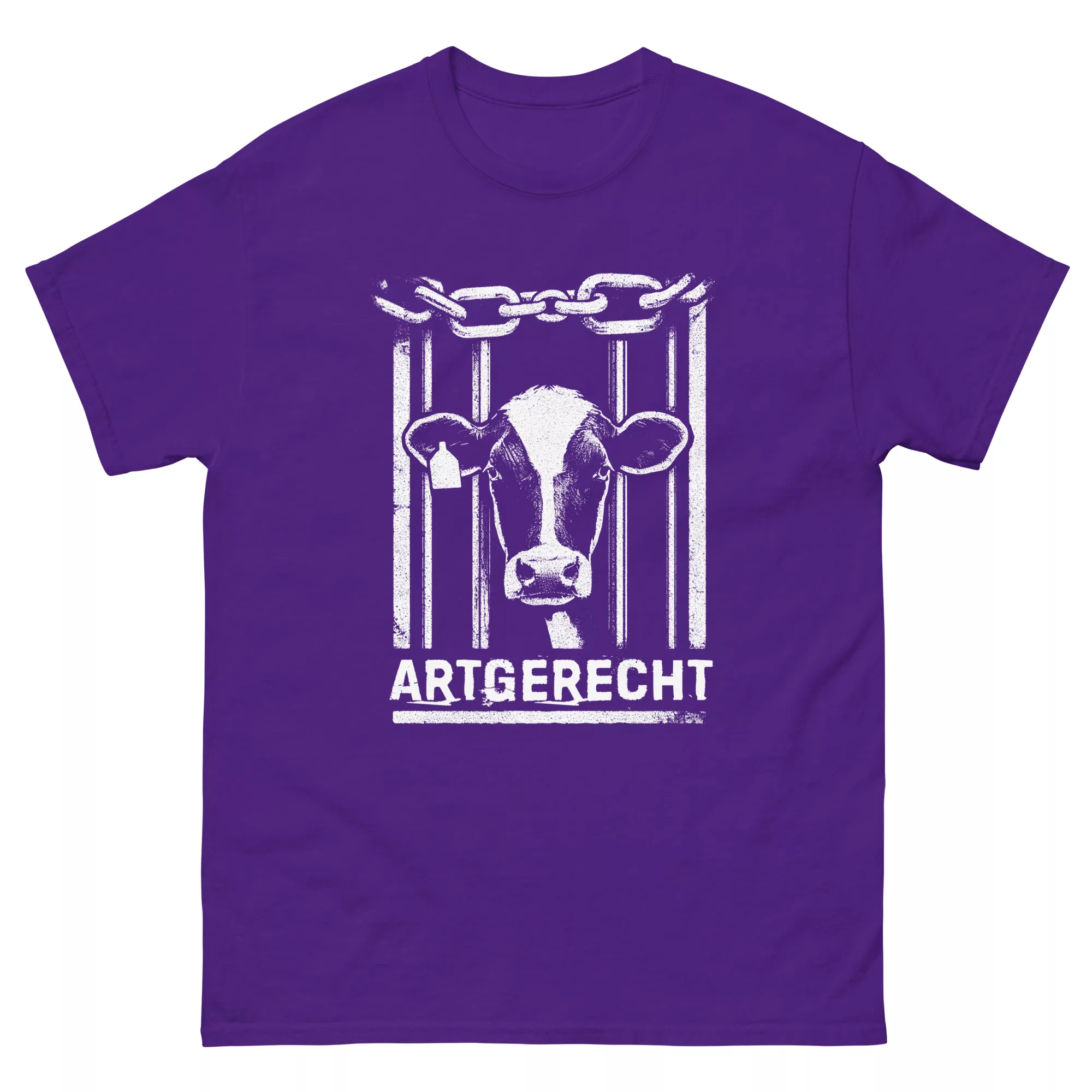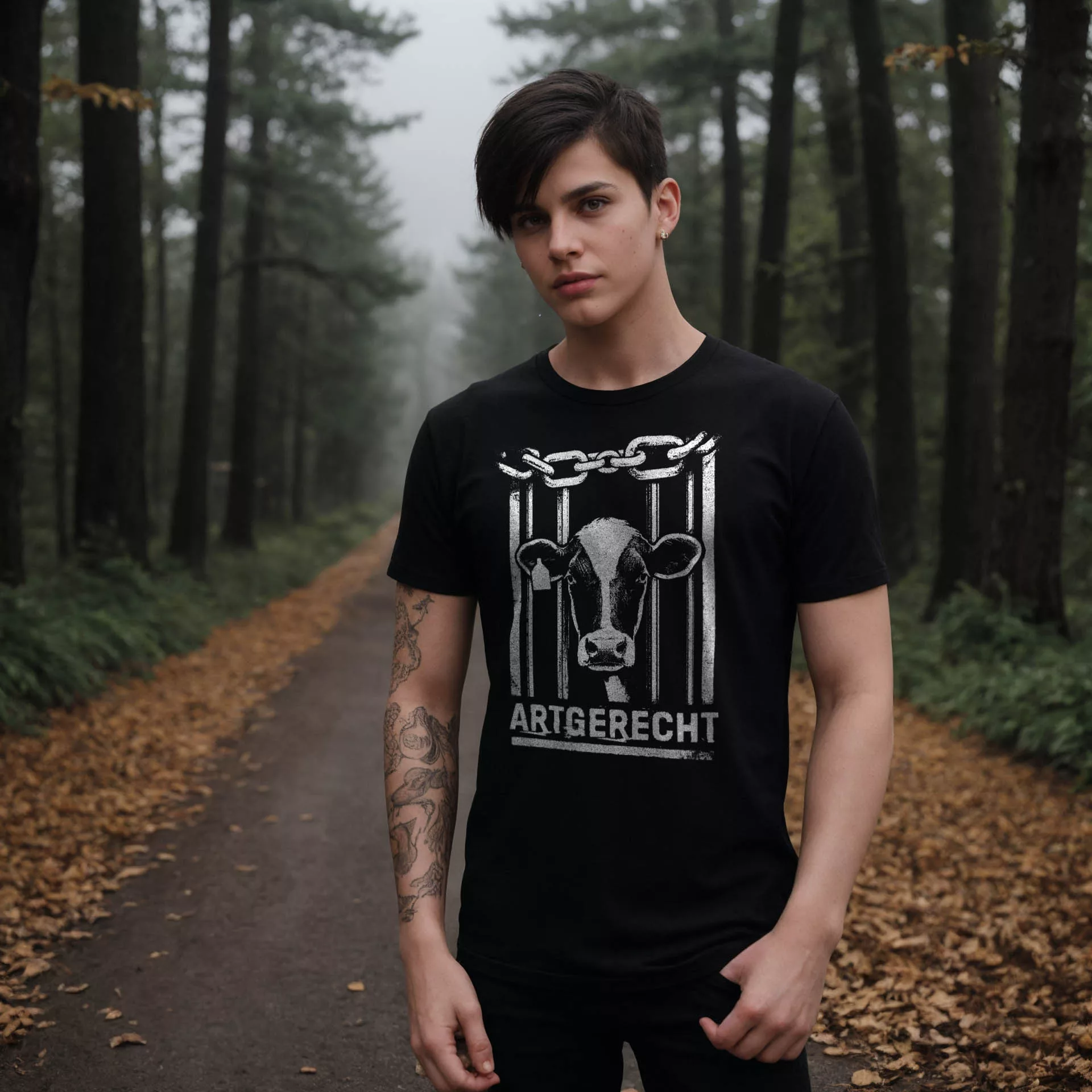 Das „Artgerecht“ Unisex T-Shirt ist ein aussagekräftiges Kleidungsstück, das ein starkes Statement gegen Massentierhaltung und für Tierrechte setzt. Das Shirt zeigt das eindrucksvolle Bild einer gefangenen Kuh hinter Gittern, was die traurige Realität der als „artgerecht“ klassifizierten Tierhaltung hervorhebt.