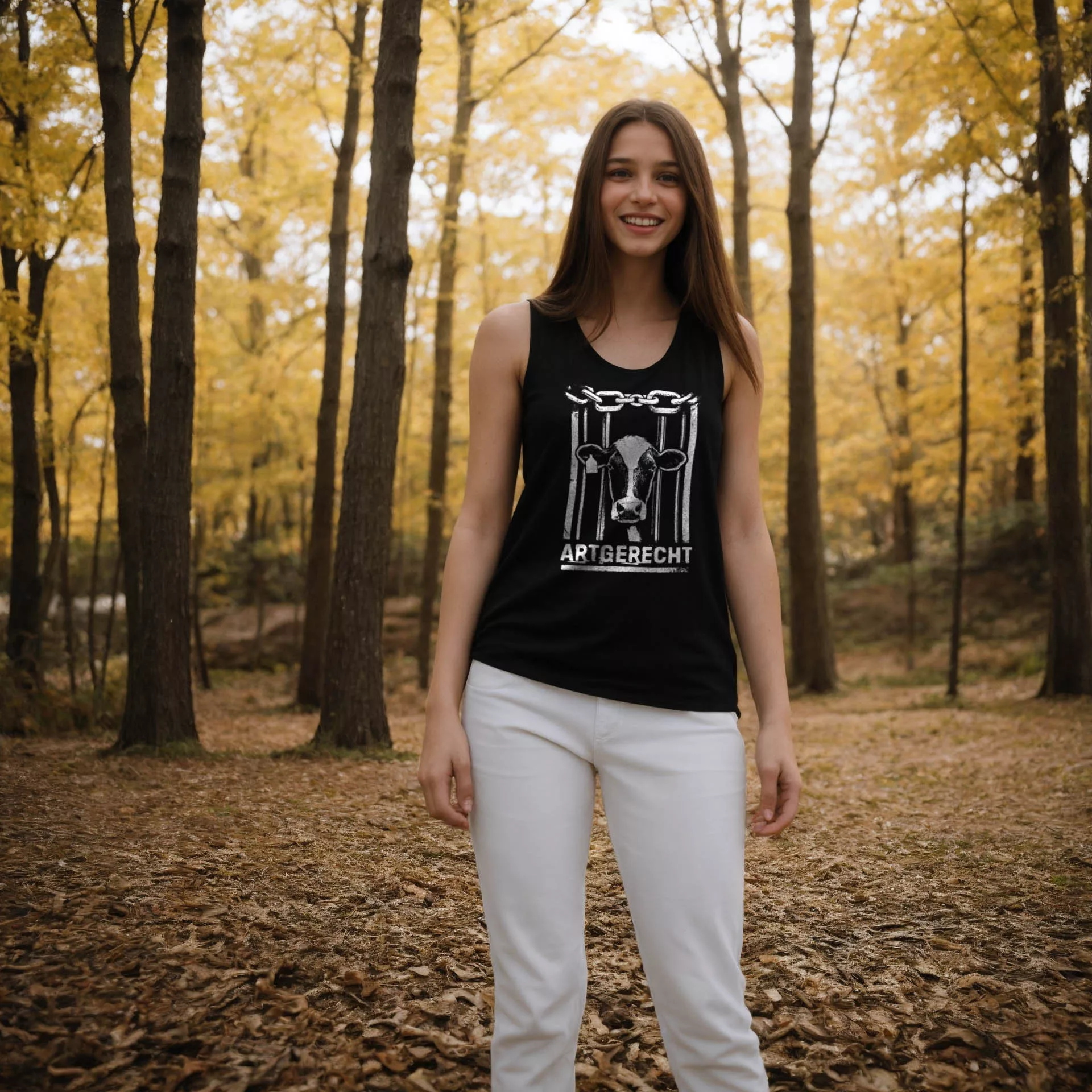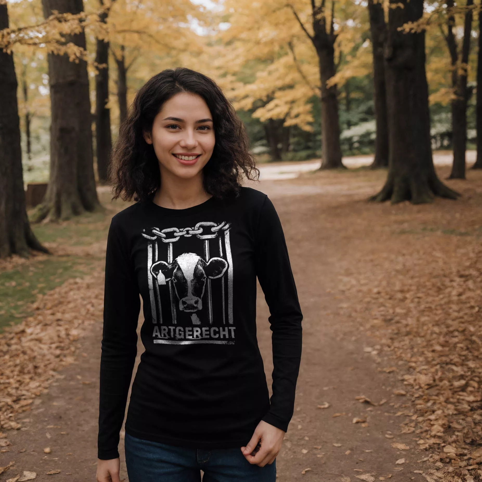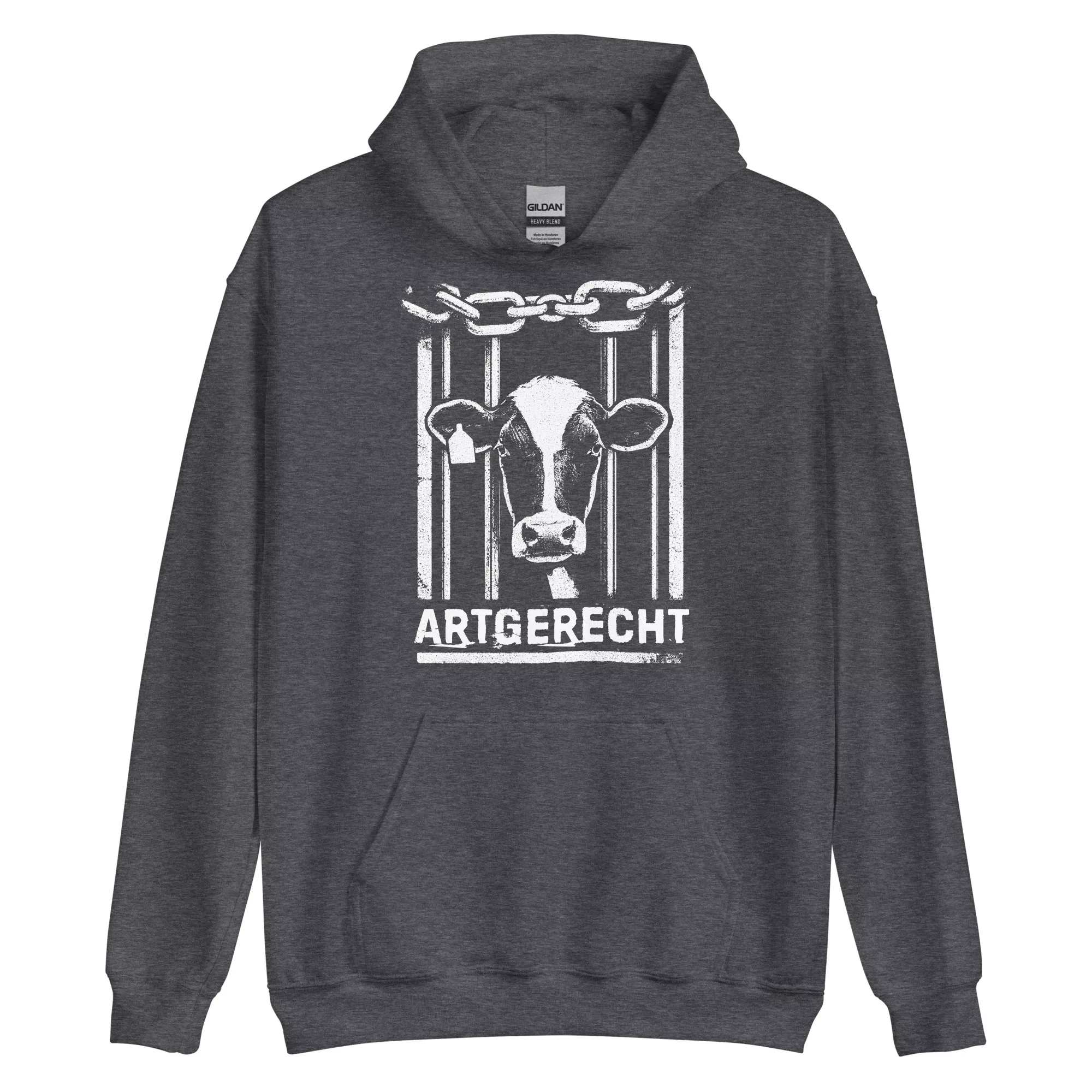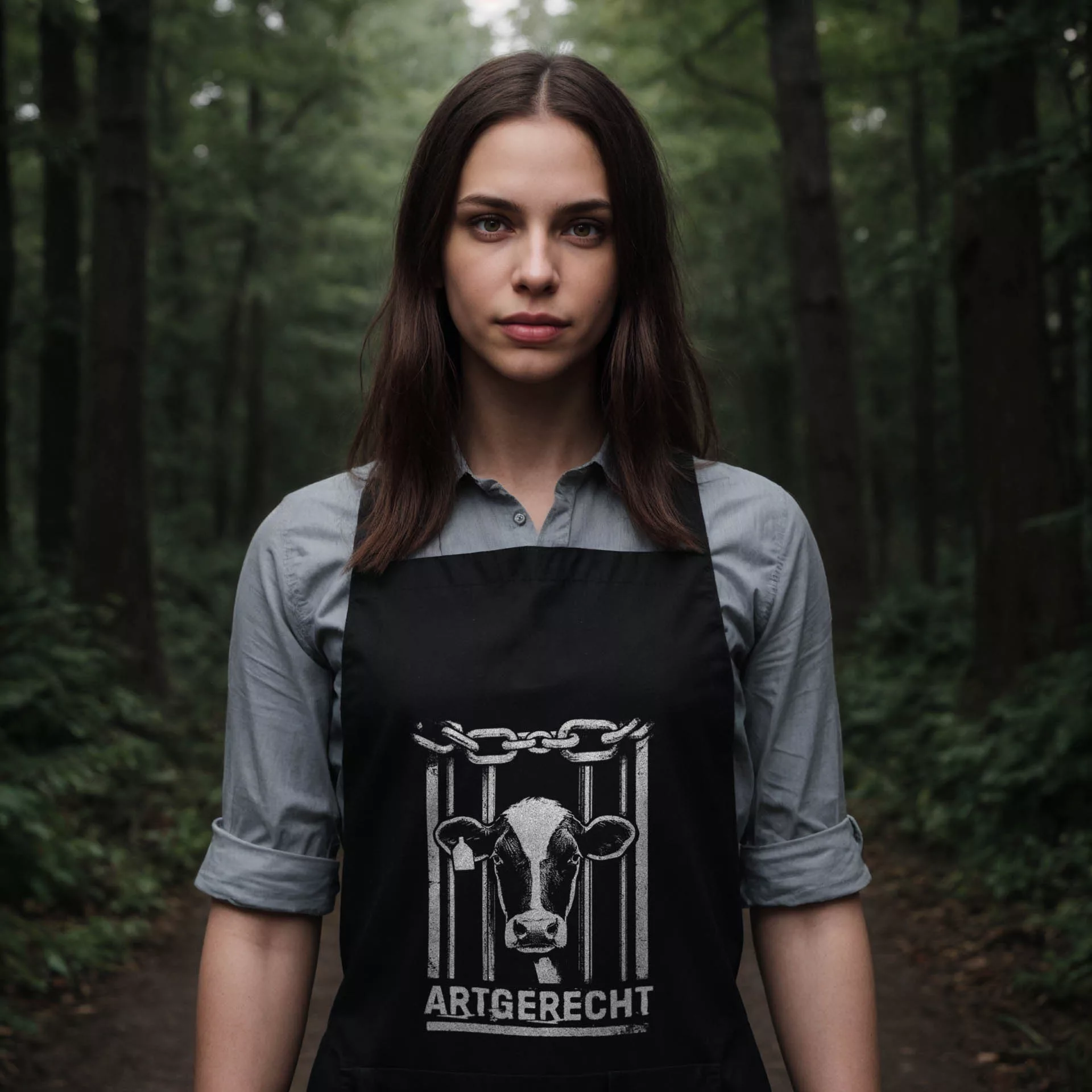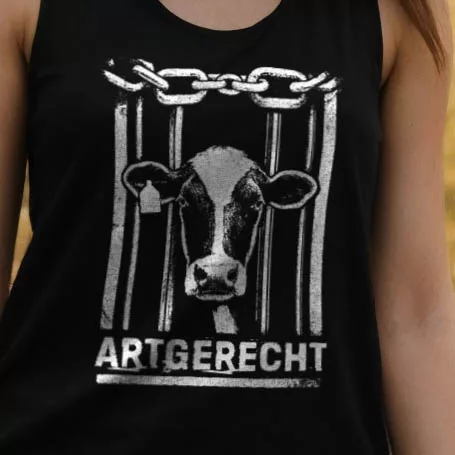 Das „Artgerecht“ Unisex T-Shirt ist ein aussagekräftiges Kleidungsstück, das ein starkes Statement gegen Massentierhaltung und für Tierrechte setzt. Das Shirt zeigt das eindrucksvolle Bild einer gefangenen Kuh hinter Gittern, was die traurige Realität der als „artgerecht“ klassifizierten Tierhaltung hervorhebt.