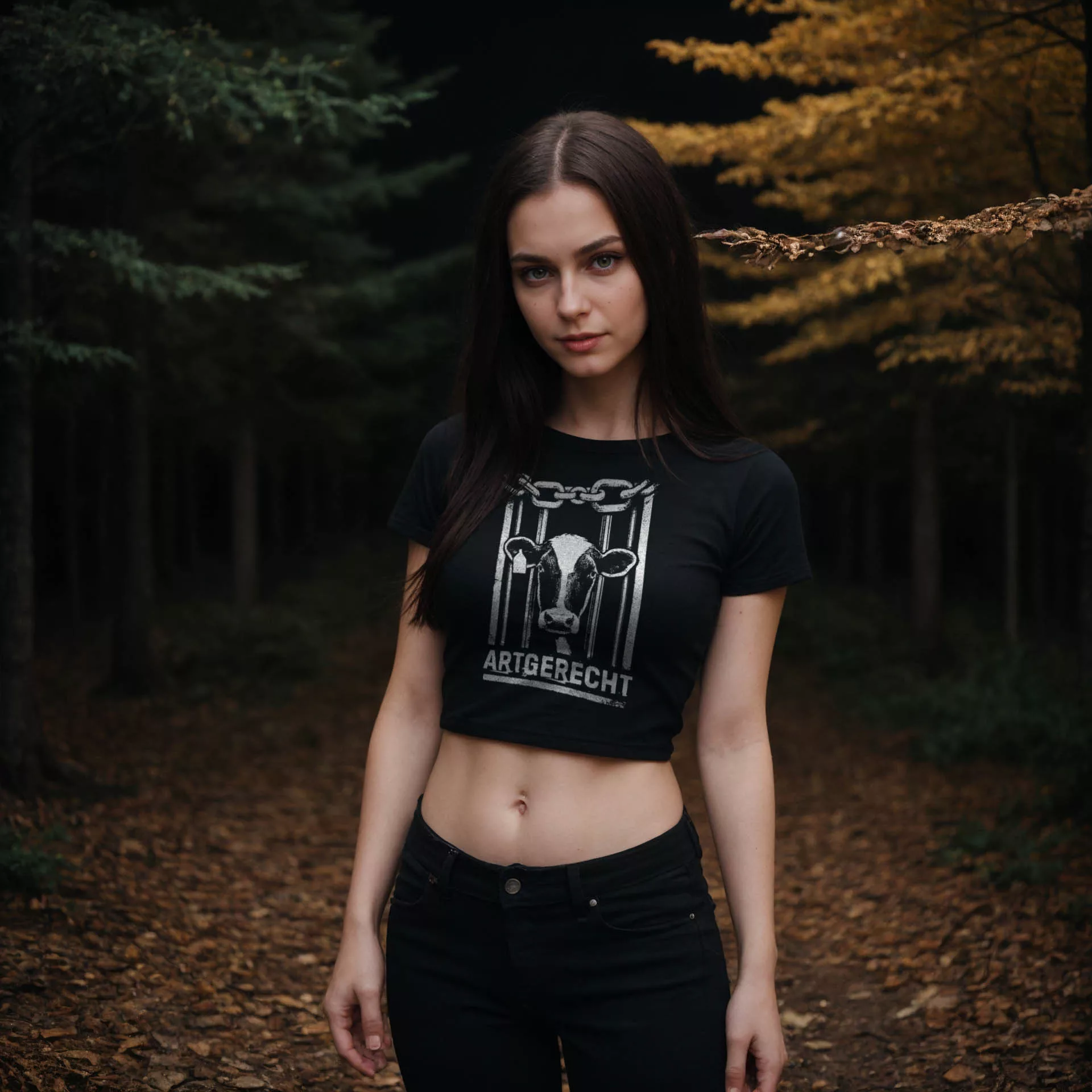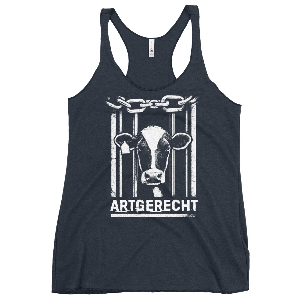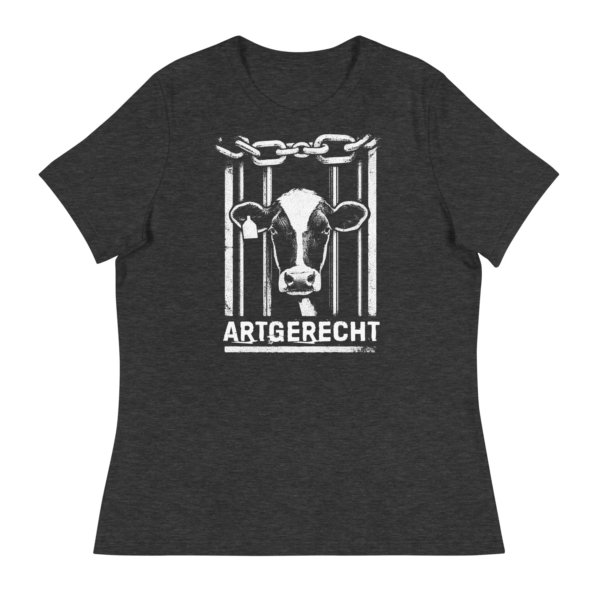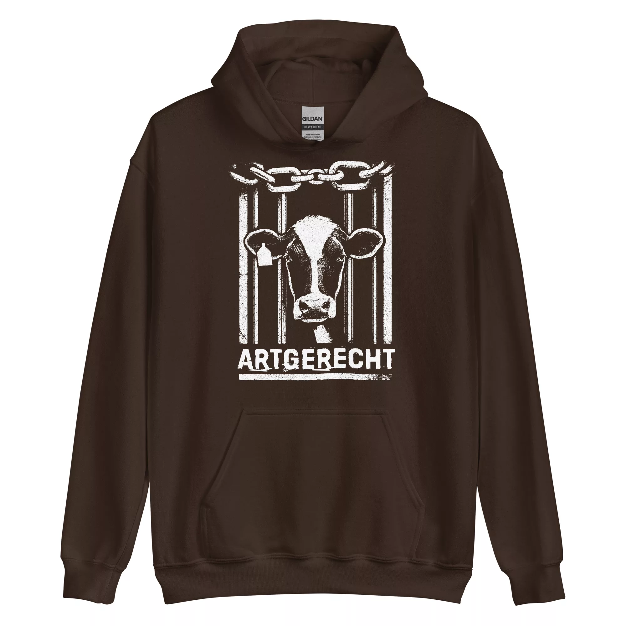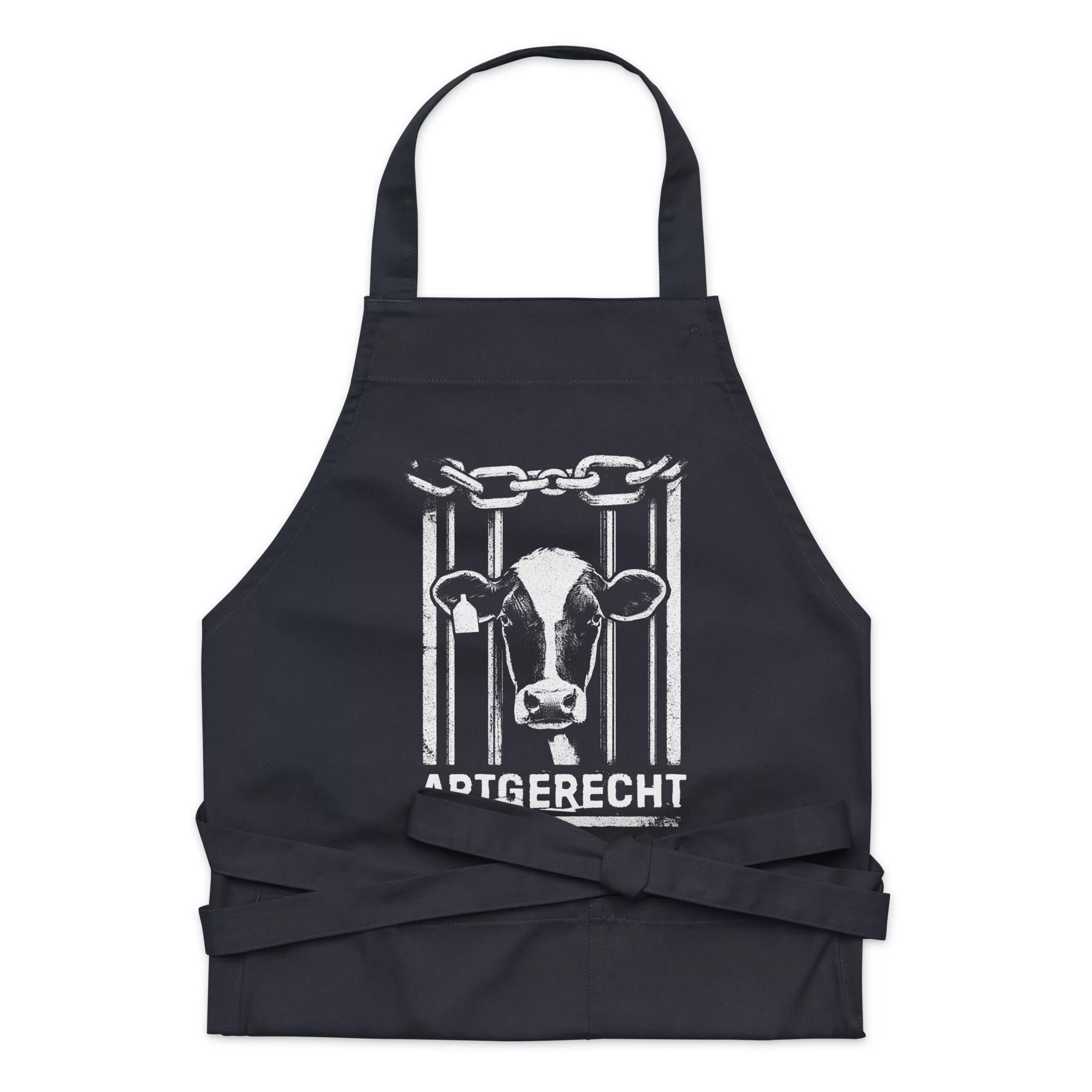 Das „Artgerecht“ Unisex T-Shirt ist ein aussagekräftiges Kleidungsstück, das ein starkes Statement gegen Massentierhaltung und für Tierrechte setzt. Das Shirt zeigt das eindrucksvolle Bild einer gefangenen Kuh hinter Gittern, was die traurige Realität der als „artgerecht“ klassifizierten Tierhaltung hervorhebt.