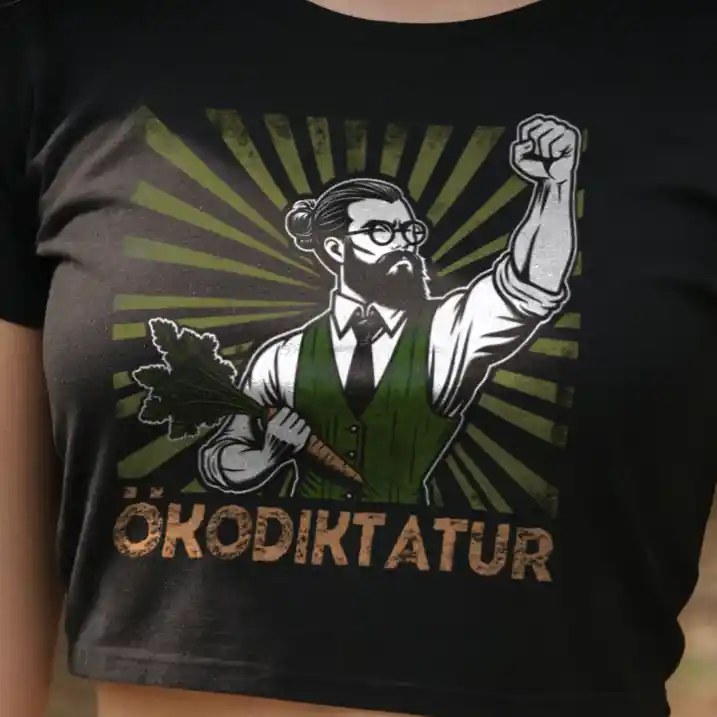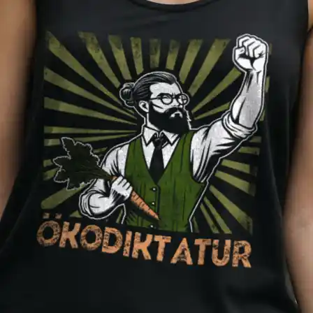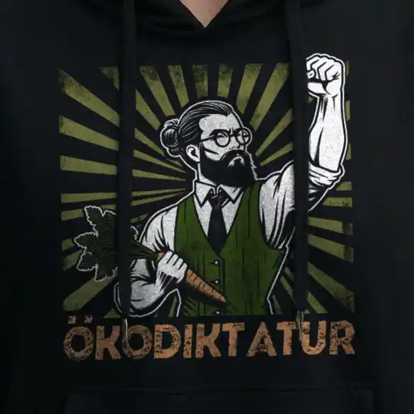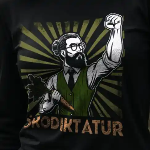 Unser „Ökodiktatur“ Unisex T-Shirt verbindet humorvolle Provokation mit einem wichtigen Anliegen. Inspiriert von der Ästhetik von Propaganda-Postern, präsentiert es einen Veganer, der eine Karotte hochhält, in einer Pose, die Stärke und Entschlossenheit symbolisiert. Der Schriftzug „Ökodiktatur“ unter diesem Bild lädt zur Auseinandersetzung mit der Kritik an umweltbewusstem Verhalten ein und fordert dazu auf, über die Bedeutung von Nachhaltigkeit und Umweltschutz zu reflektieren.