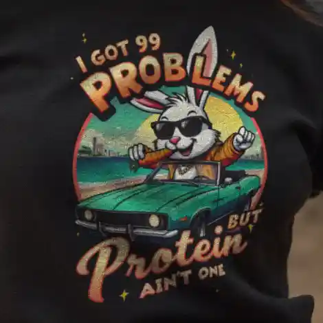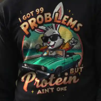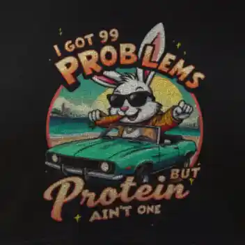 Das „99 Problems“ Unisex T-Shirt vereint lässigen Humor mit einer starken Botschaft. Das Design zeigt einen coolen Gangsta-Hasen, der entspannt in seiner Luxuskarre an Miami Beach entlangfährt und dabei eine Karotte wie eine Zigarre genießt. Der freche Spruch „I got 99 Problems but Protein ain’t one“ bringt es auf den Punkt: Veganer*innen brauchen sich keine Sorgen um Proteine oder Nährstoffe zu machen – sie haben es einfach drauf.