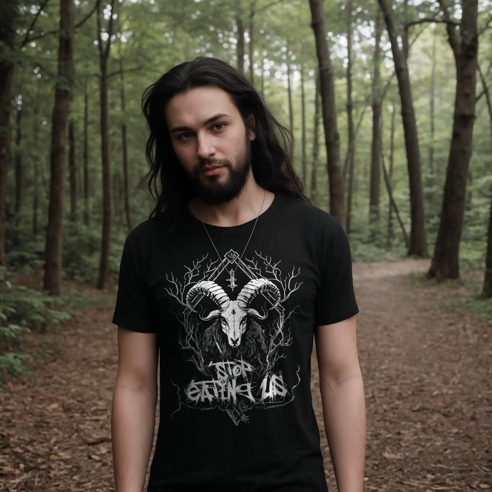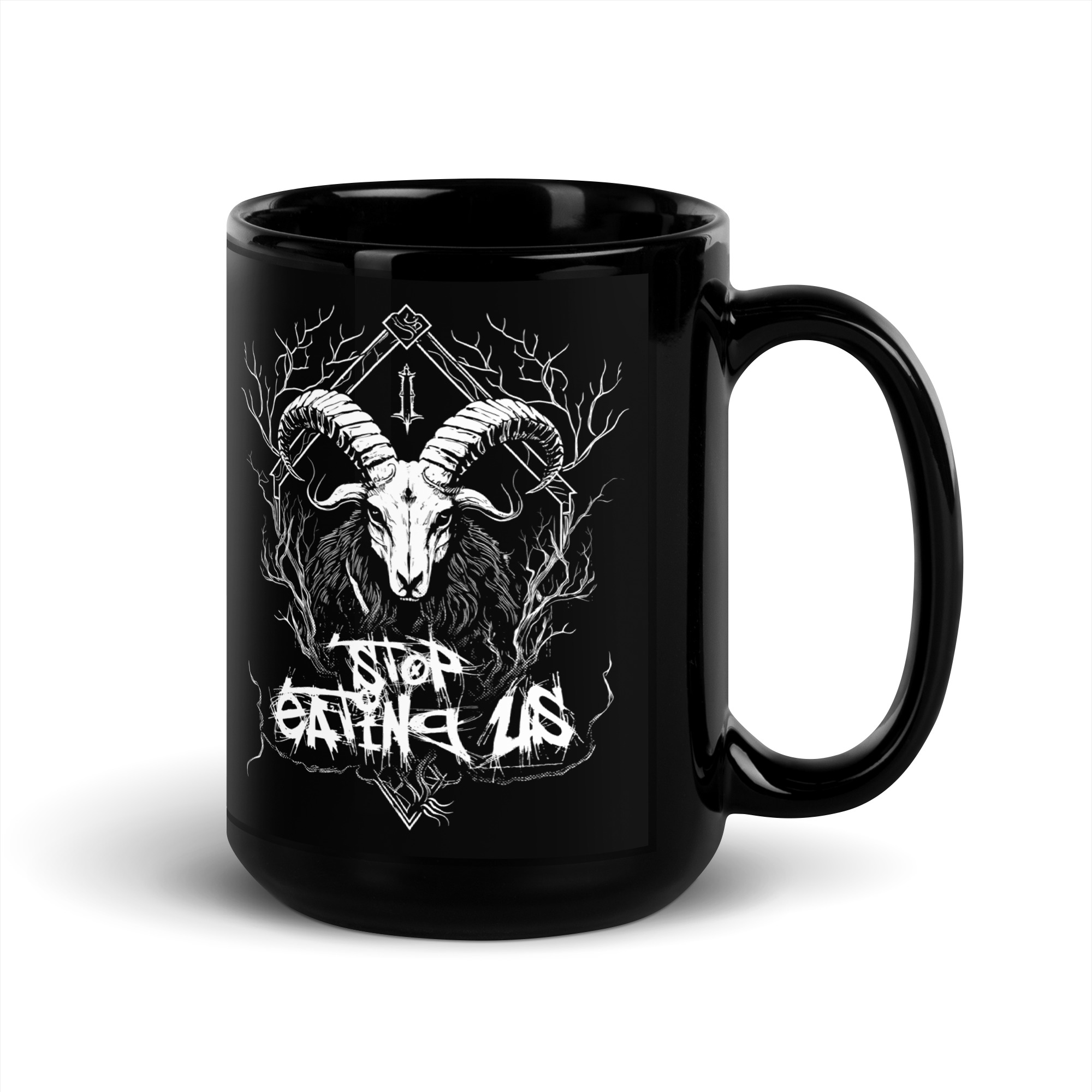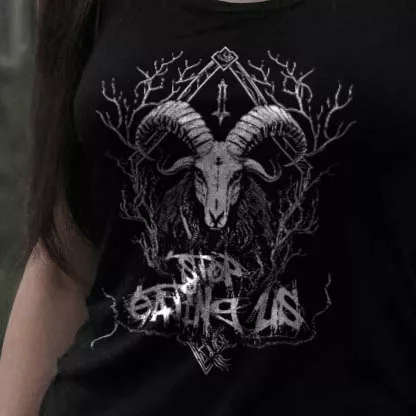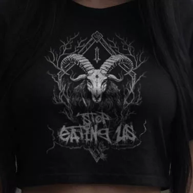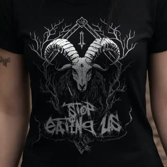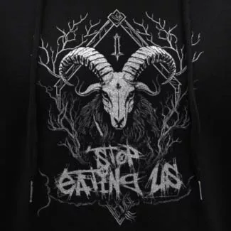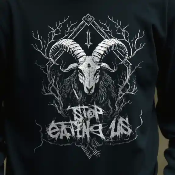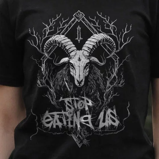 Dein Blick wird sofort von der majestätischen Ziege angezogen, die mit finsterem Ausdruck aus dem tiefen Schwarz des Hintergrunds hervorragt. Die weiße Grafik hebt sich kontrastreich ab und zieht die Aufmerksamkeit auf sich. Im Hintergrund verschmelzen Äste und Verzweigungen zu einem mysteriösen Geflecht, das eine Aura von Dunkelheit und Geheimnis verströmt. Doch das Herzstück des Designs ist der Schriftzug “Stop Eating Us”, der in einer Schriftart geschrieben ist, die an die unheilvolle Ästhetik des Black Metal erinnert.