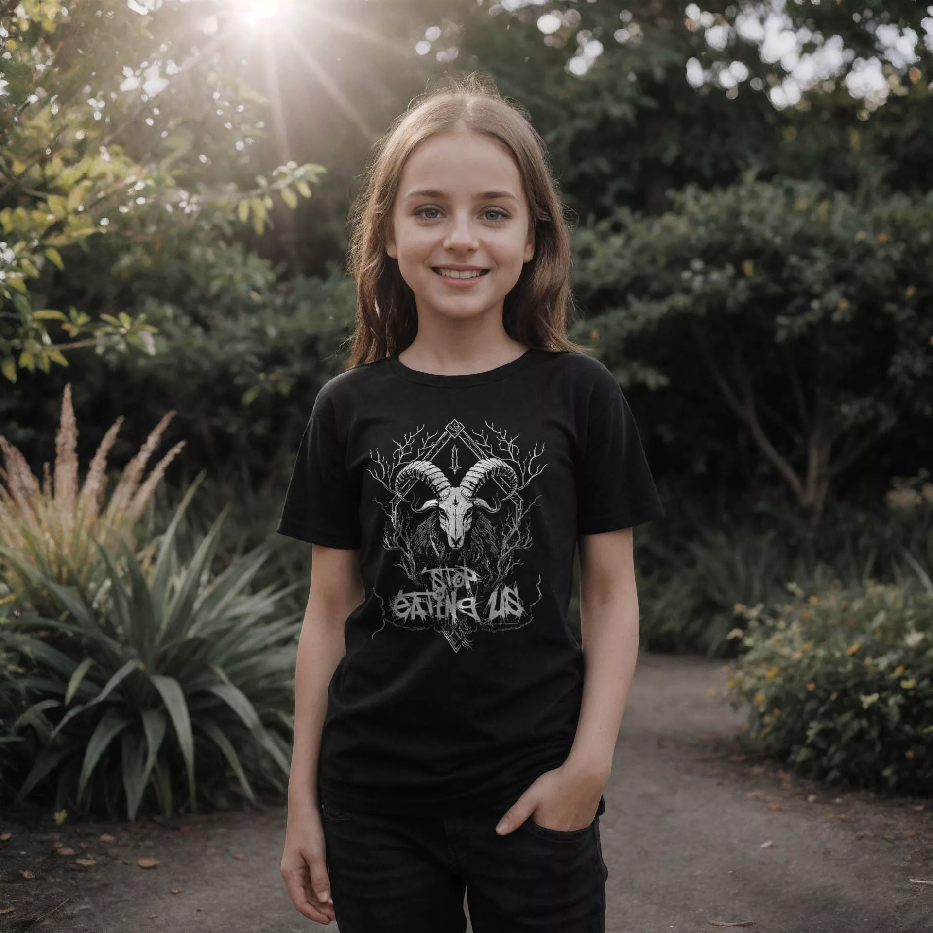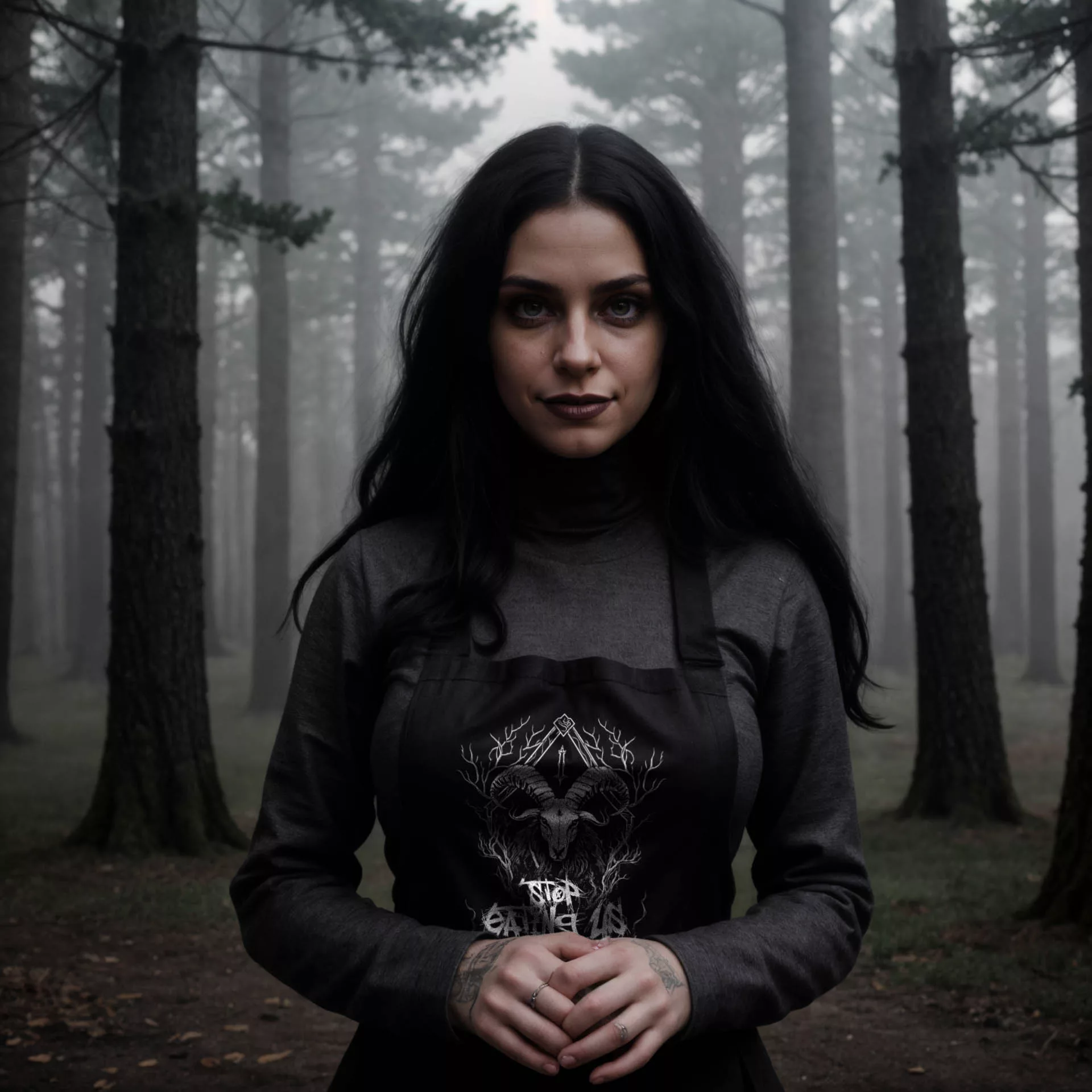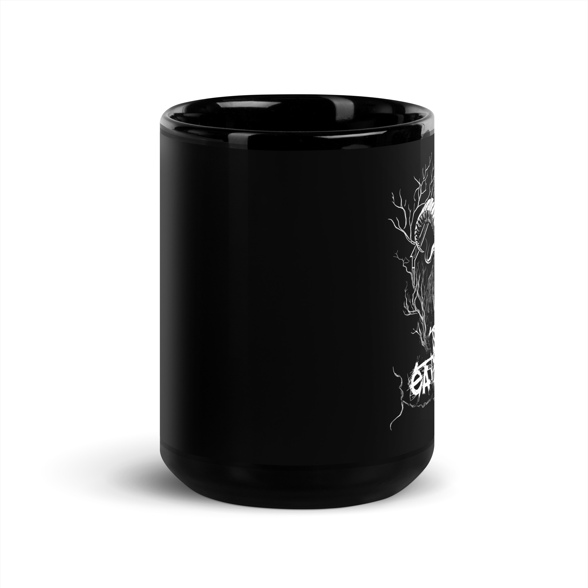 Dein Blick wird sofort von der majestätischen Ziege angezogen, die mit finsterem Ausdruck aus dem tiefen Schwarz des Hintergrunds hervorragt. Die weiße Grafik hebt sich kontrastreich ab und zieht die Aufmerksamkeit auf sich. Im Hintergrund verschmelzen Äste und Verzweigungen zu einem mysteriösen Geflecht, das eine Aura von Dunkelheit und Geheimnis verströmt. Doch das Herzstück des Designs ist der Schriftzug “Stop Eating Us”, der in einer Schriftart geschrieben ist, die an die unheilvolle Ästhetik des Black Metal erinnert.