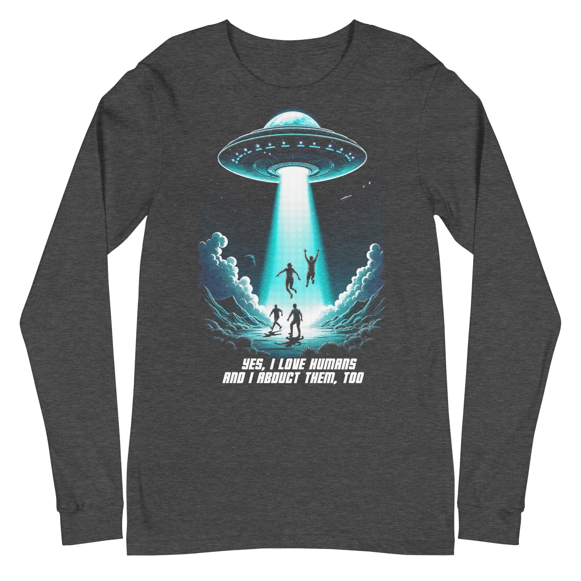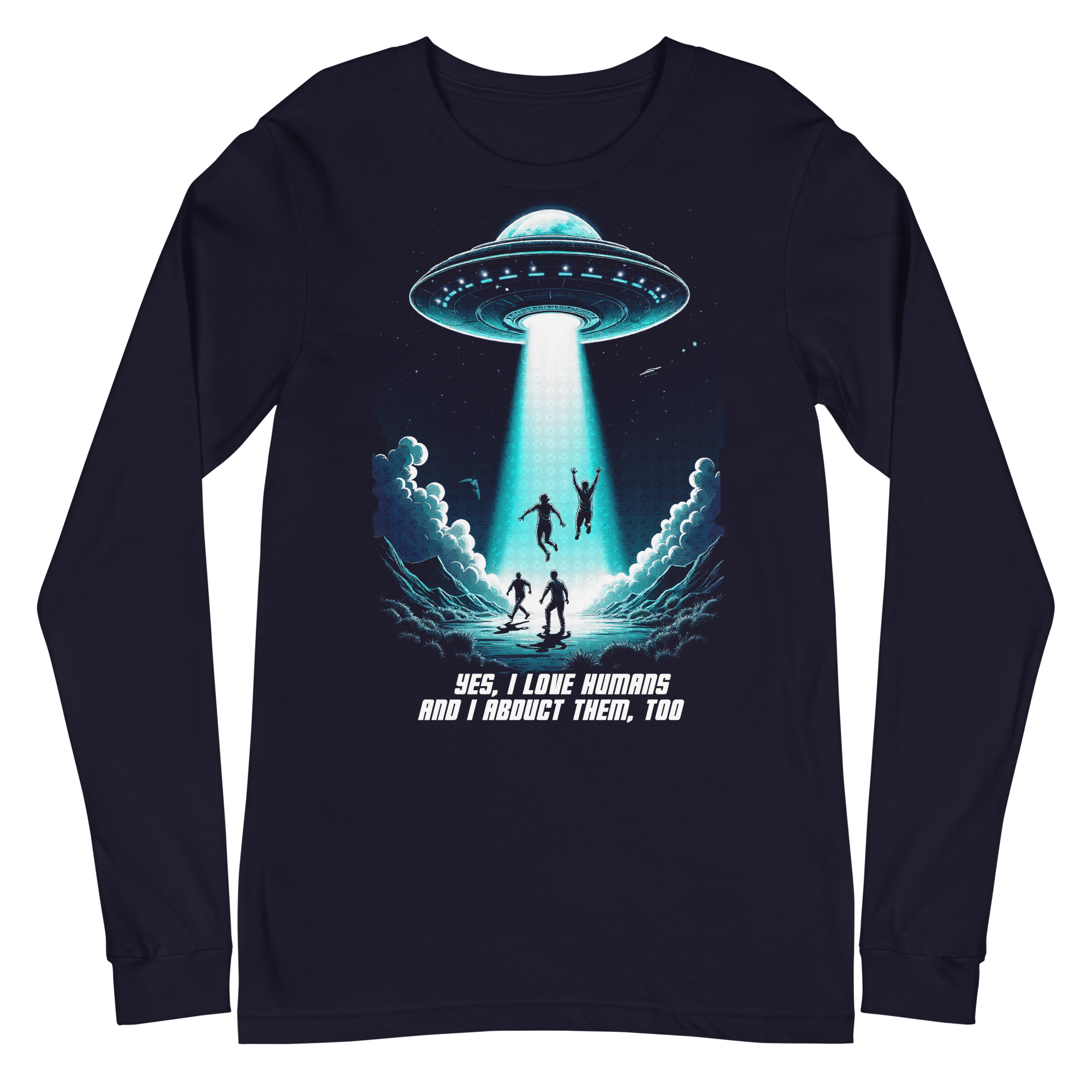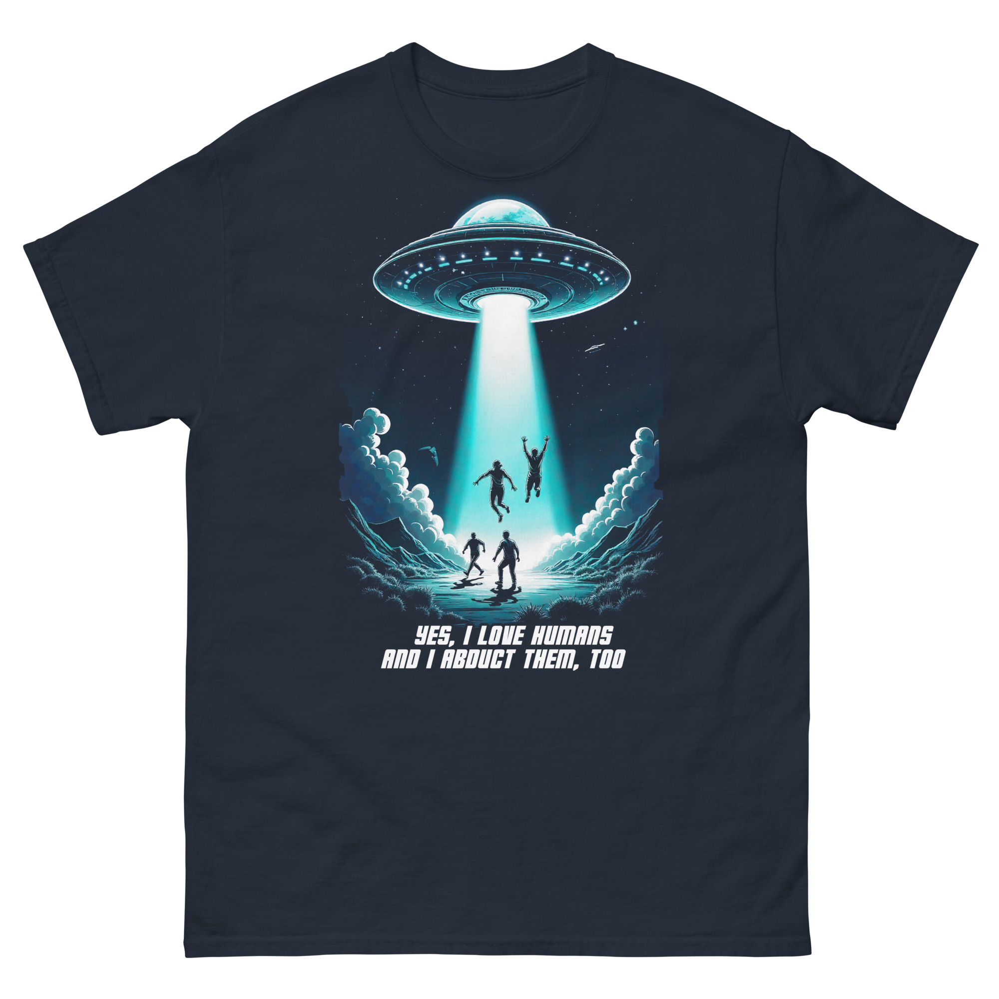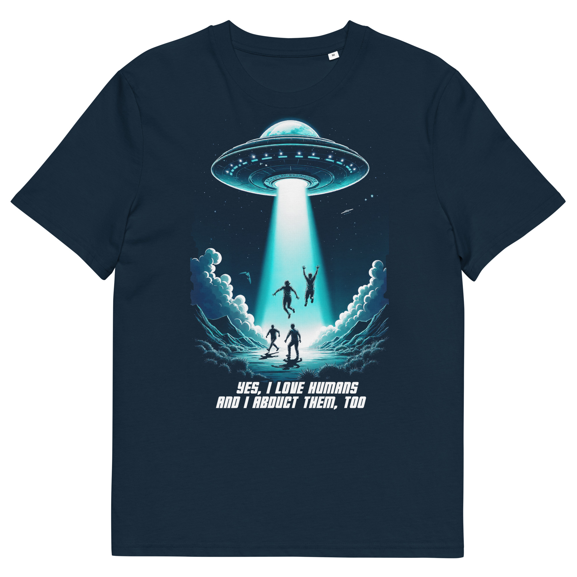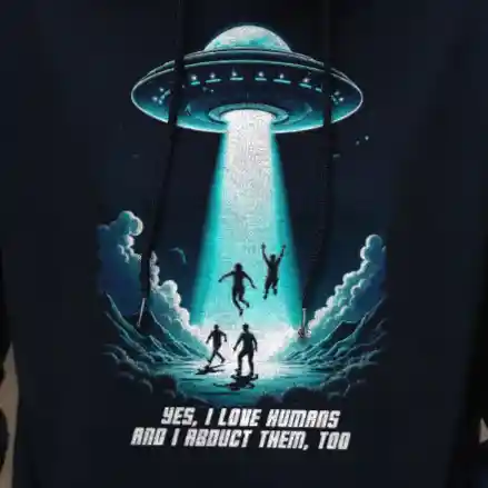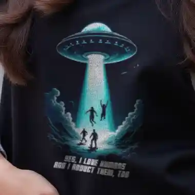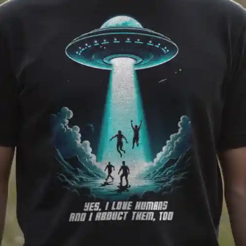 Das Unisex T-Shirt „Abduction“ kombiniert ein auffälliges Sci-Fi-Design mit einer tiefgründigen Botschaft. Das Motiv zeigt ein UFO, das in der Nacht mehrere Menschen entführt, begleitet von der ironischen Aufschrift „Yes, I love humans and I abduct them, too“. Diese humorvolle Darstellung zieht eine Parallele zur oft widersprüchlichen Aussage „Ich liebe Tiere und esse sie“ und regt zum Nachdenken über unseren Umgang mit Tieren an.