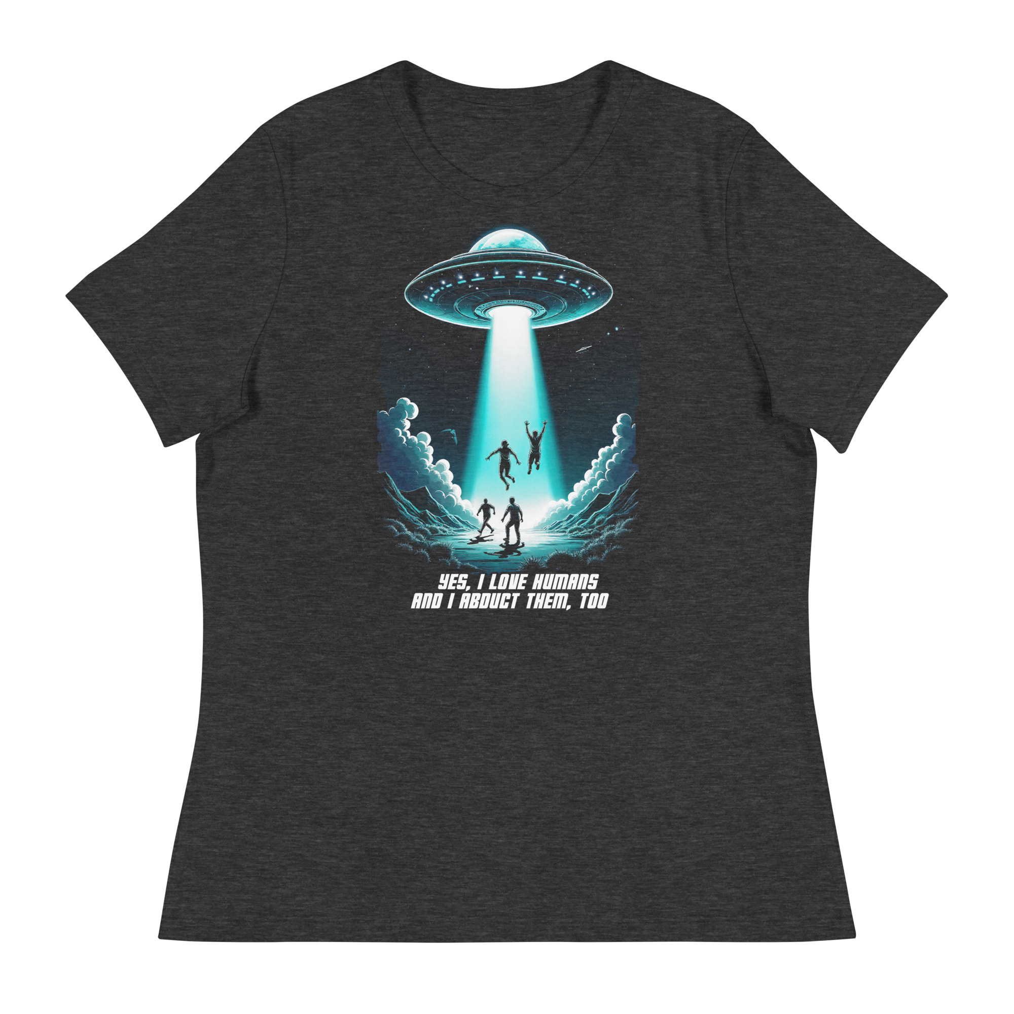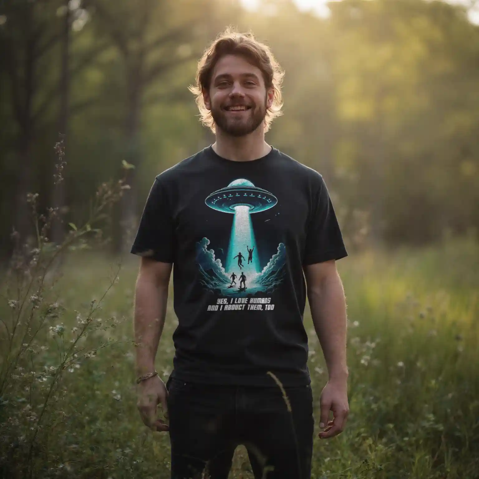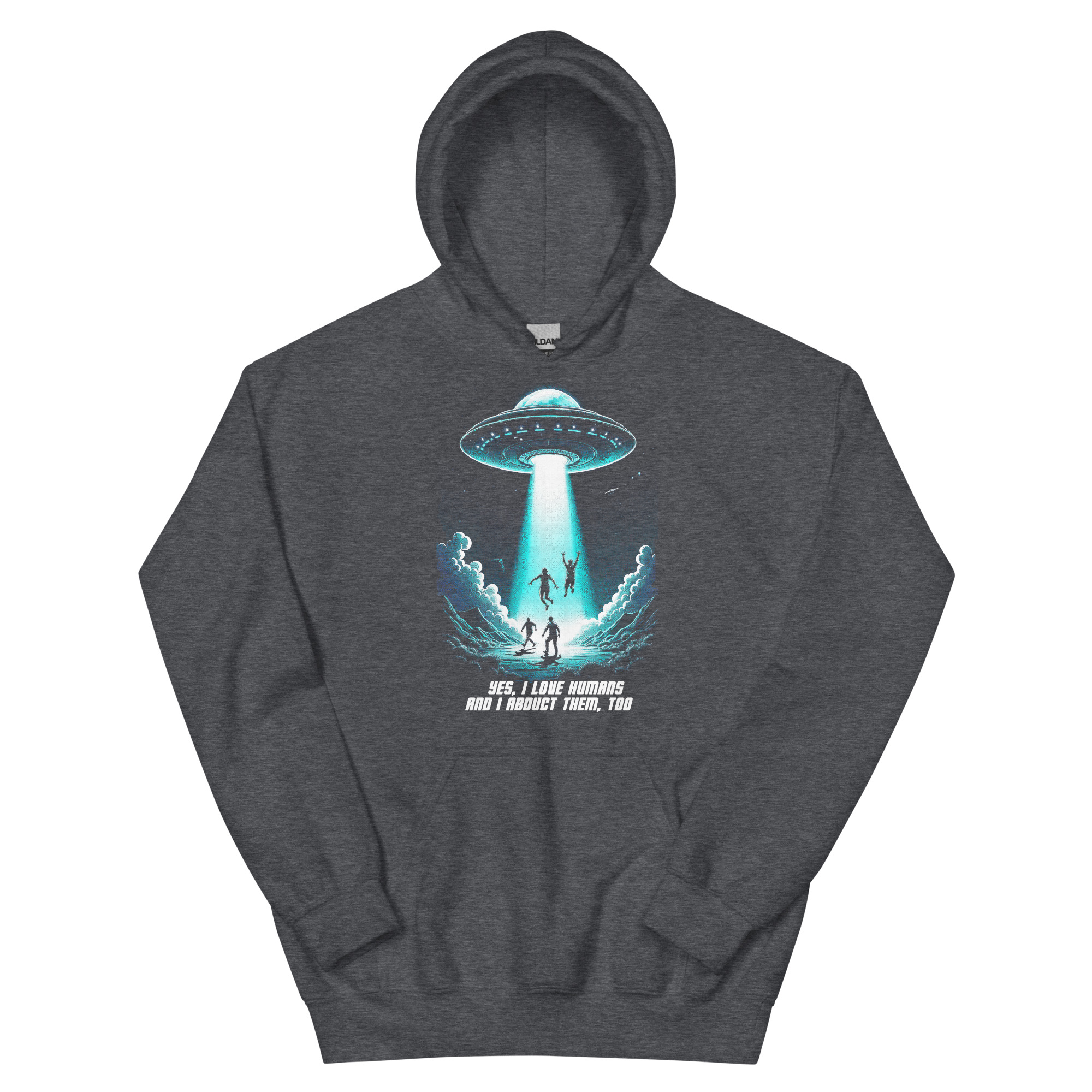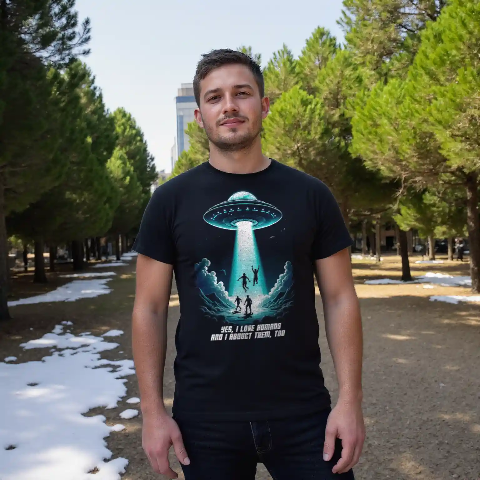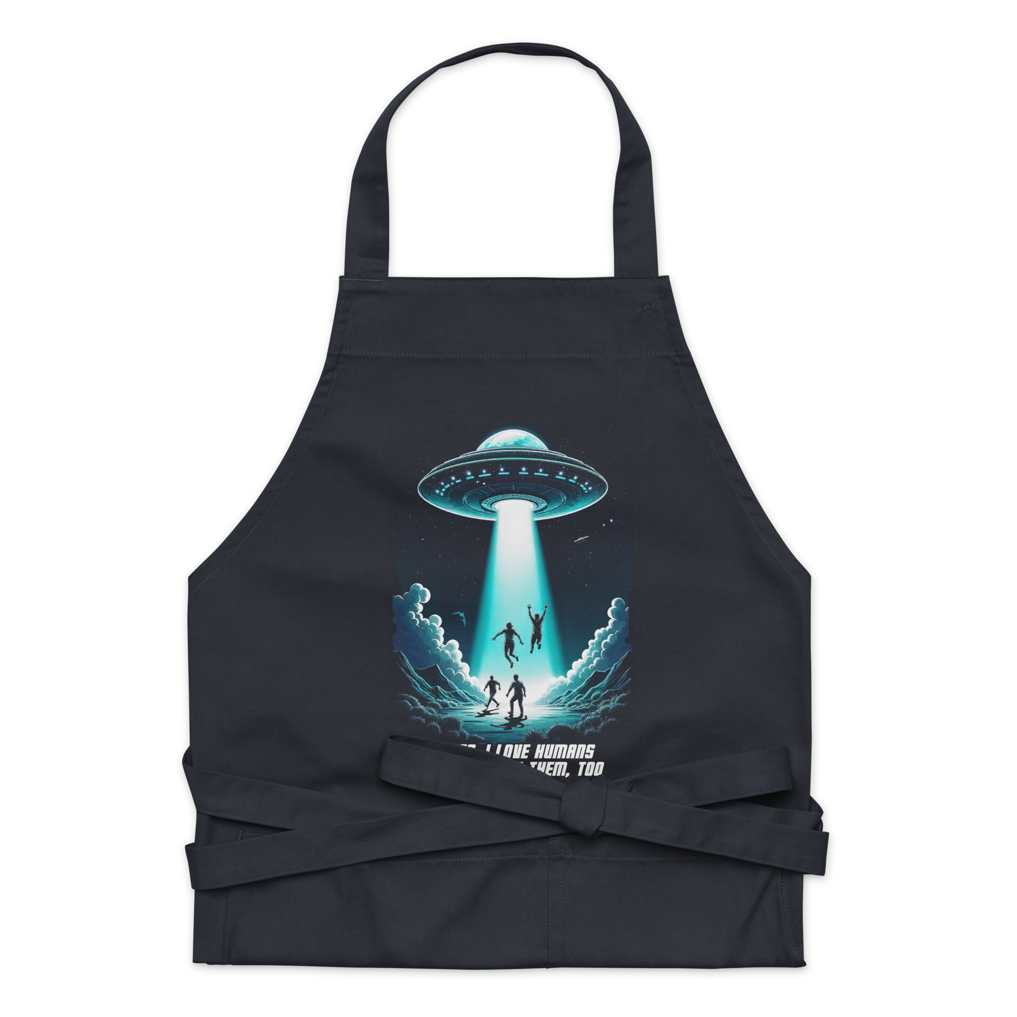 Das Unisex T-Shirt „Abduction“ kombiniert ein auffälliges Sci-Fi-Design mit einer tiefgründigen Botschaft. Das Motiv zeigt ein UFO, das in der Nacht mehrere Menschen entführt, begleitet von der ironischen Aufschrift „Yes, I love humans and I abduct them, too“. Diese humorvolle Darstellung zieht eine Parallele zur oft widersprüchlichen Aussage „Ich liebe Tiere und esse sie“ und regt zum Nachdenken über unseren Umgang mit Tieren an.