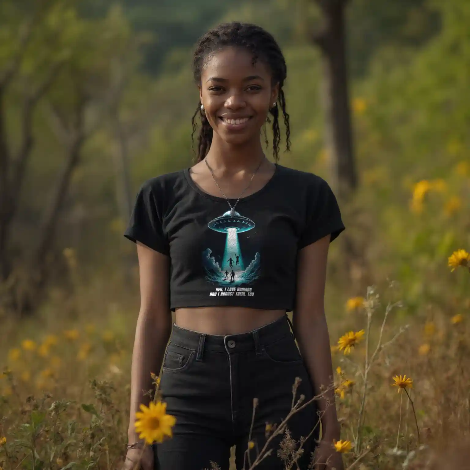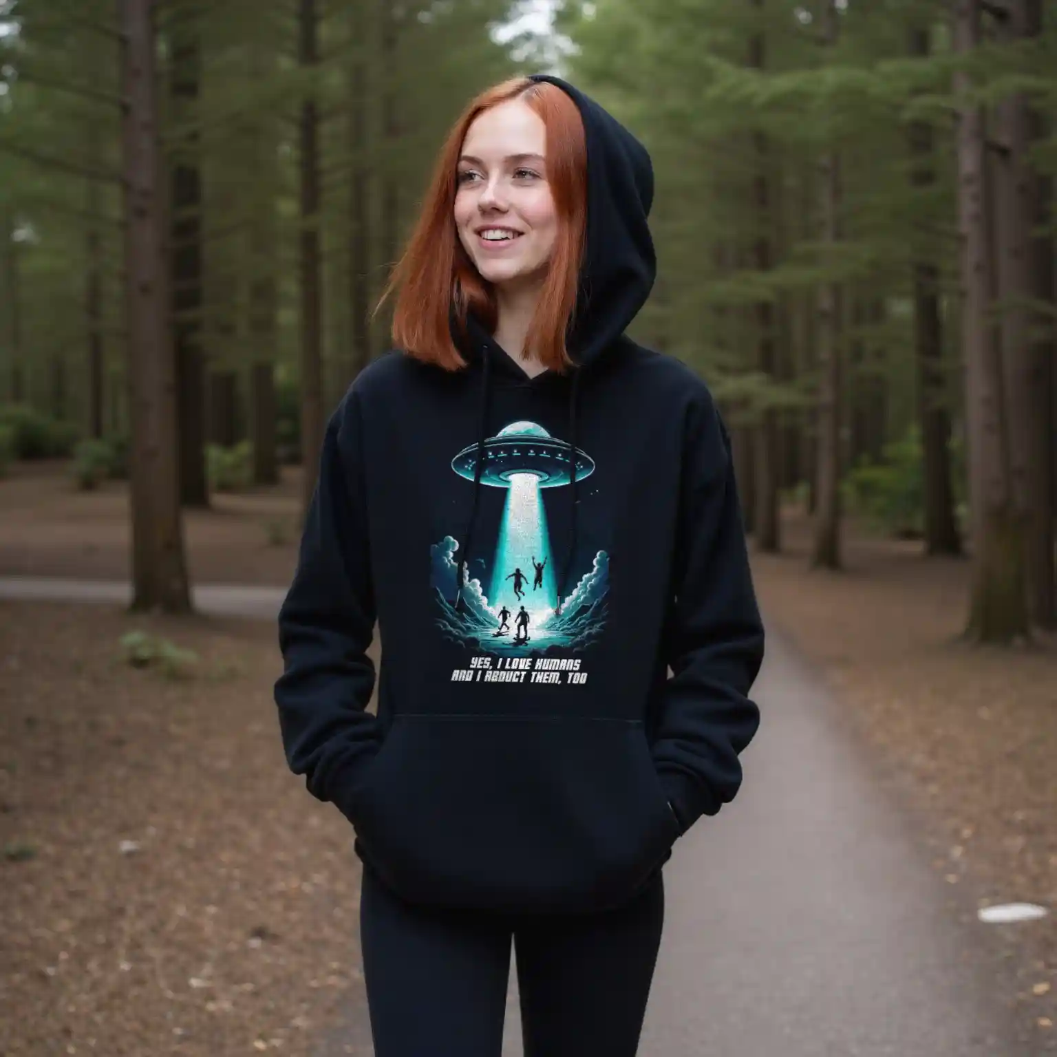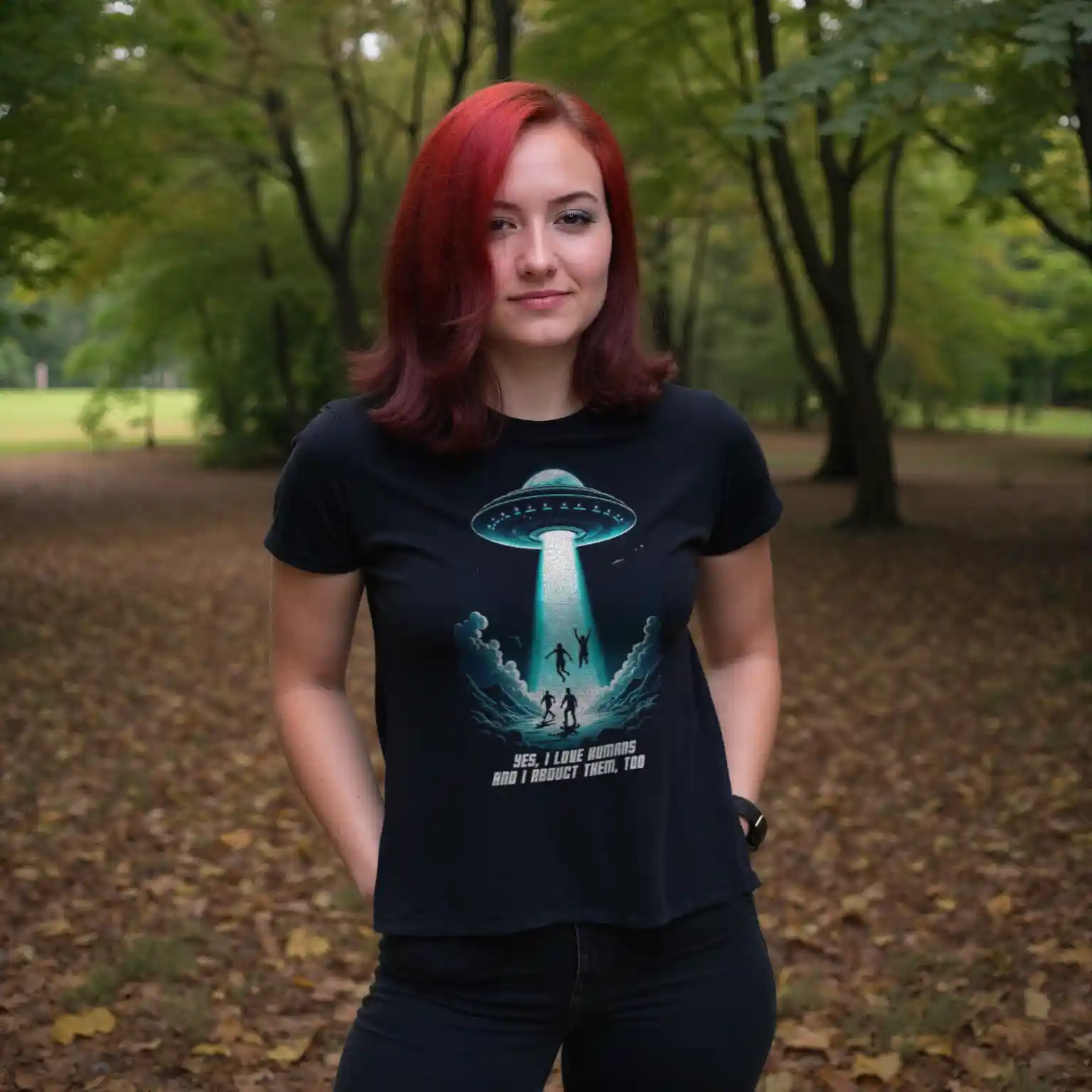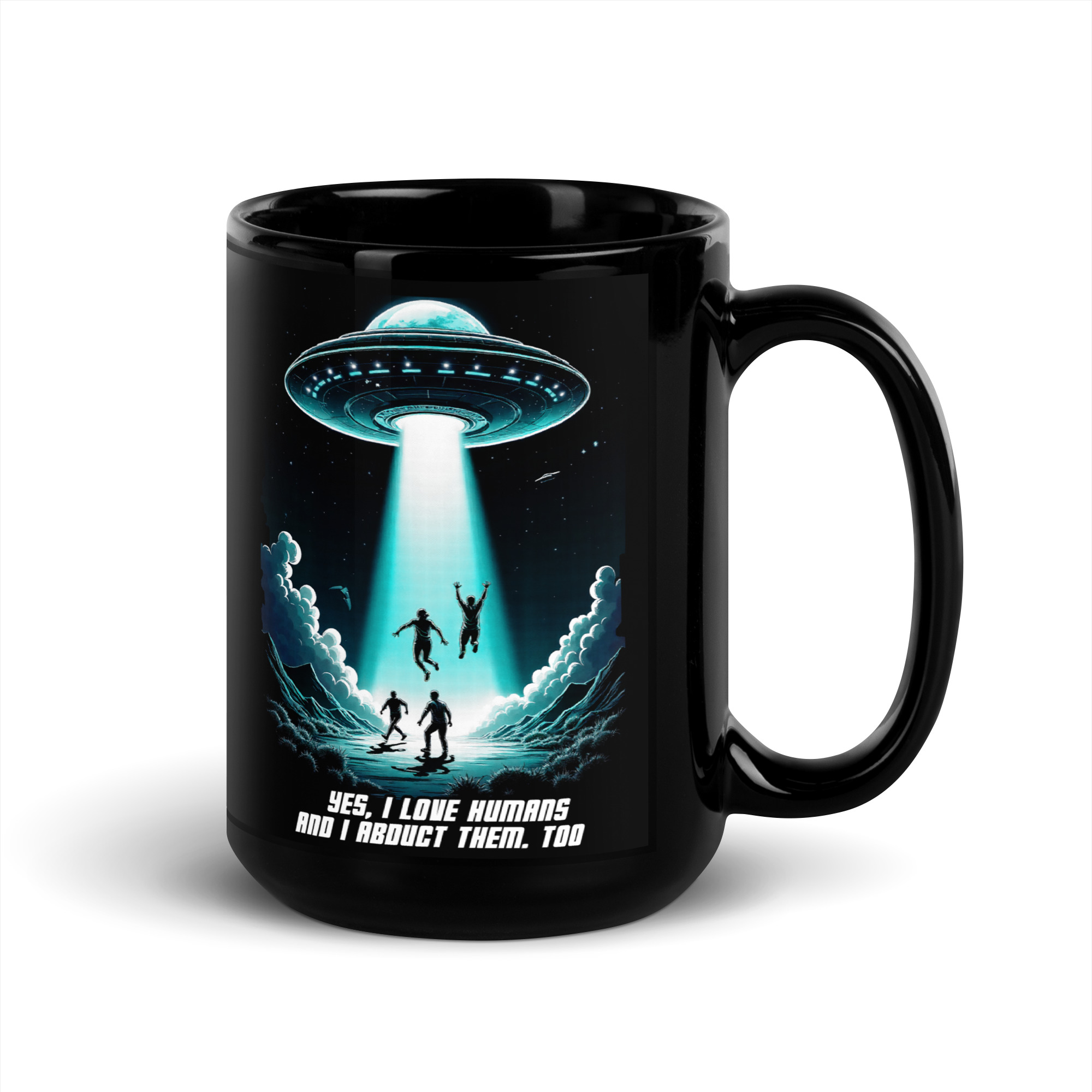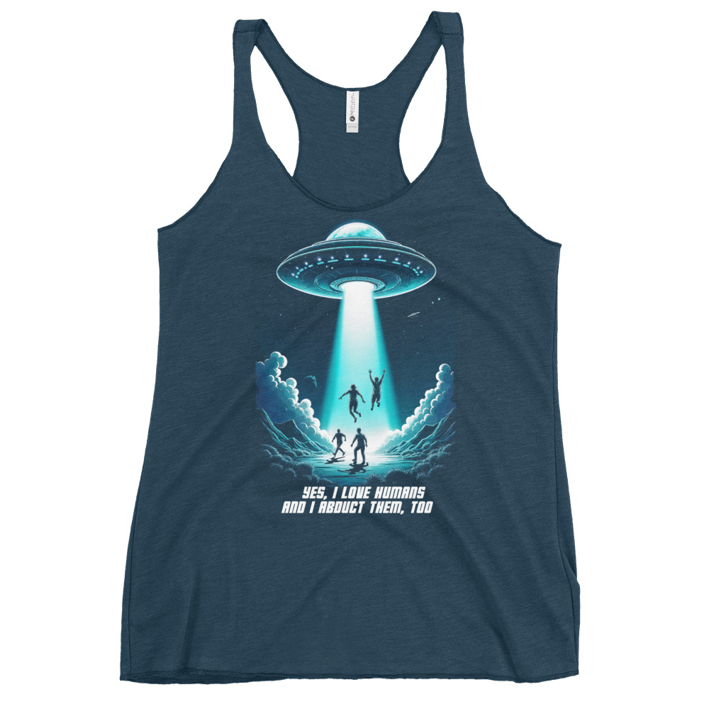 Das Unisex T-Shirt „Abduction“ kombiniert ein auffälliges Sci-Fi-Design mit einer tiefgründigen Botschaft. Das Motiv zeigt ein UFO, das in der Nacht mehrere Menschen entführt, begleitet von der ironischen Aufschrift „Yes, I love humans and I abduct them, too“. Diese humorvolle Darstellung zieht eine Parallele zur oft widersprüchlichen Aussage „Ich liebe Tiere und esse sie“ und regt zum Nachdenken über unseren Umgang mit Tieren an.